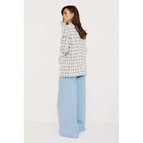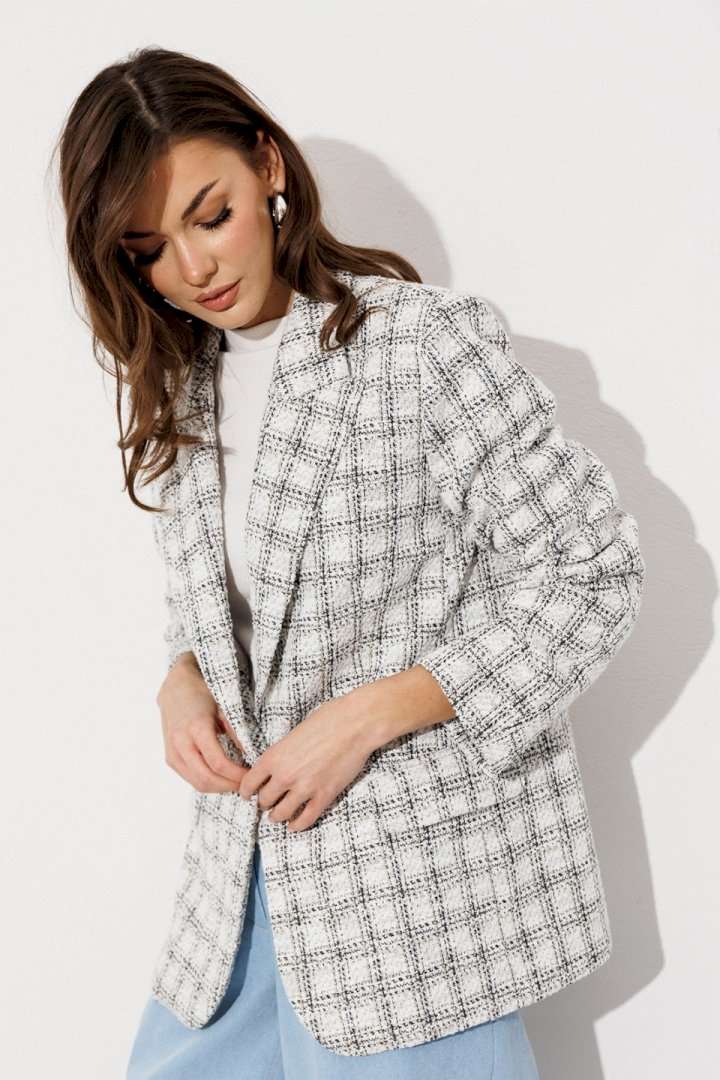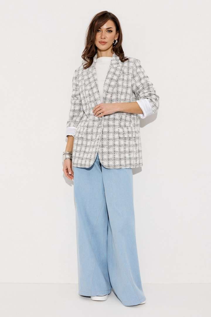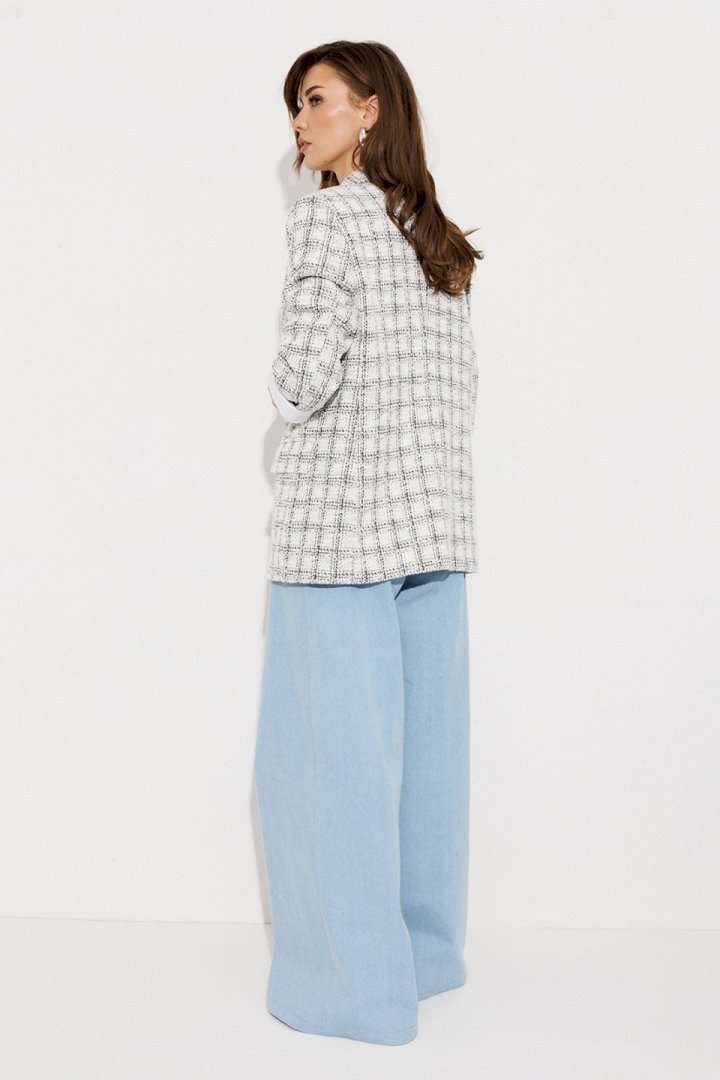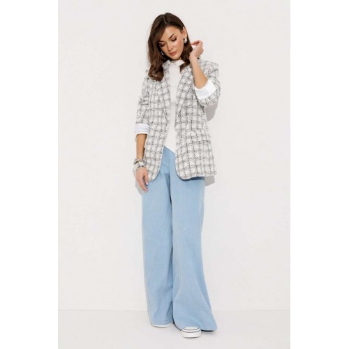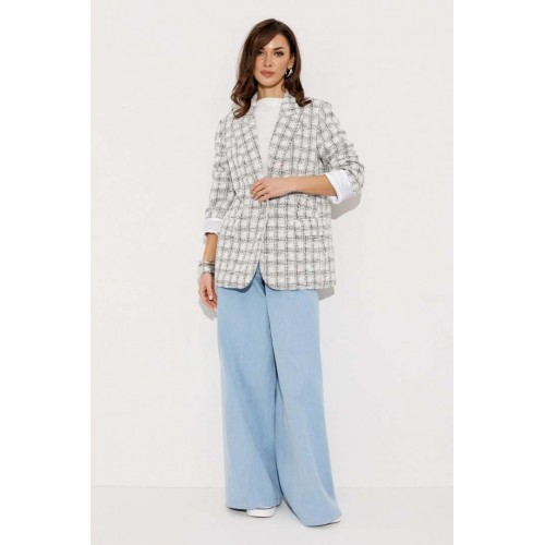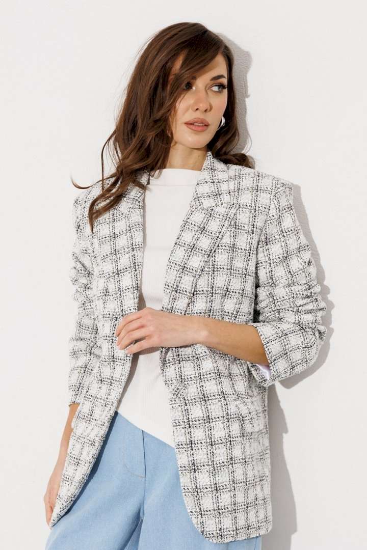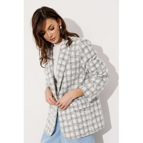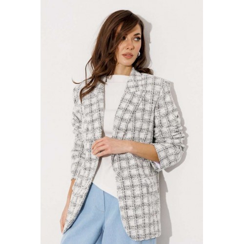 Жакет полуприлегающего силуэта, с однобортной застежкой на петлю-пуговицу, втачным двухшовным рукавом. Воротник отложной с лацканом. Полочка с талиевой вытачкой и карманом с клапаном. Спинка со средним швом. Жакет с отрезным бочком, переходящим на полочку и на спинку. Жакет на подкладке.