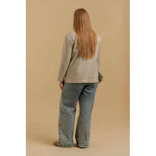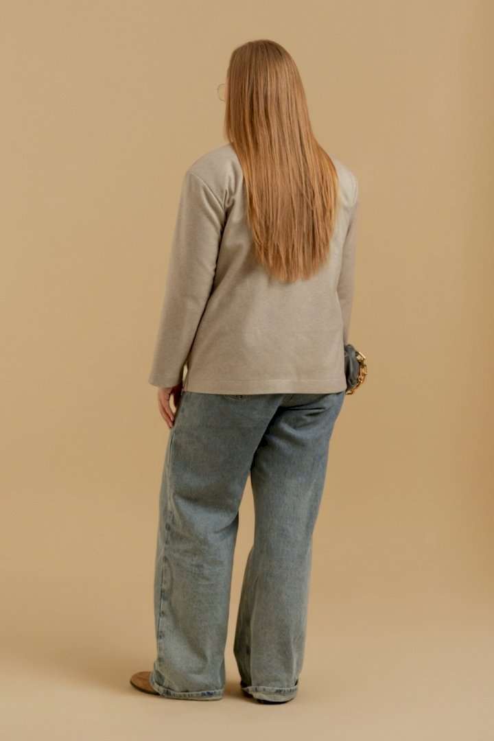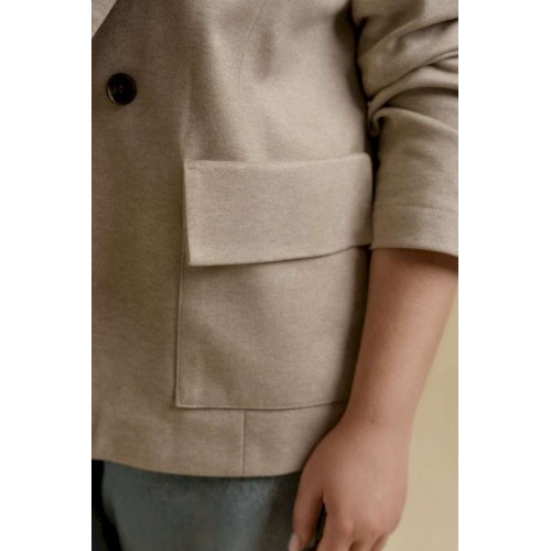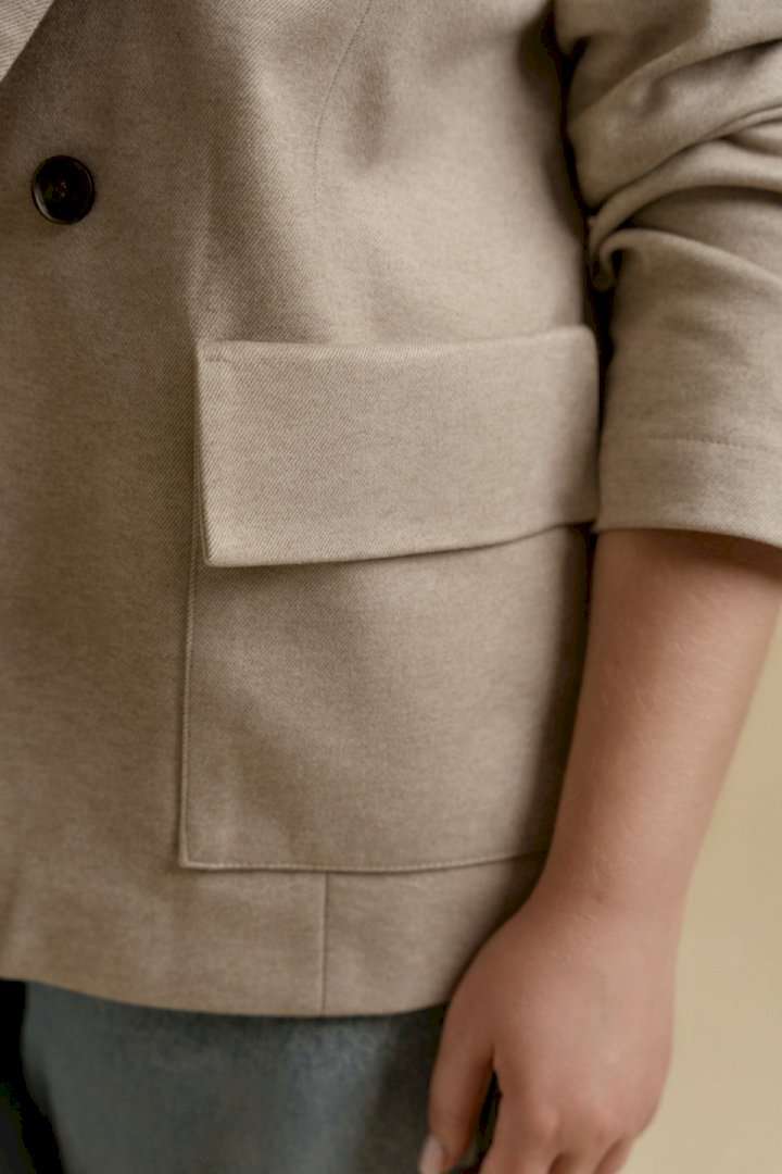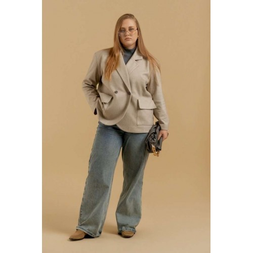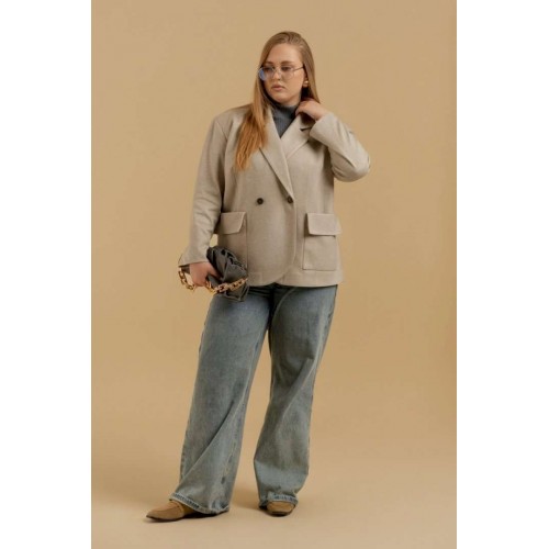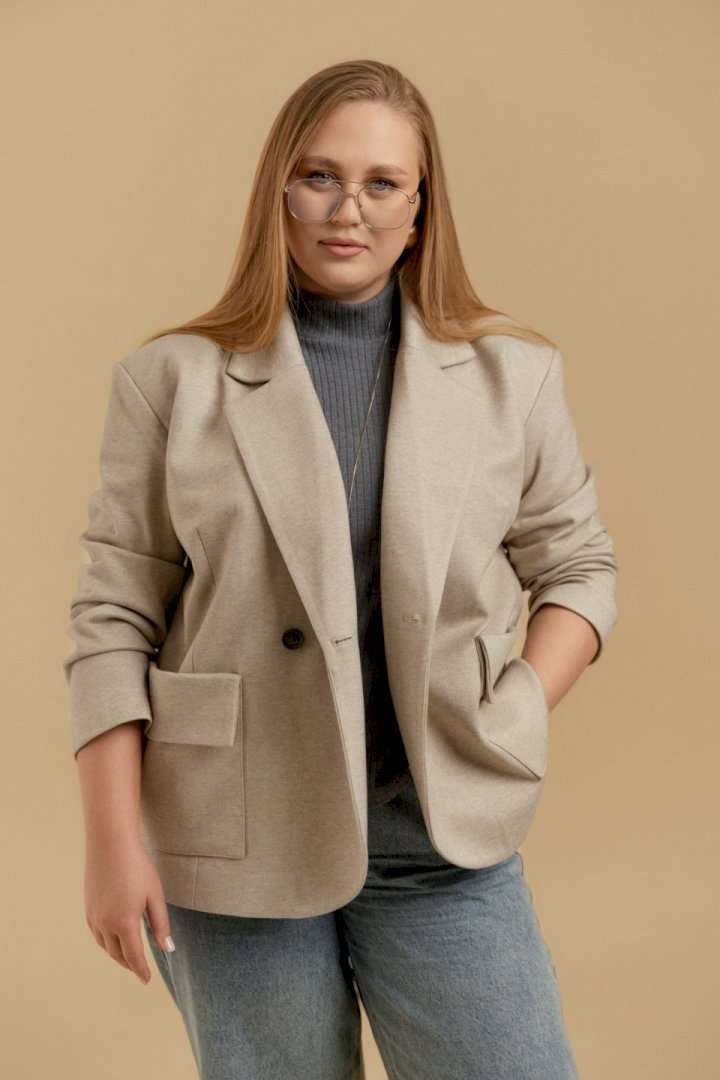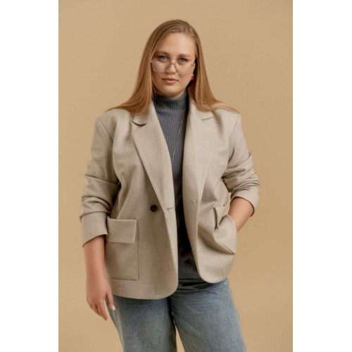 Жакет прямого покроя из мягкого трикотажного полотна. Вырез горловины оформлен воротником пиджачного типа с двубортной застежкой на петли с пуговицами. Рукава - втачные с расширенной линией плеча. Усилены плечевыми накладками. На передних половинках - настрочные карманы с цельнокроеными отворотами, имитирующими клапаны. Перед изделия посажен на подкладку.