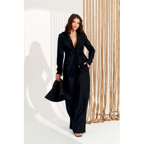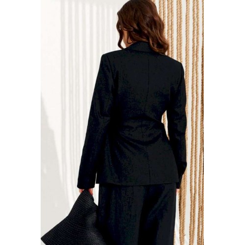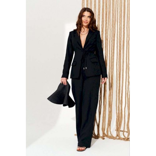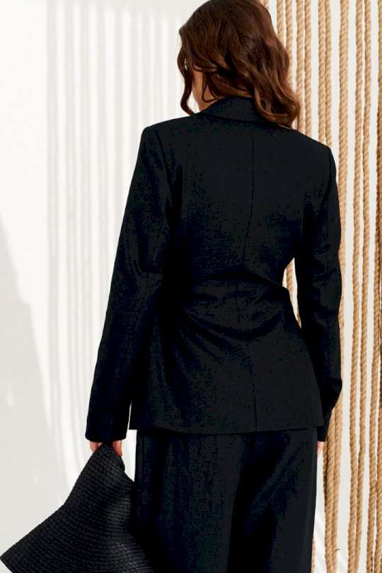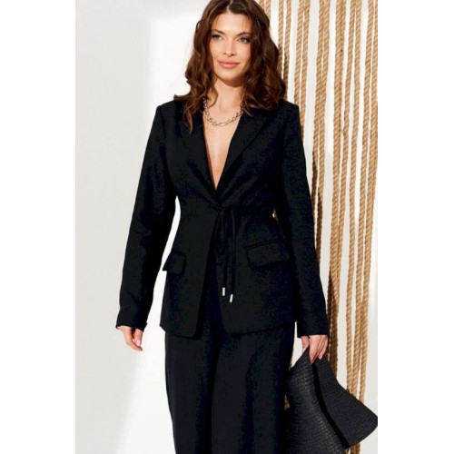 Жакет умеренного объема, полуприлегающего силуэта, с центральной застежкой на завязки, отложным воротником и лацканами пиджажного типа, на подкладке. Детали переда с талиевыми вытачками, отрезными бочками и прорезными карманами с клапанами и двумя обтачками. Спинка со средним швом и отрезными бочками. Рукав втачной, двухшовный, длинный. Длина изделия на модели вдоль середины спинки — 66,5 см (допустимое отклонение +/- 1 см)