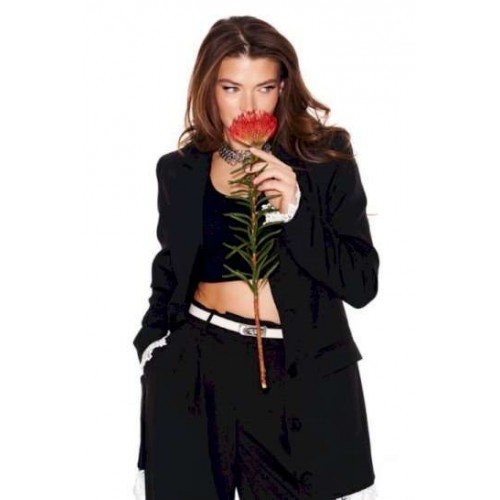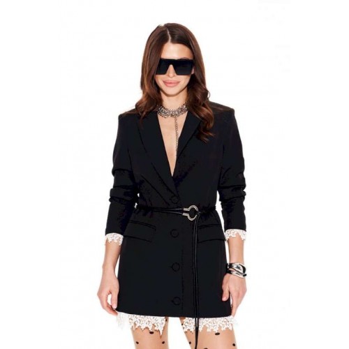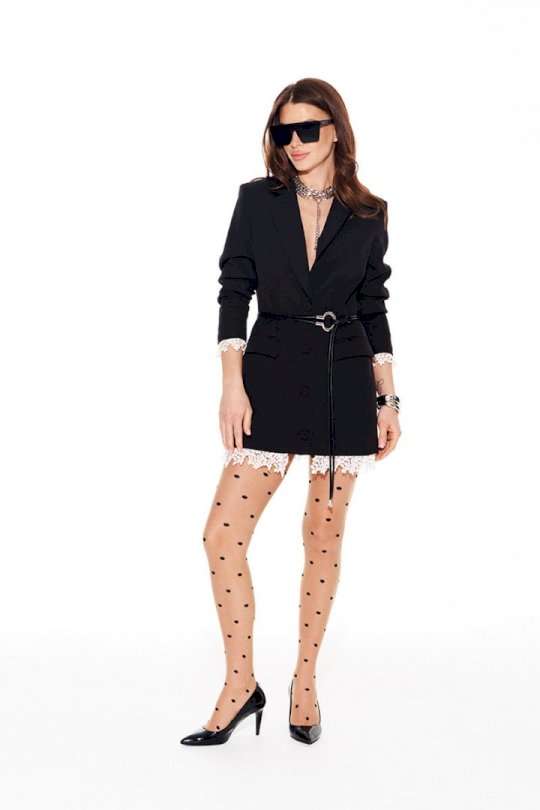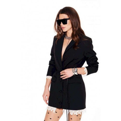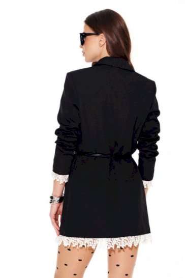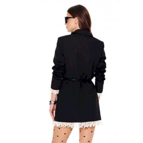 Жакет умеренного объема, полуприлегающего силуэта, с отложным воротником и лацканами пиджачного типа, центральной застежкой на петли и пуговицы, на подкладке. Детали переда с талиевыми вытачками, отрезными бочками, прорезными карманами с клапанами и двумя обтачками. Спинка со средним швом и отрезными бочками. Рукав втачной, двухшовный, длинный. Низ жакета и рукавов оформлен съемной тесьмой из кружева.