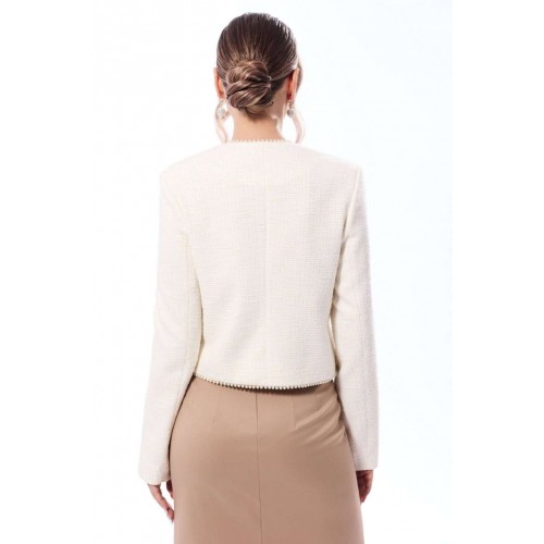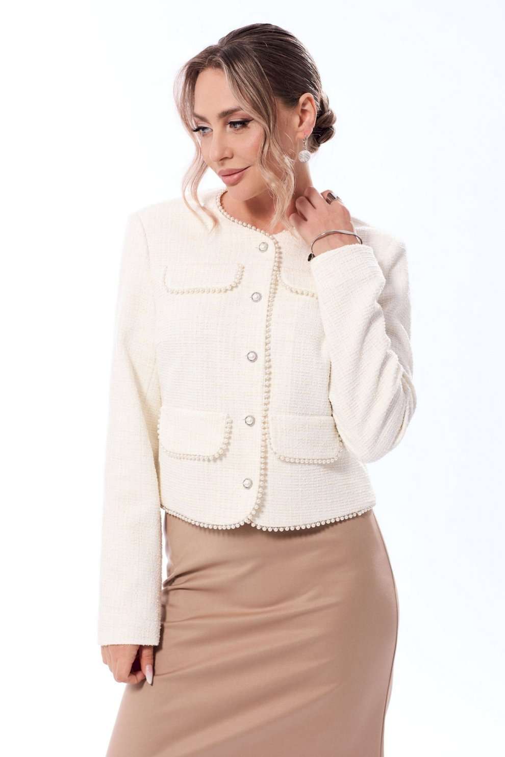 Жакет прямого силуэта с центральной застежкой на петли и пуговицы, без воротника, с круглым вырезом горловины. По переду с нагрудными вытачками. На уровне груди и линии талии расположены настрочные клапаны . Спинка со средним швом. Рукав втачной, длинный. Вдоль линии борта, горловины и клапанов- декоративная тесьма с бусинами.