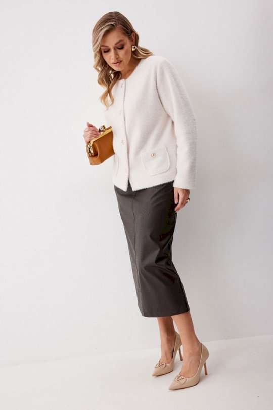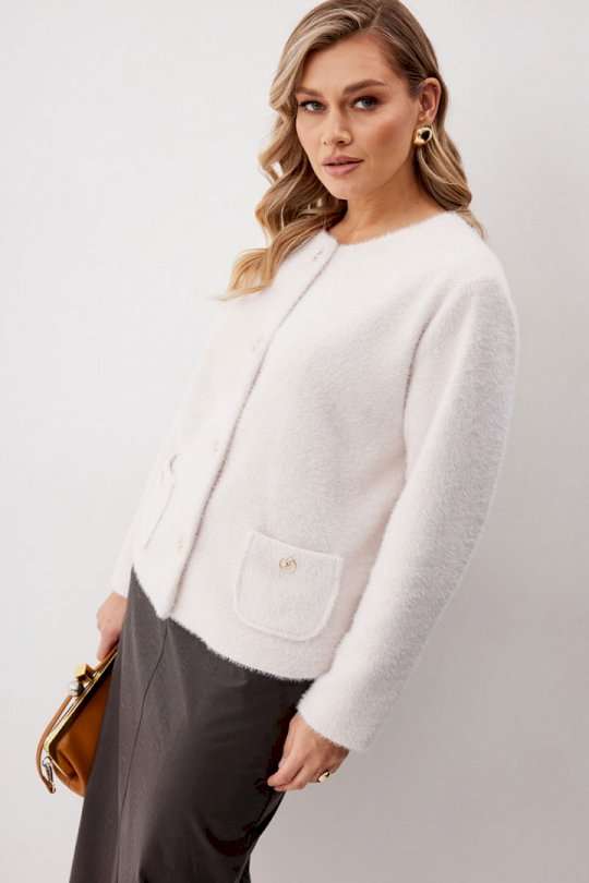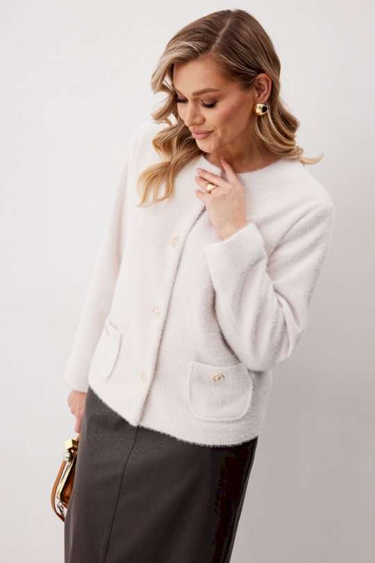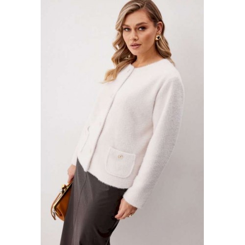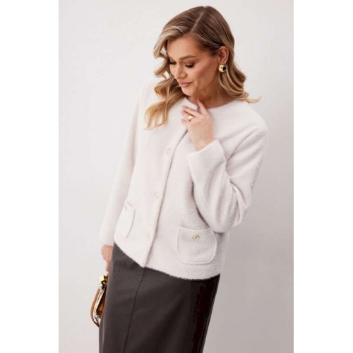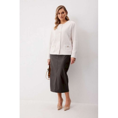 Жакет женский из трикотажной ткани прямого силуэта на подкладке. На деталях переда настрочены накладные карманы округлой формы застегивающиеся на декоративные кнопки. Спинка прямая. Рукав двухшовный с имитацией шлицы. Горловина округлой формы. Жакет застегивается на декоративные кнопки. Длина изделия по спинке 57 см, длина рукава 62,5 см.