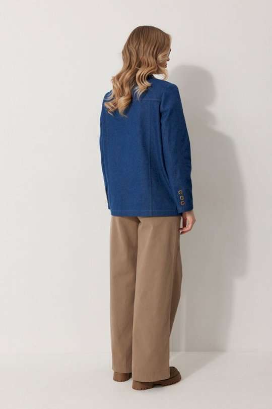 Жакет женский прямого силуэта на частичной контрастной подкладке. Жакет однобортный, длинной до середины бедра с округлой формой борта. Полочка с отрезными бочками и вытачкой. В нижней части расположены прорезные карманы с клапаном. На левом клапане расположен декоративный элемент. Спинка с отрезными бочками и отрезной кокеткой. Рукав втачной, полной длинны. По низу рукава обработана имитация шлицы с отделочными строчками и декоративными пуговицами. Воротник в жакете втачной с отрезной стойкой и лацканами. Жакет застегивается на петли и отделочные пуговицы. По воротнику, лацкану, борту, клапанам и швам спинки и полочки прострочены отделочные строчки. Длина изделия по спинке 69 см, длина рукава 62 см.