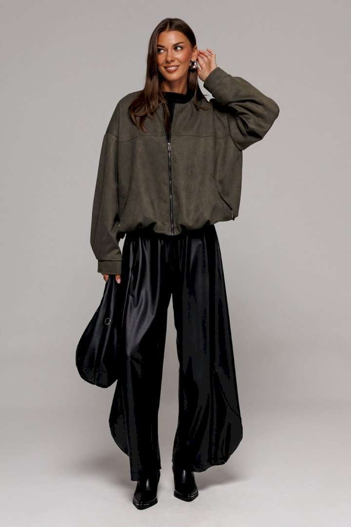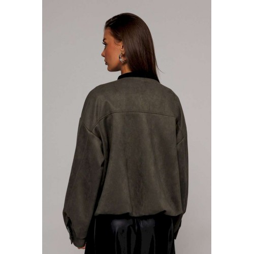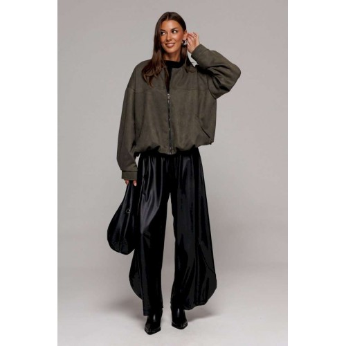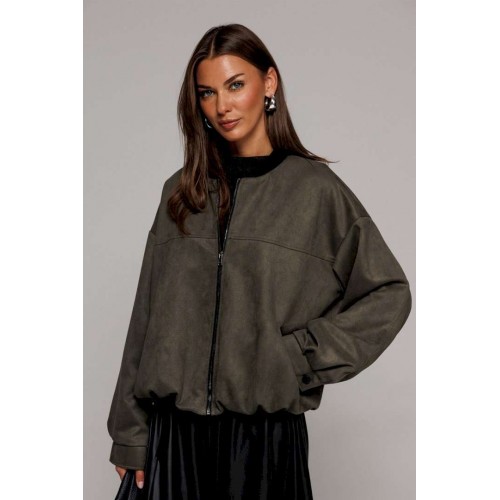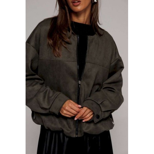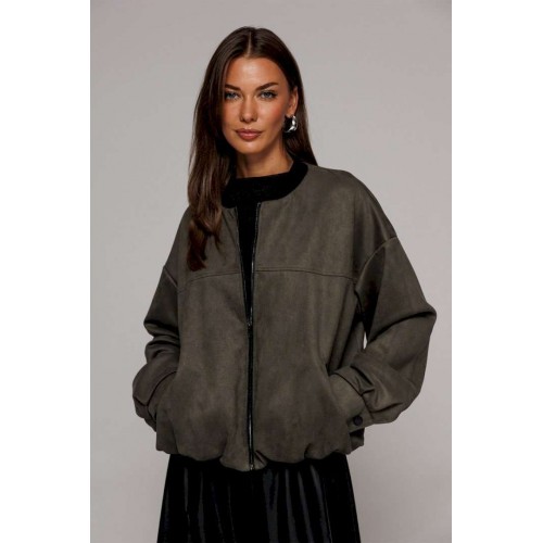 Жакет-бомбер из искусственной замши свободного силуэта со спущенной линией плеча. Рукав втачной двухшовнный, внизу со складками, притачной манжетой с застежкой на кнопку. Полочка с застежкой на тесьму молнию, с кокеткой и карманами с застежкой на молнию. Синка с кокеткой. По горловине планка из довяза. Низ жакета-бомбера со сборкой. Изделие на подкладке.