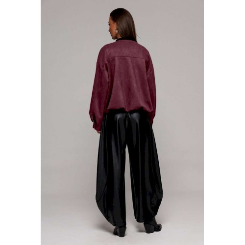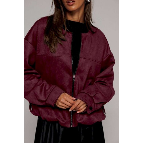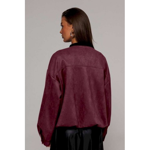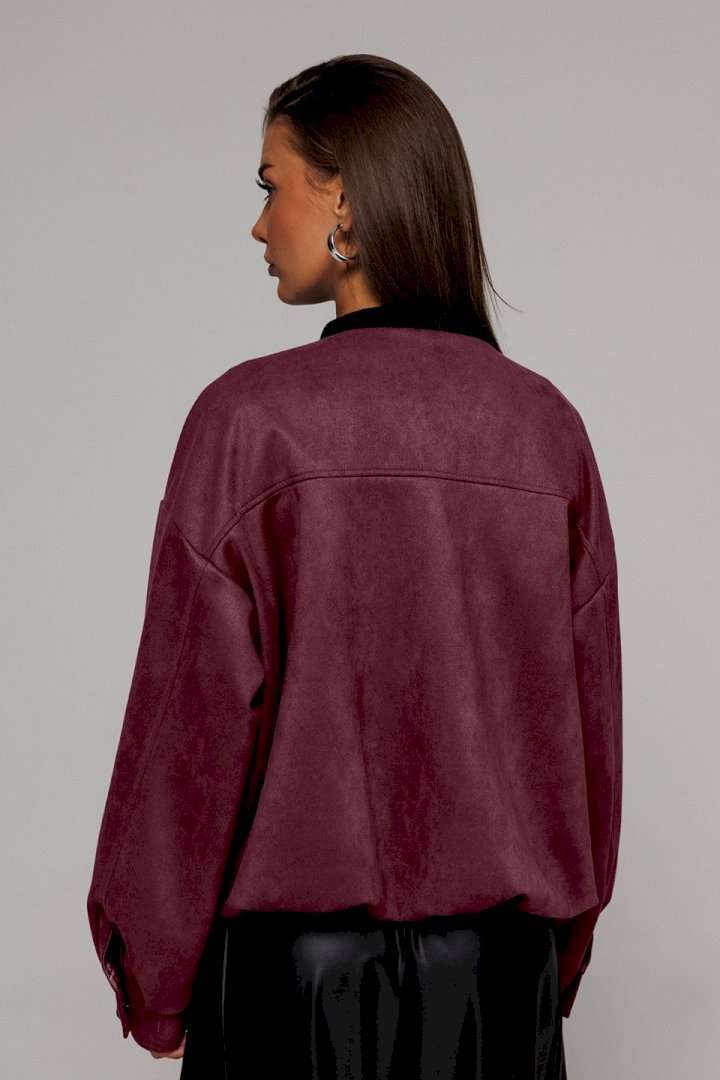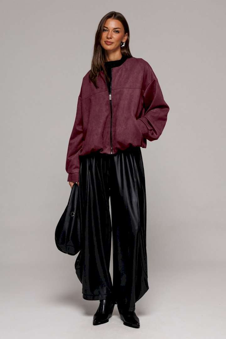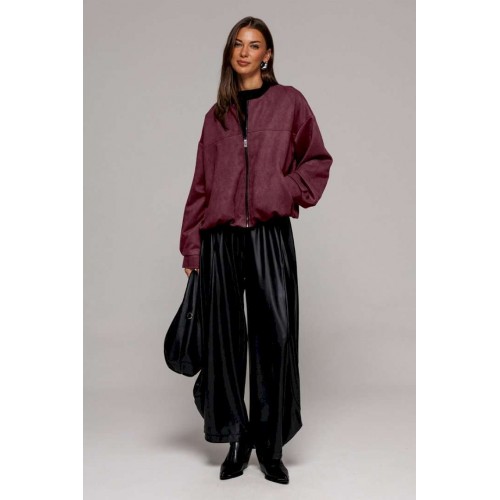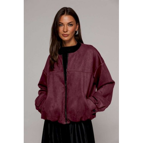 Жакет-бомбер из искусственной замши свободного силуэта со спущенной линией плеча. Рукав втачной двухшовнный, внизу со складками, притачной манжетой с застежкой на кнопку. Полочка с застежкой на тесьму молнию, с кокеткой и карманами с застежкой на молнию. Синка с кокеткой. По горловине планка из довяза. Низ жакета-бомбера со сборкой. Изделие на подкладке.