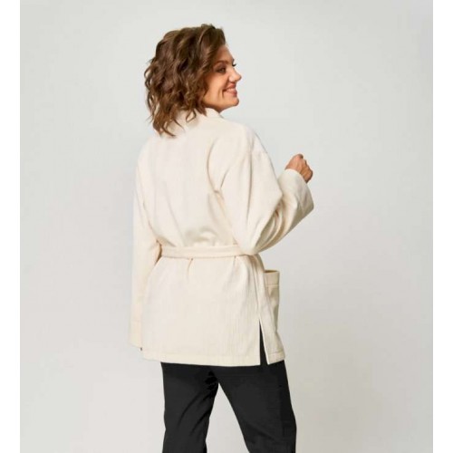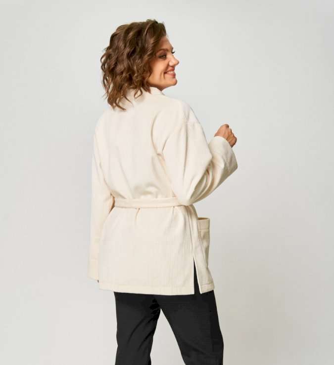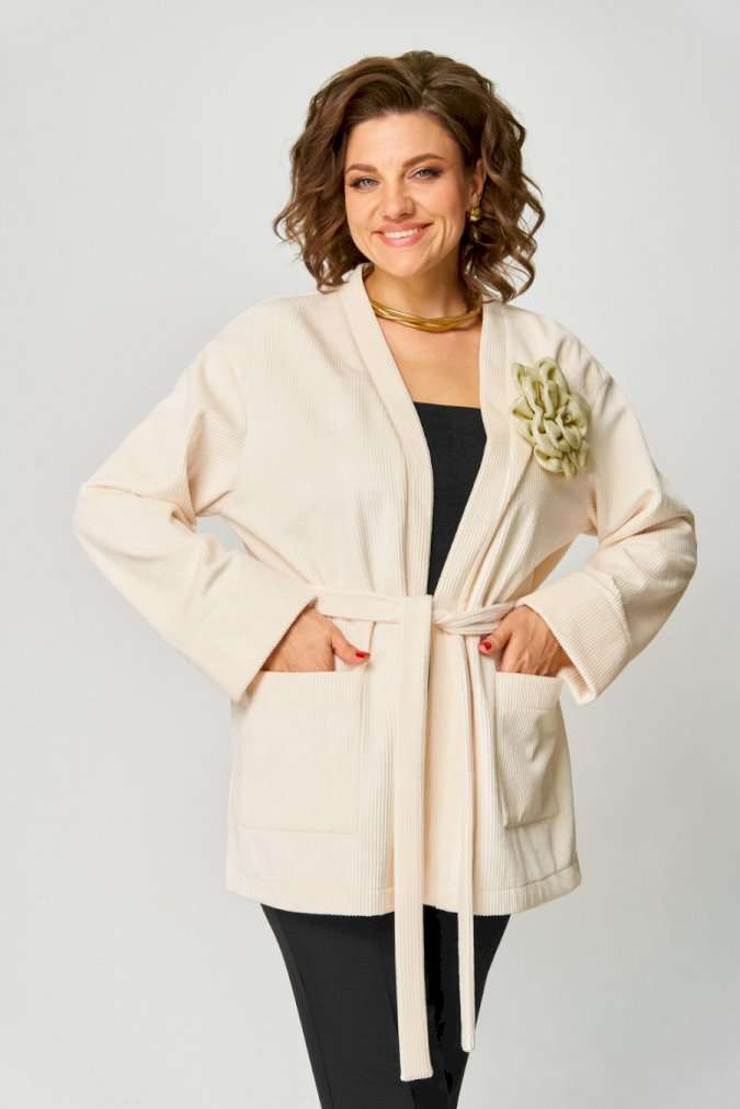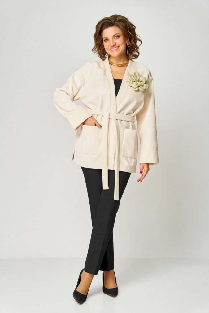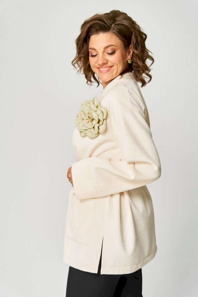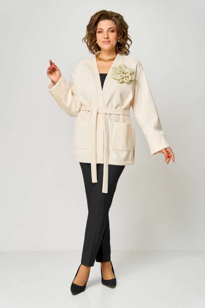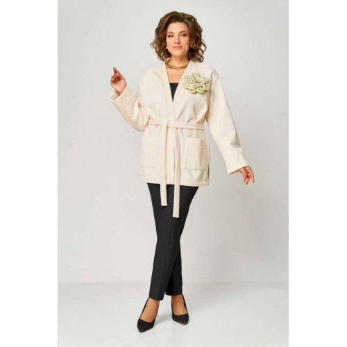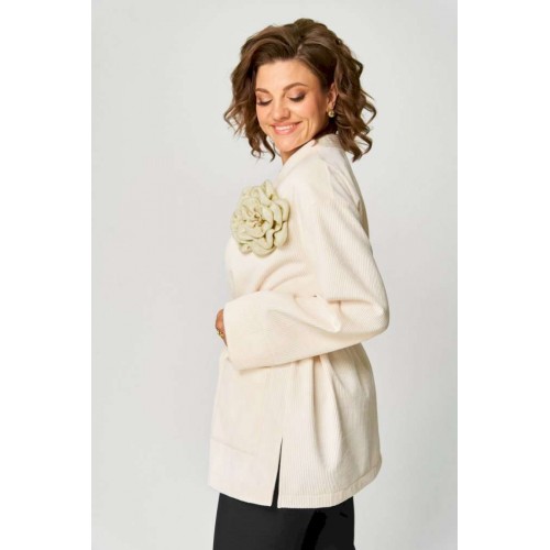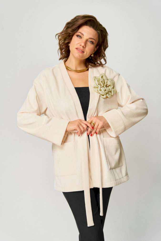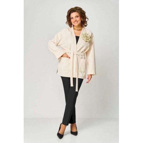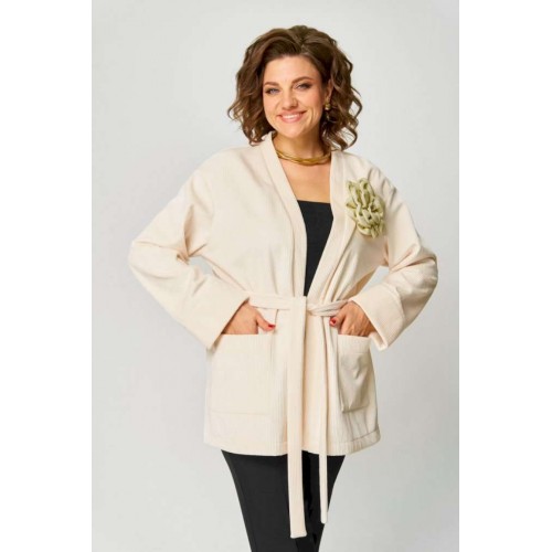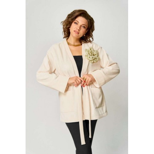 Жакет женский свободного прямого силуэта, длиной ниже линии бедер. Жакет трикотажный, без подкладки со съемным поясом и накладными карманами. По переду и горловине спинки притачная планка, без застежки. Линия плеча слегка спущена. Рукав втачной длинный с отложной манжетой. В боковых швах разрезы. Украшен жакет съемным цветком из отделочной ткани. Длина середины спинки: размеры: 52-56 74 см, 58-60 76 см, 62-66 79 см Длина рукава от горловины: 67 см