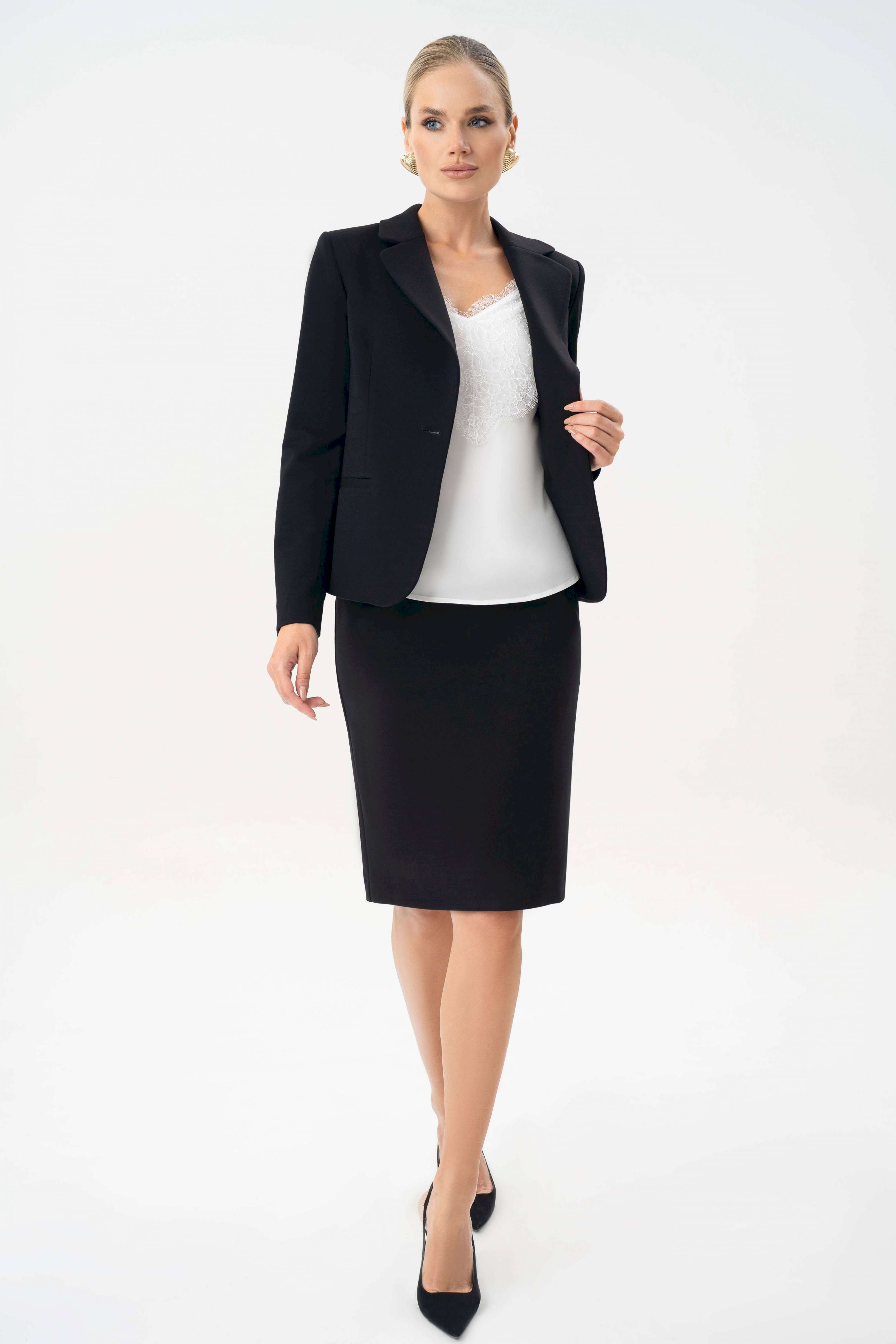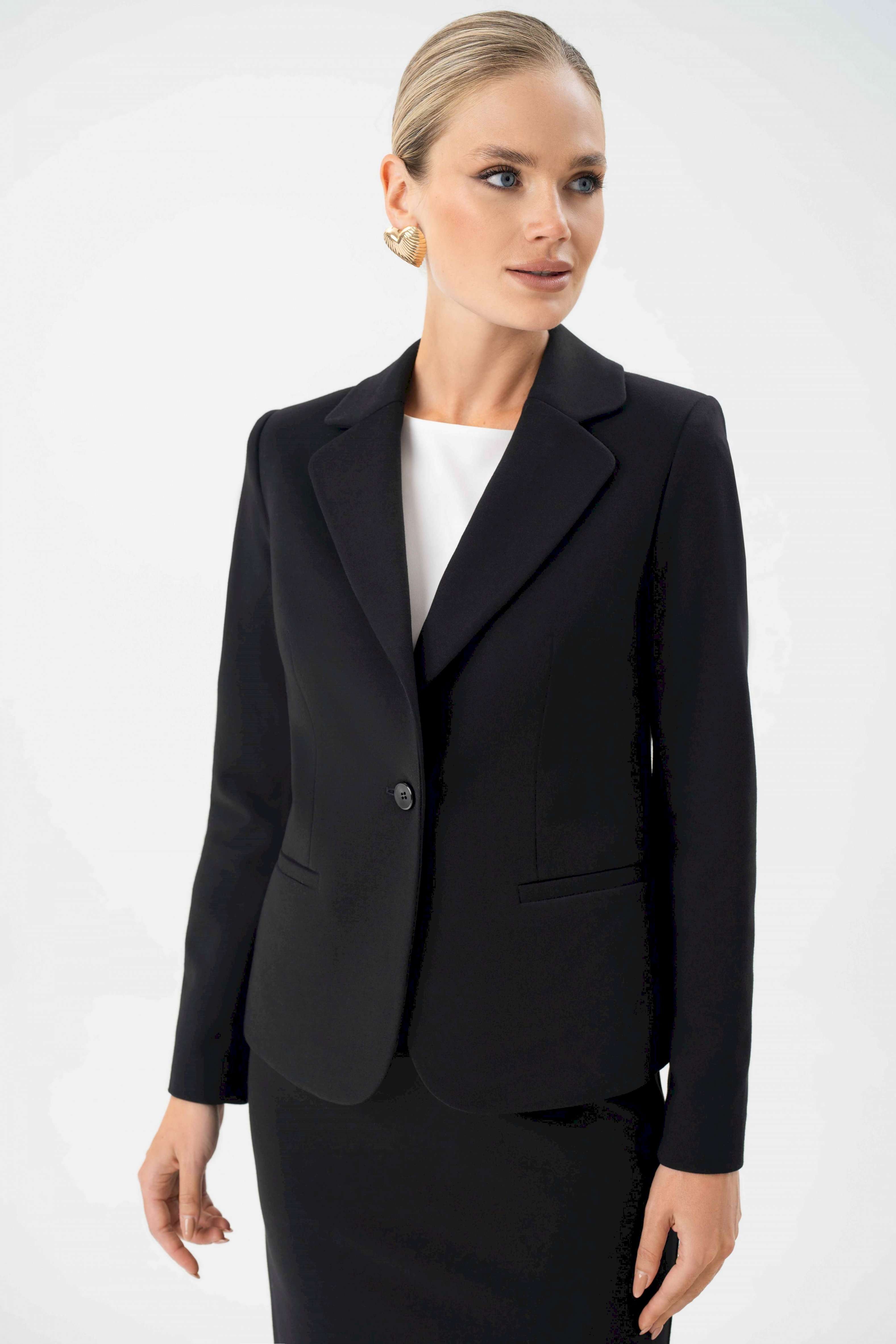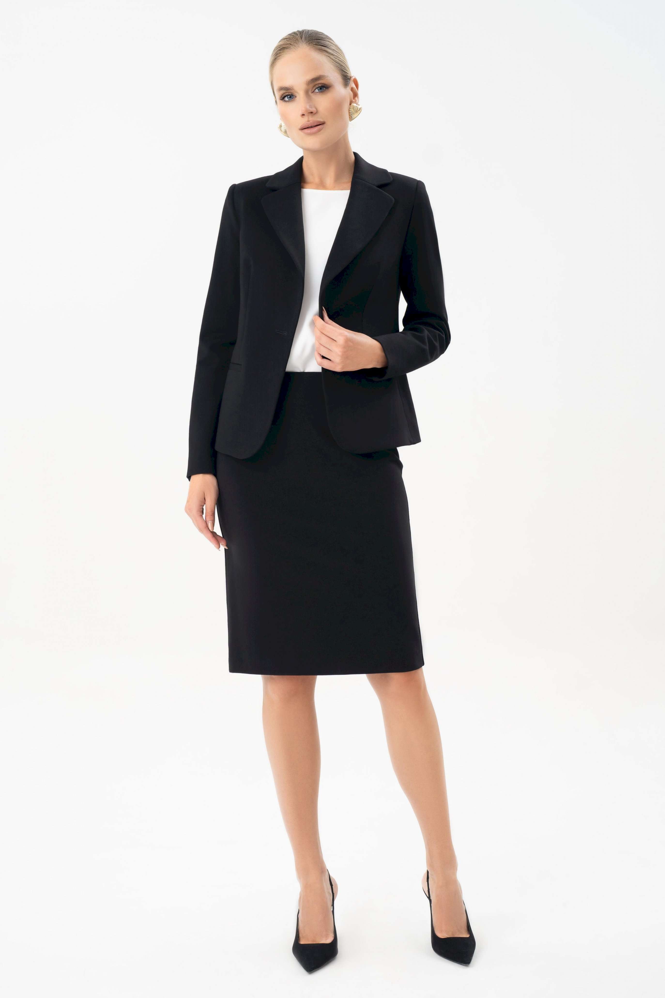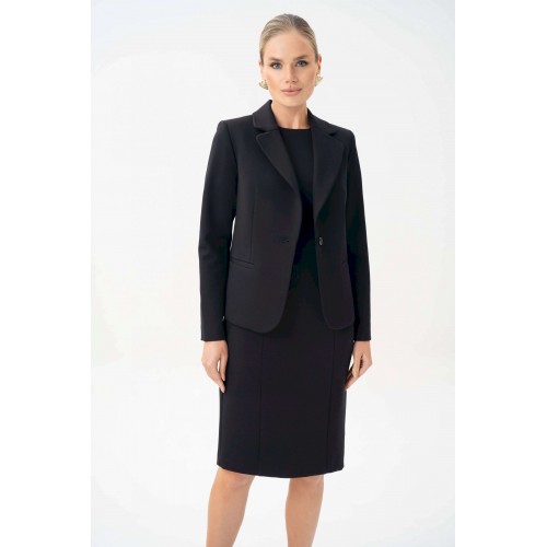 Черный трикотажный жакет – незаменимая вещь на каждый день. Эта модель универсальная, она подойдет любой женщине, независимо от её возраста, предпочитаемого стиля одежды и телосложения. Такую популярность жакет черного цвета приобрел за счет своей уникальной комбинаторности, он легко сочетается с массой вещей. Кроме того, такая модель уместна в любой ситуации. Жакет прекрасно комбинируется с блузой 24-425-1 и является комплектом к брюкам 25-549-1, юбке 25-550-1, платью 25-561-1. Жакет женский полуприлегающего силуэта, выполнен из трикотажного полотна, на подкладке, с воротником пиджачного типа, предназначен для повседневной носки. Перед и спинка с отрезным бочком. Перед жакета с центральной бортовой застежкой на 1 петлю и пуговицу (размер и цвет фурнитуры может незначительно отличаться от фото), с закругленными по низу бортами, с рельефными швами бочка, в нижней части с прорезными функциональными карманами с листочками, с вытачками, идущими от карманов вверх. Спинка со средним швом, с рельефными швами бочка. Рукава втачные, двухшовные, длинные. Концы воротника и лацканов закругленные. Жакет с плечевыми накладками. Средняя длина по среднему шву спинки - 57,0 (±3,0 см) Средняя длина рукава - 61,5 (±2,0 см)