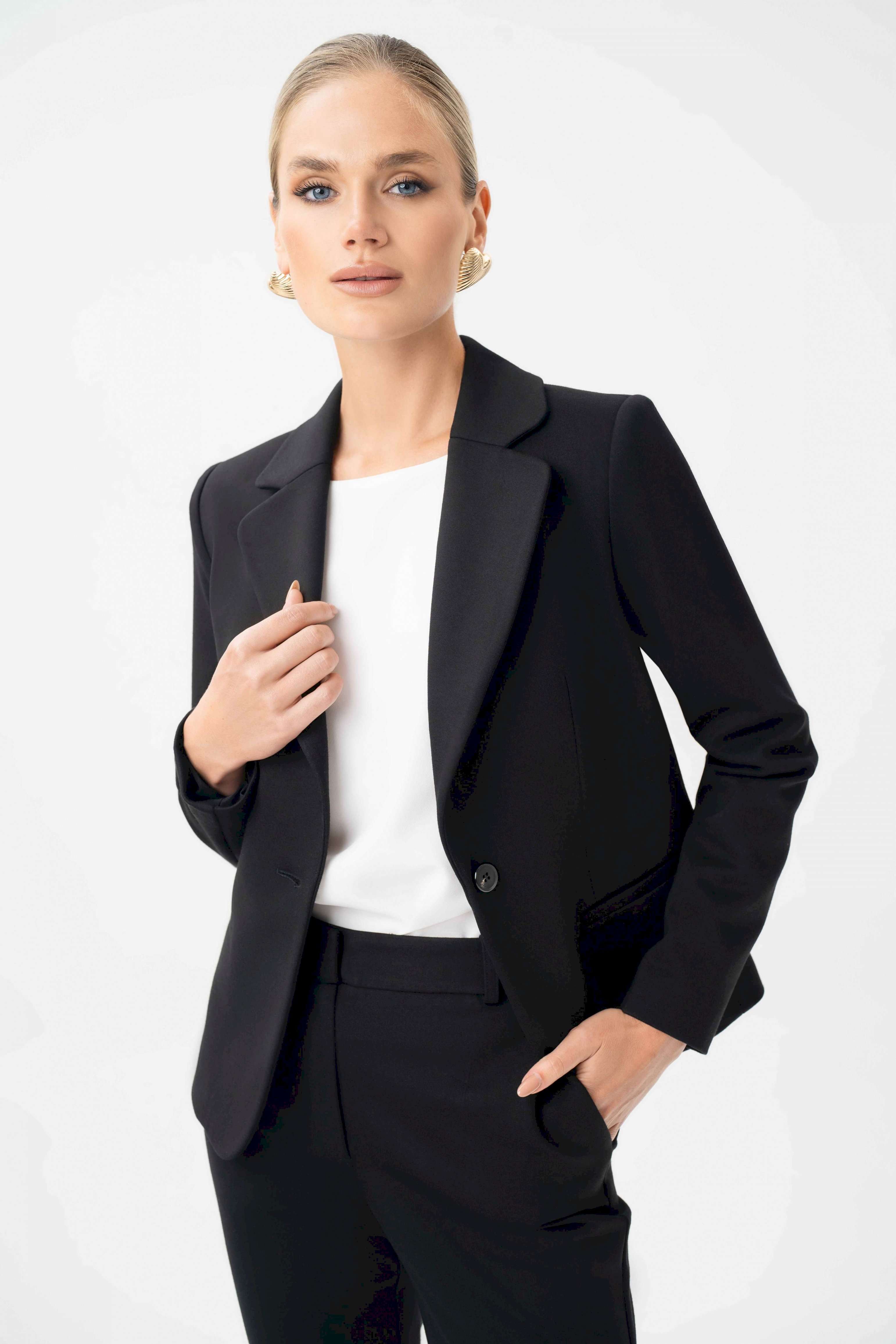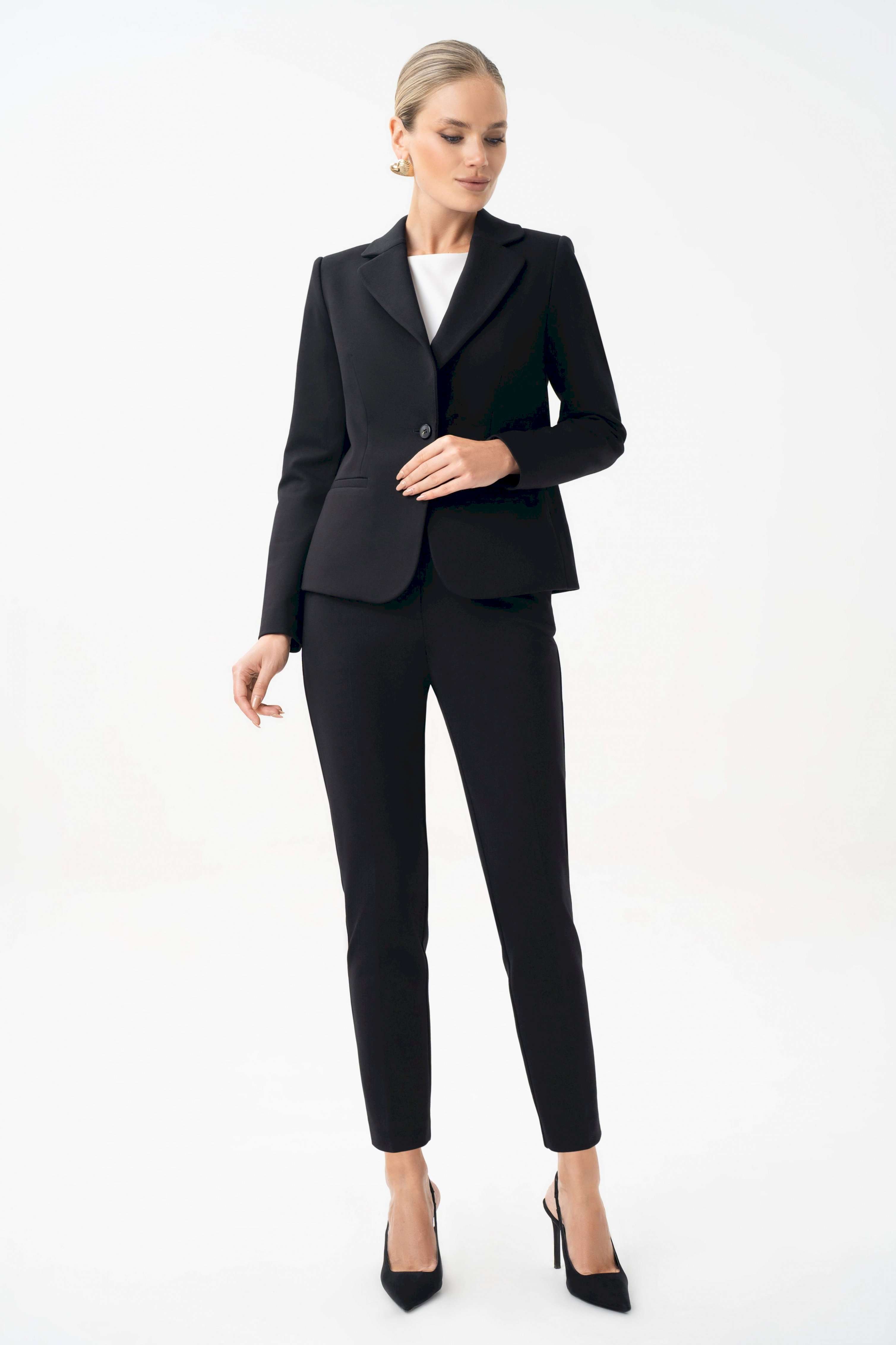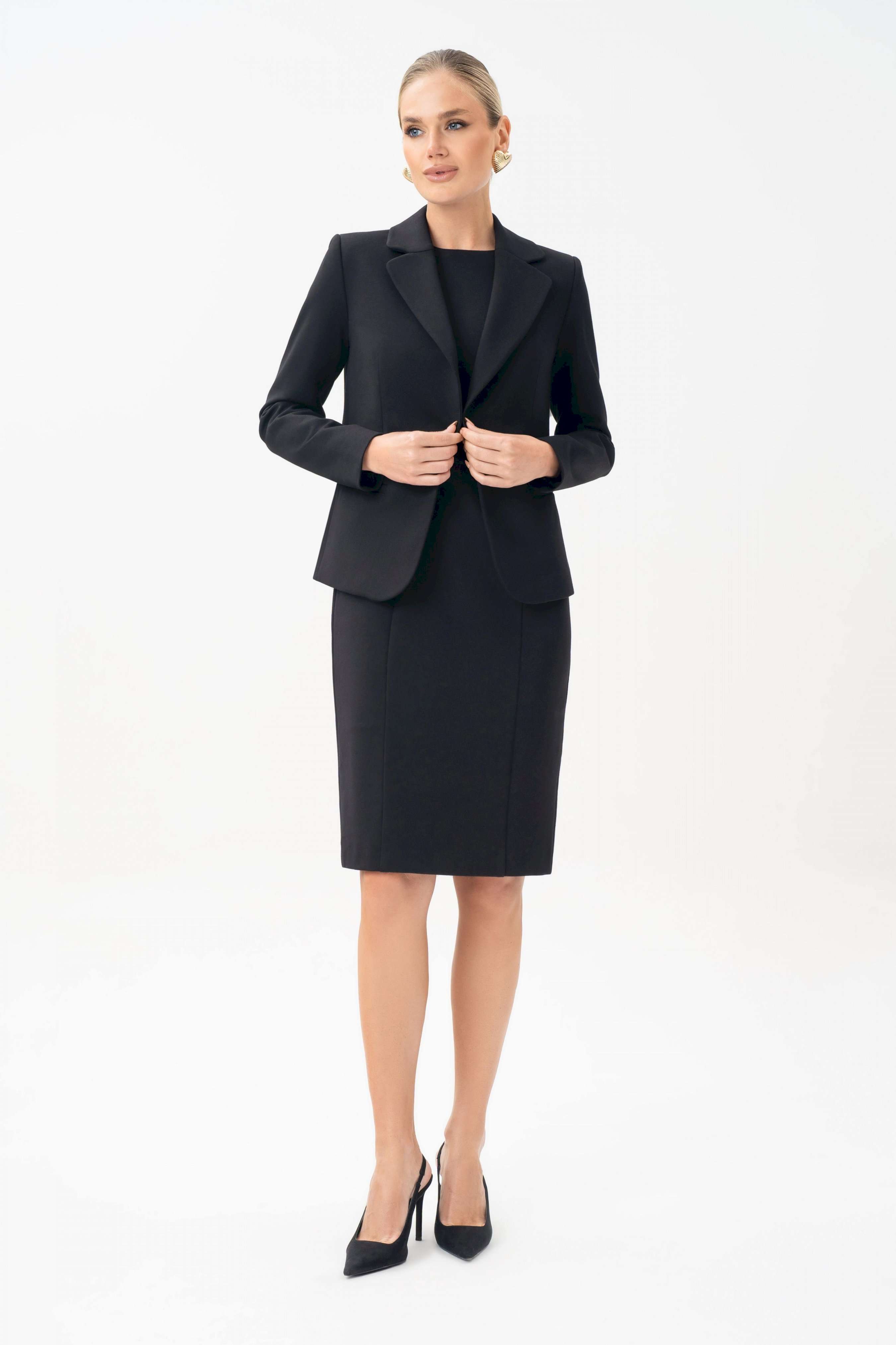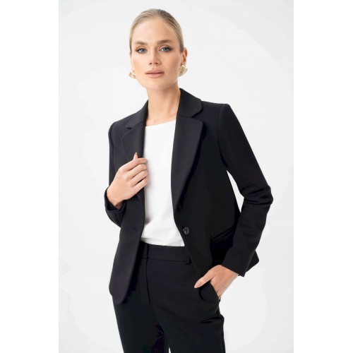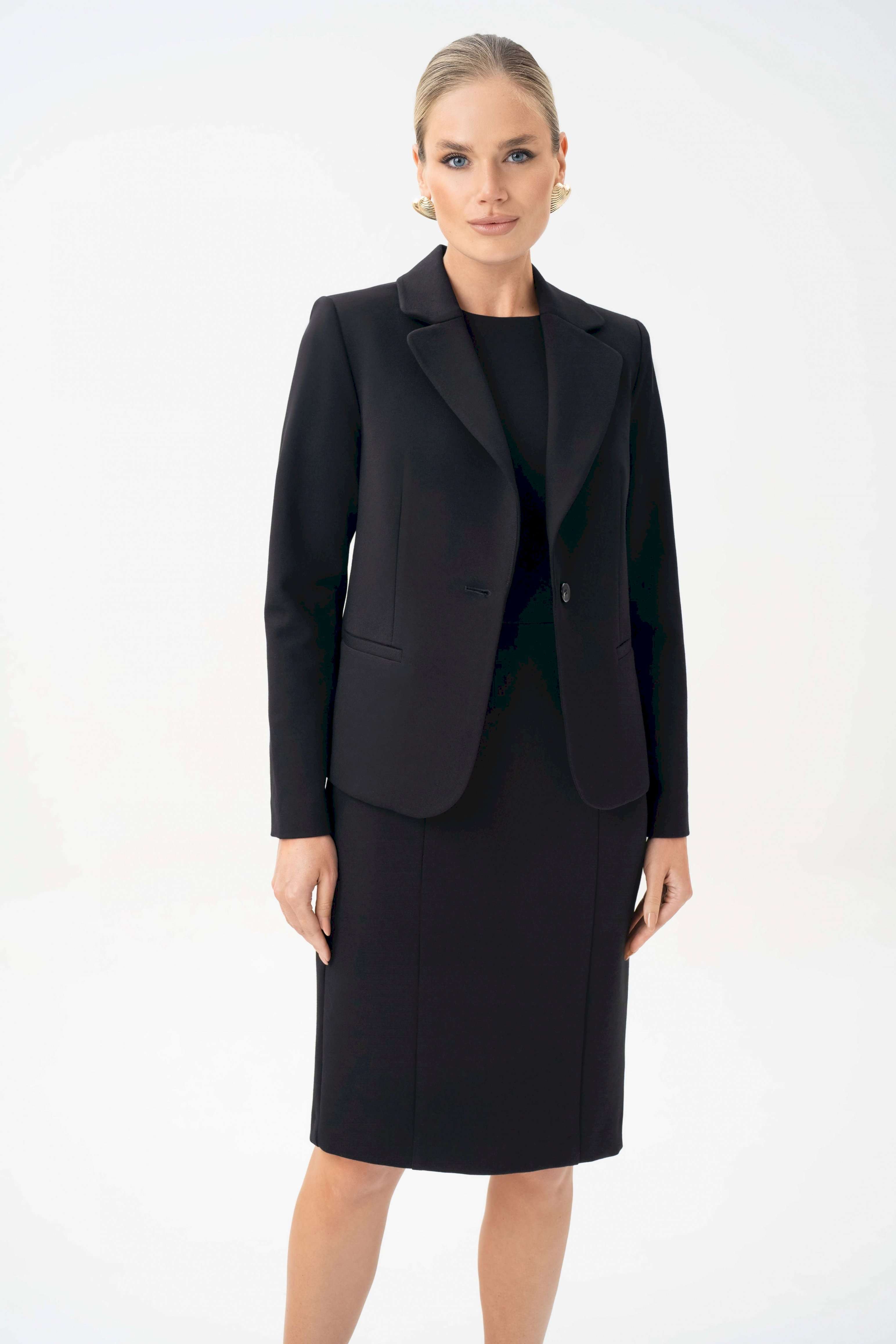 Черный трикотажный жакет – незаменимая вещь на каждый день. Эта модель универсальная, она подойдет любой женщине, независимо от её возраста, предпочитаемого стиля одежды и телосложения. Такую популярность жакет черного цвета приобрел за счет своей уникальной комбинаторности, он легко сочетается с массой вещей. Кроме того, такая модель уместна в любой ситуации. Жакет прекрасно комбинируется с блузой 24-425-1 и является комплектом к брюкам 25-549-1, юбке 25-550-1, платью 25-561-1. Жакет женский полуприлегающего силуэта, выполнен из трикотажного полотна, на подкладке, с воротником пиджачного типа, предназначен для повседневной носки. Перед и спинка с отрезным бочком. Перед жакета с центральной бортовой застежкой на 1 петлю и пуговицу (размер и цвет фурнитуры может незначительно отличаться от фото), с закругленными по низу бортами, с рельефными швами бочка, в нижней части с прорезными функциональными карманами с листочками, с вытачками, идущими от карманов вверх. Спинка со средним швом, с рельефными швами бочка. Рукава втачные, двухшовные, длинные. Концы воротника и лацканов закругленные. Жакет с плечевыми накладками. Средняя длина по среднему шву спинки - 57,0 (±3,0 см) Средняя длина рукава - 61,5 (±2,0 см)