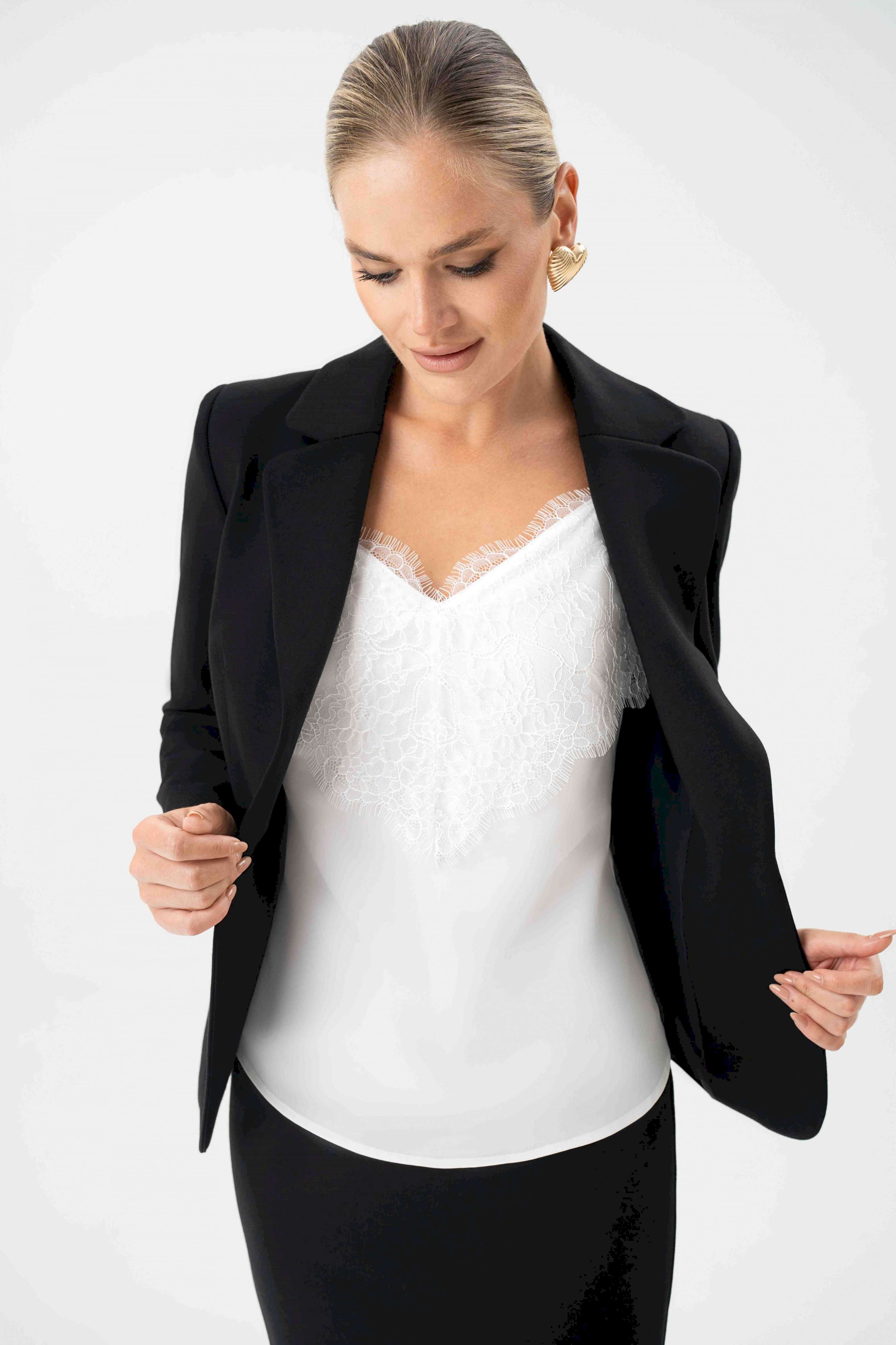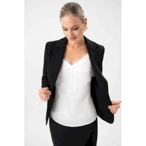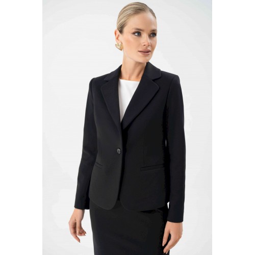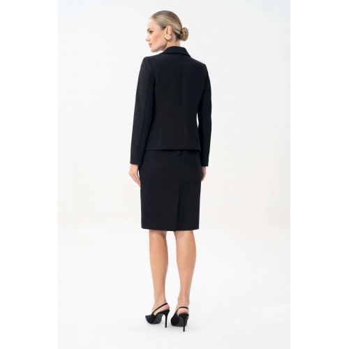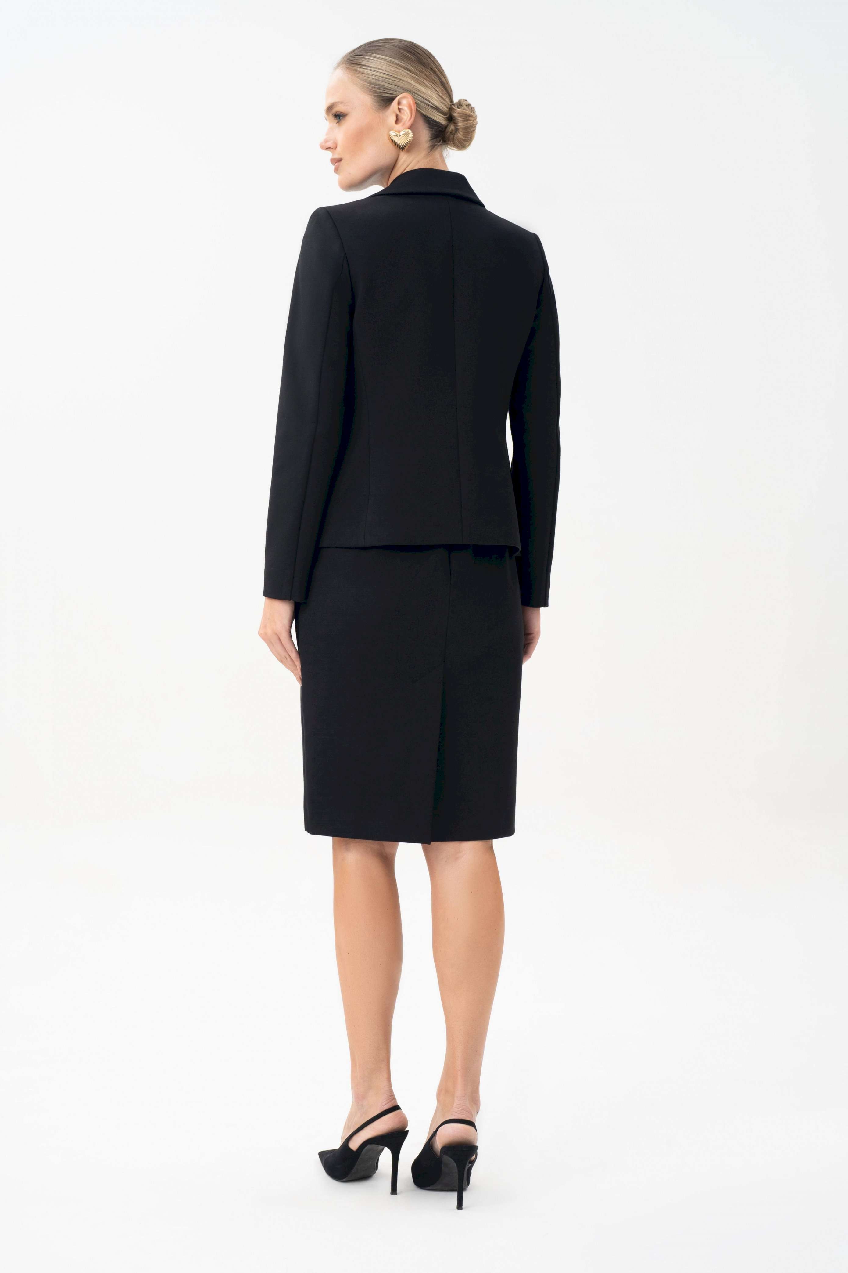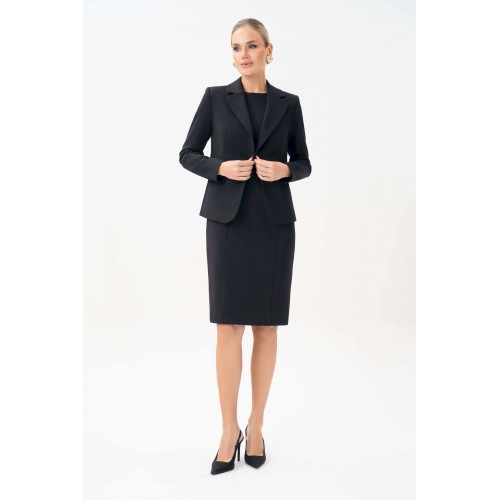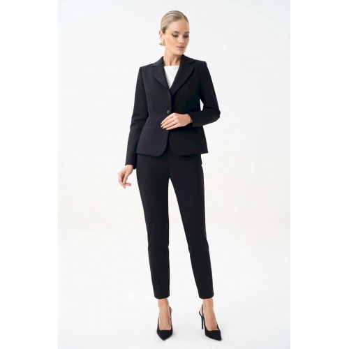 Черный трикотажный жакет – незаменимая вещь на каждый день. Эта модель универсальная, она подойдет любой женщине, независимо от её возраста, предпочитаемого стиля одежды и телосложения. Такую популярность жакет черного цвета приобрел за счет своей уникальной комбинаторности, он легко сочетается с массой вещей. Кроме того, такая модель уместна в любой ситуации. Жакет прекрасно комбинируется с блузой 24-425-1 и является комплектом к брюкам 25-549-1, юбке 25-550-1, платью 25-561-1. Жакет женский полуприлегающего силуэта, выполнен из трикотажного полотна, на подкладке, с воротником пиджачного типа, предназначен для повседневной носки. Перед и спинка с отрезным бочком. Перед жакета с центральной бортовой застежкой на 1 петлю и пуговицу (размер и цвет фурнитуры может незначительно отличаться от фото), с закругленными по низу бортами, с рельефными швами бочка, в нижней части с прорезными функциональными карманами с листочками, с вытачками, идущими от карманов вверх. Спинка со средним швом, с рельефными швами бочка. Рукава втачные, двухшовные, длинные. Концы воротника и лацканов закругленные. Жакет с плечевыми накладками. Средняя длина по среднему шву спинки - 57,0 (±3,0 см) Средняя длина рукава - 61,5 (±2,0 см)