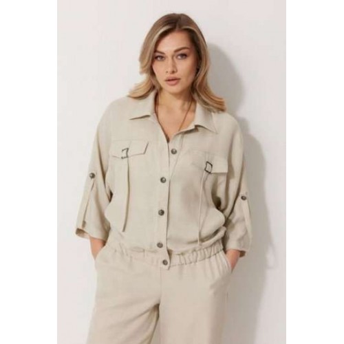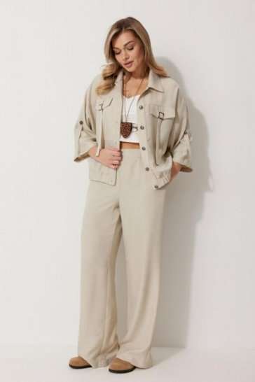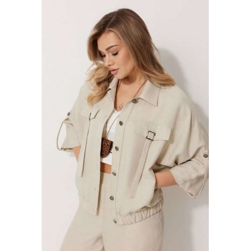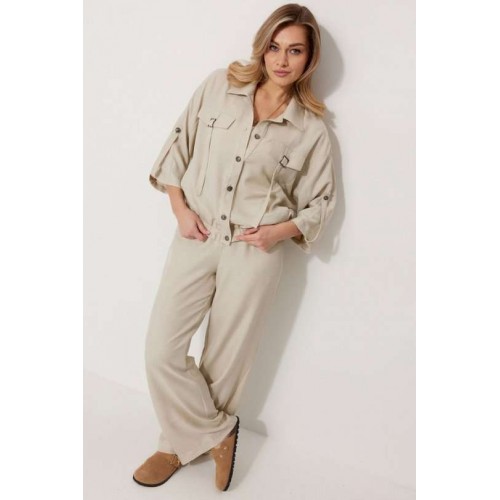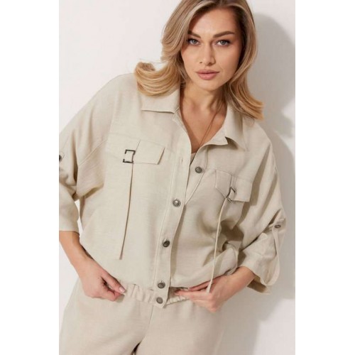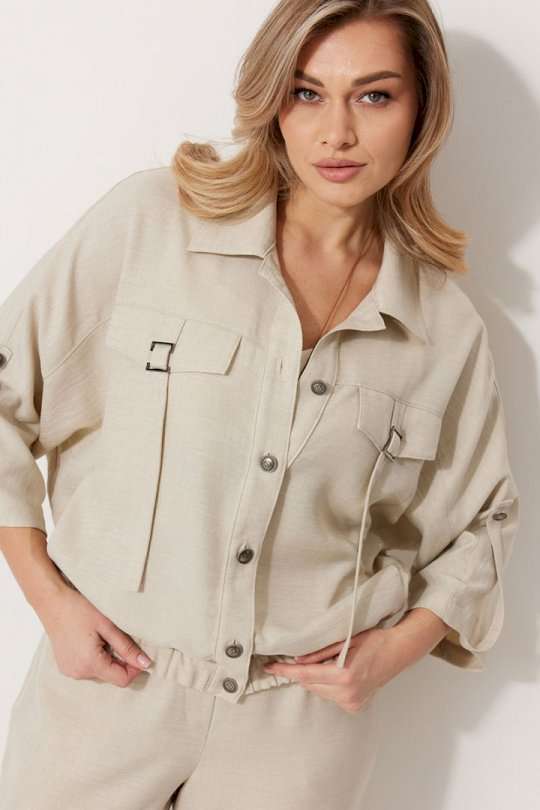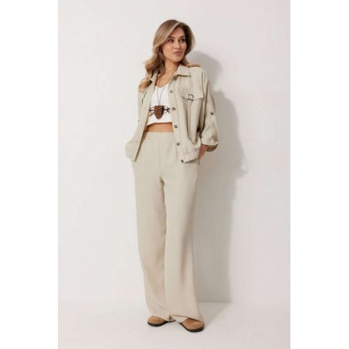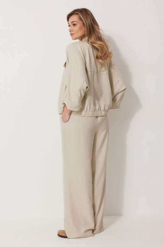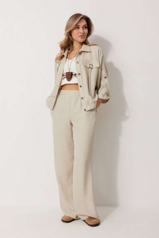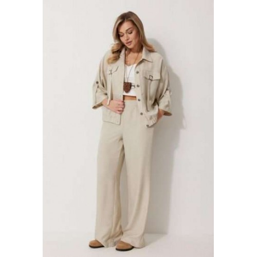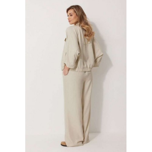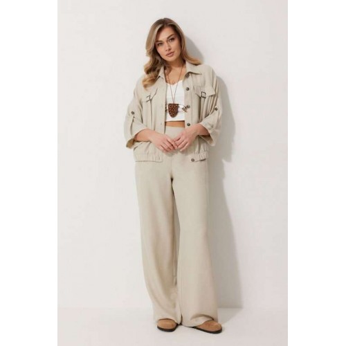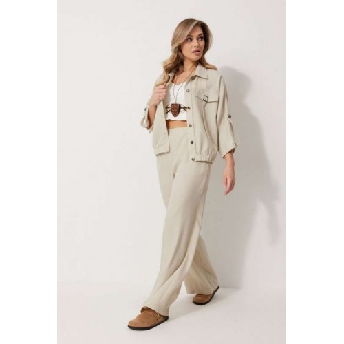 Костюм женский, состоящий из жакета и брюк. Жакет без подкладки, кроя «летучая мышь» длиной до линии бедра. По переду отрезные бочки с карманами «в шве». В шве кокетки полочки располагаются клапаны с декоративными элементами и хлястиком. Спинка с отрезными бочками и кокеткой. Рукав цельнокроеный 7/8длины, состоящий из четырех частей с патой по низу , застегивающейся на петлю и пуговицу. Низ жакета обработан резинкой. Застежка центральная на отрезные планки, застегивающиеся на петли и пуговицы. Горловина обработана втачным воротником с цельнокроеной стойкой. Брюки женские, прямого силуэта. По переду обработана имитация застежки. Карманы расположены в боковом шве. На задних половинках брюк застрочены вытачки. Верх обработан притачным поясом (частично на резинке).