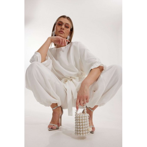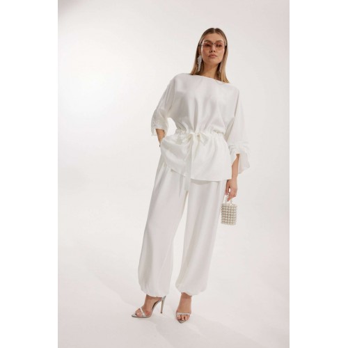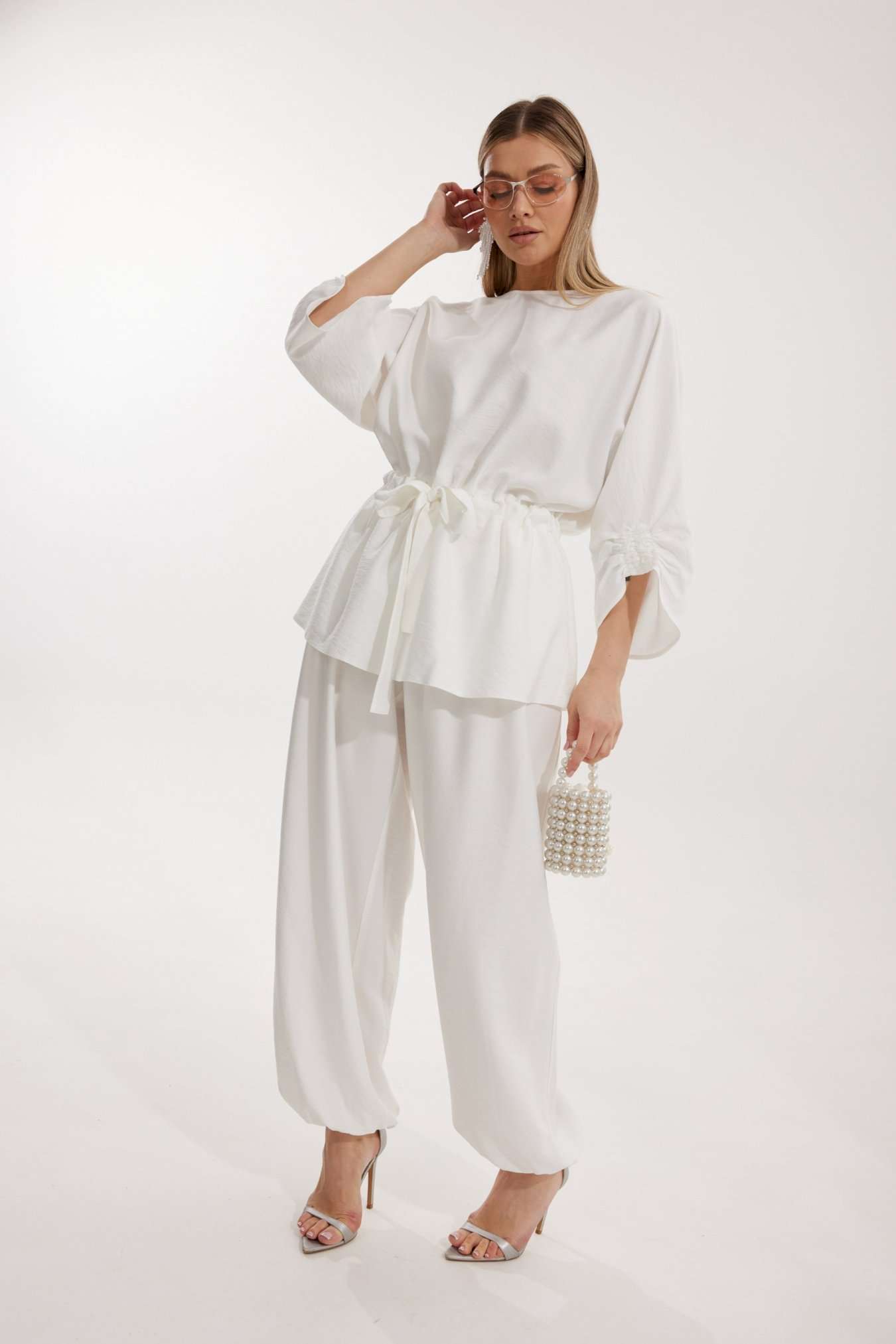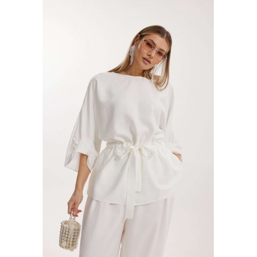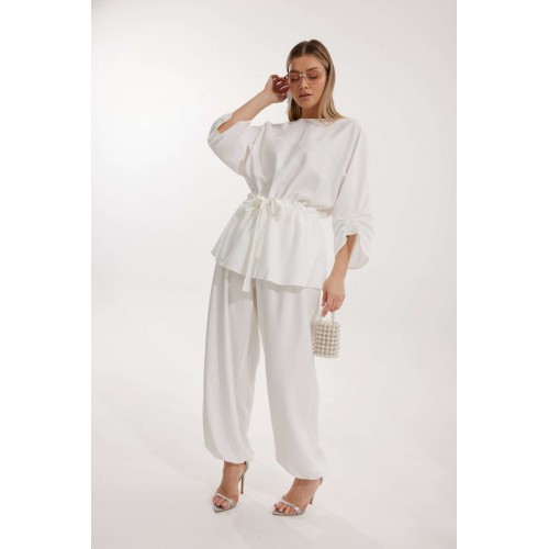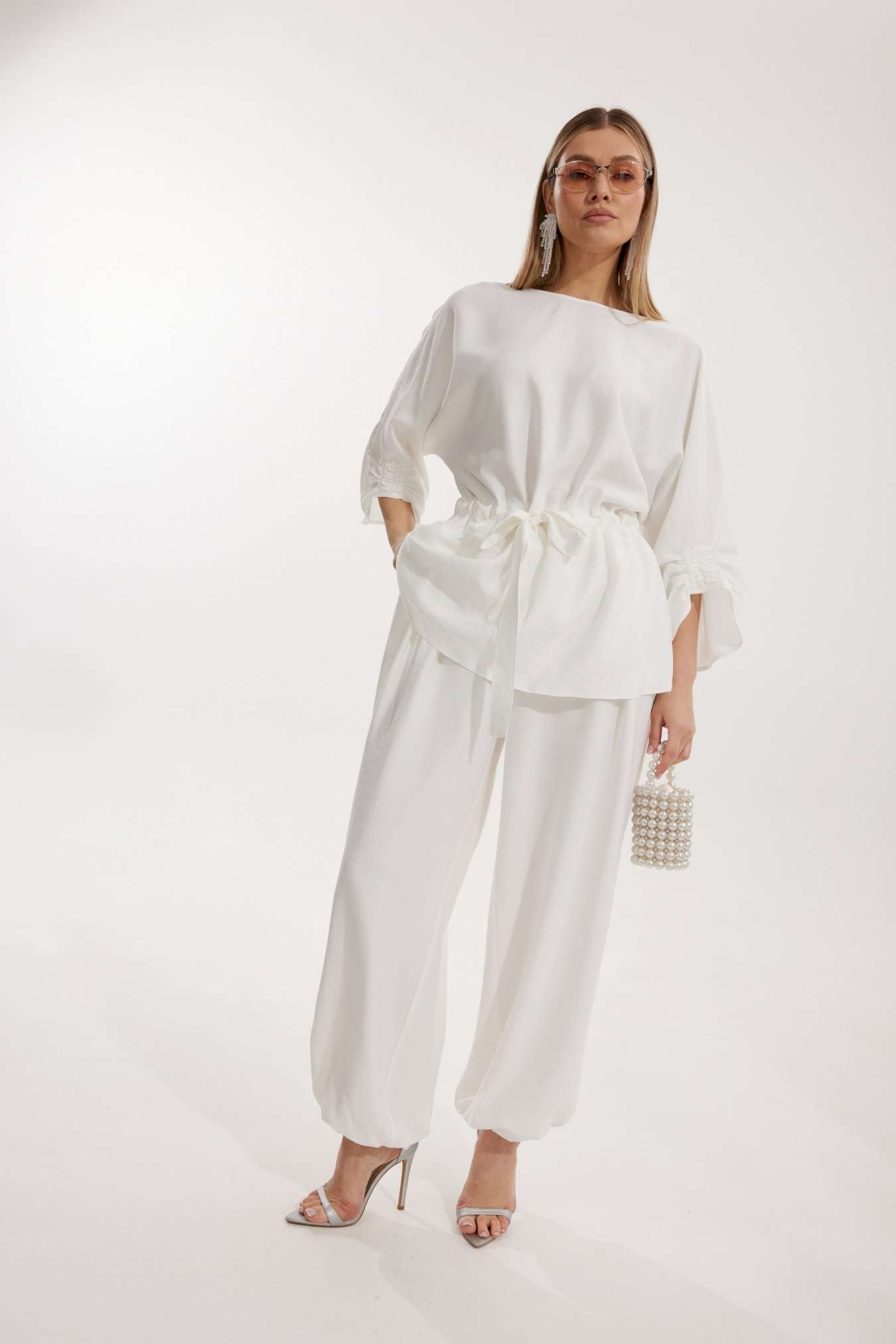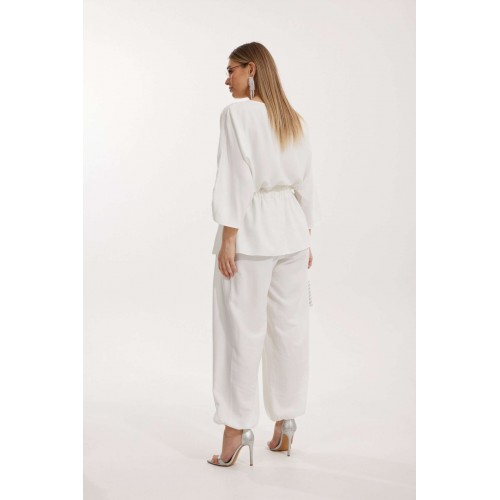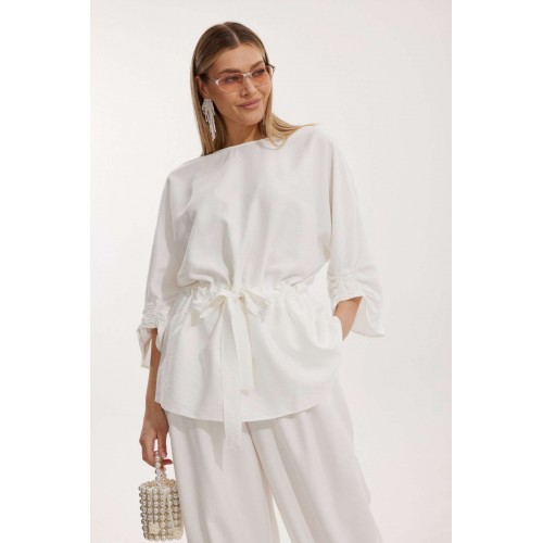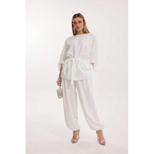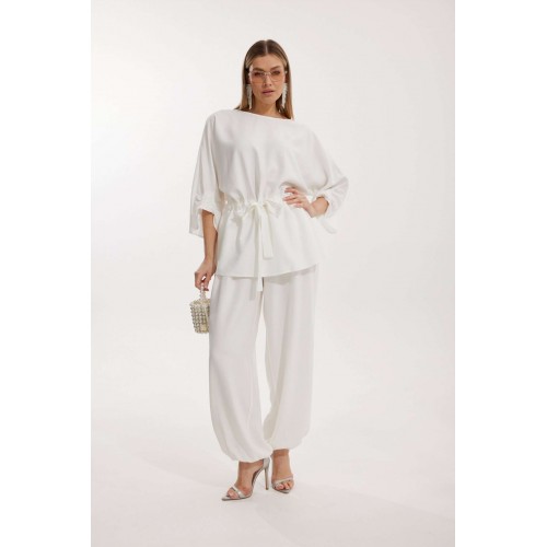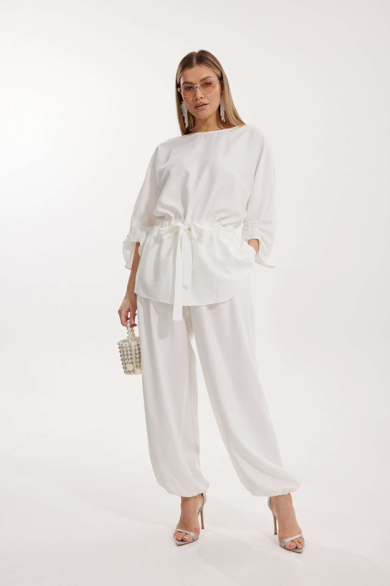 Костюм женский, состоящий из блузы и брюк. Блуза кроя «летучая мышь» длиной за линию бедра. Перед цельный с округлой горловиной. Спинка со средним швом. В районе талии обработана кулиса с широким поясом. По низу рукава по передней части выполнено несколько рядов сборки. Горловина обработана окантовкой. Брюки прямого силуэта с поясом на резинке. По передним половинкам заложены складки и обработаны наклонные карманы с отрезным бочком По низу брюки собраны на резинку. Верхний срез брюк обработан отрезным поясом на частичной резинке.