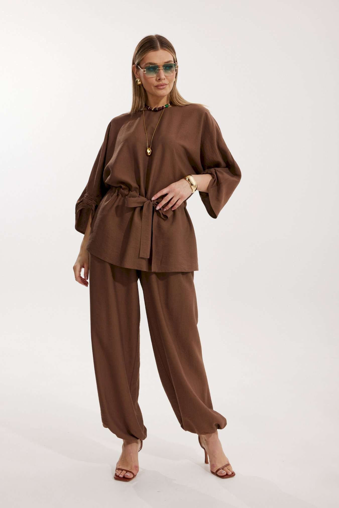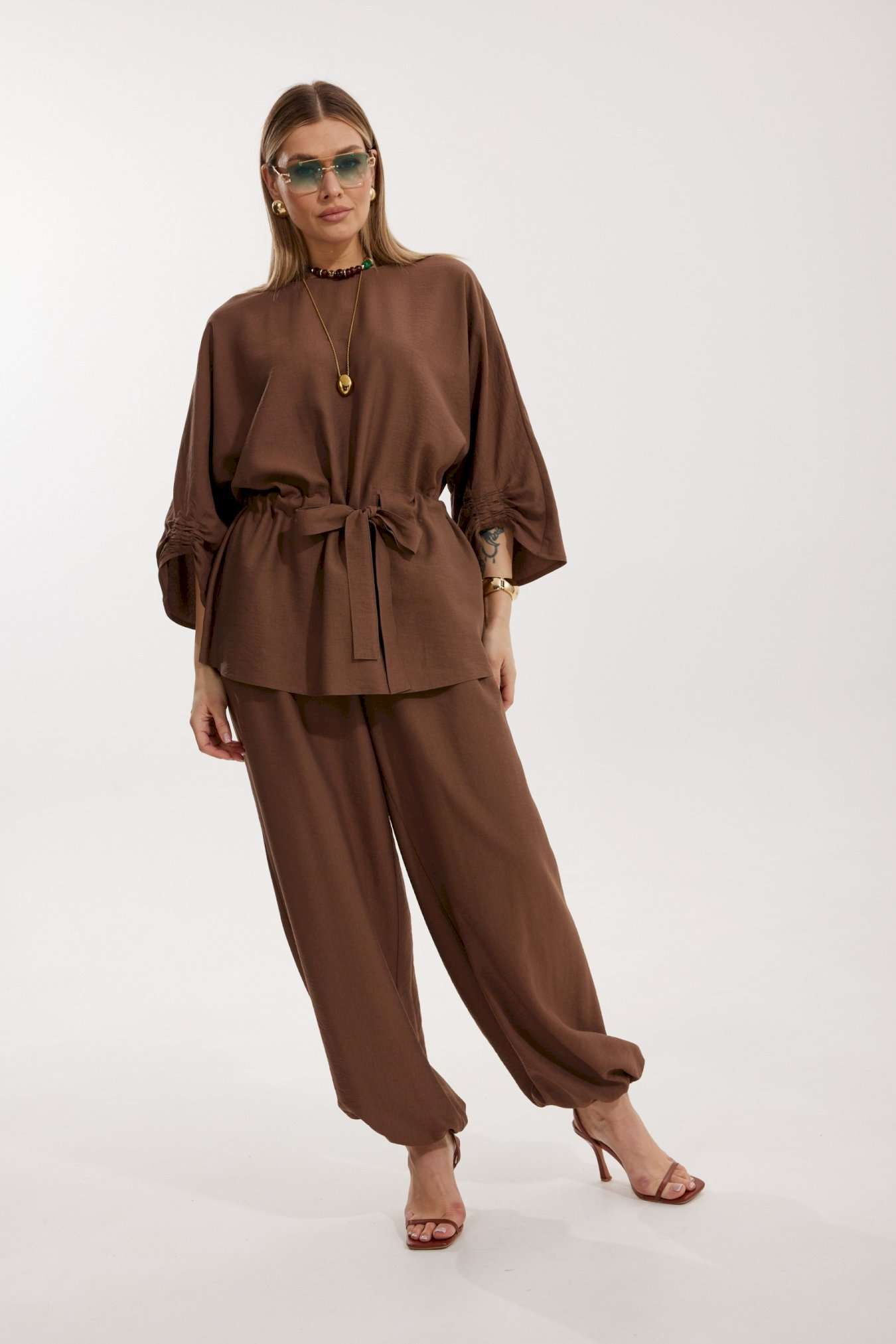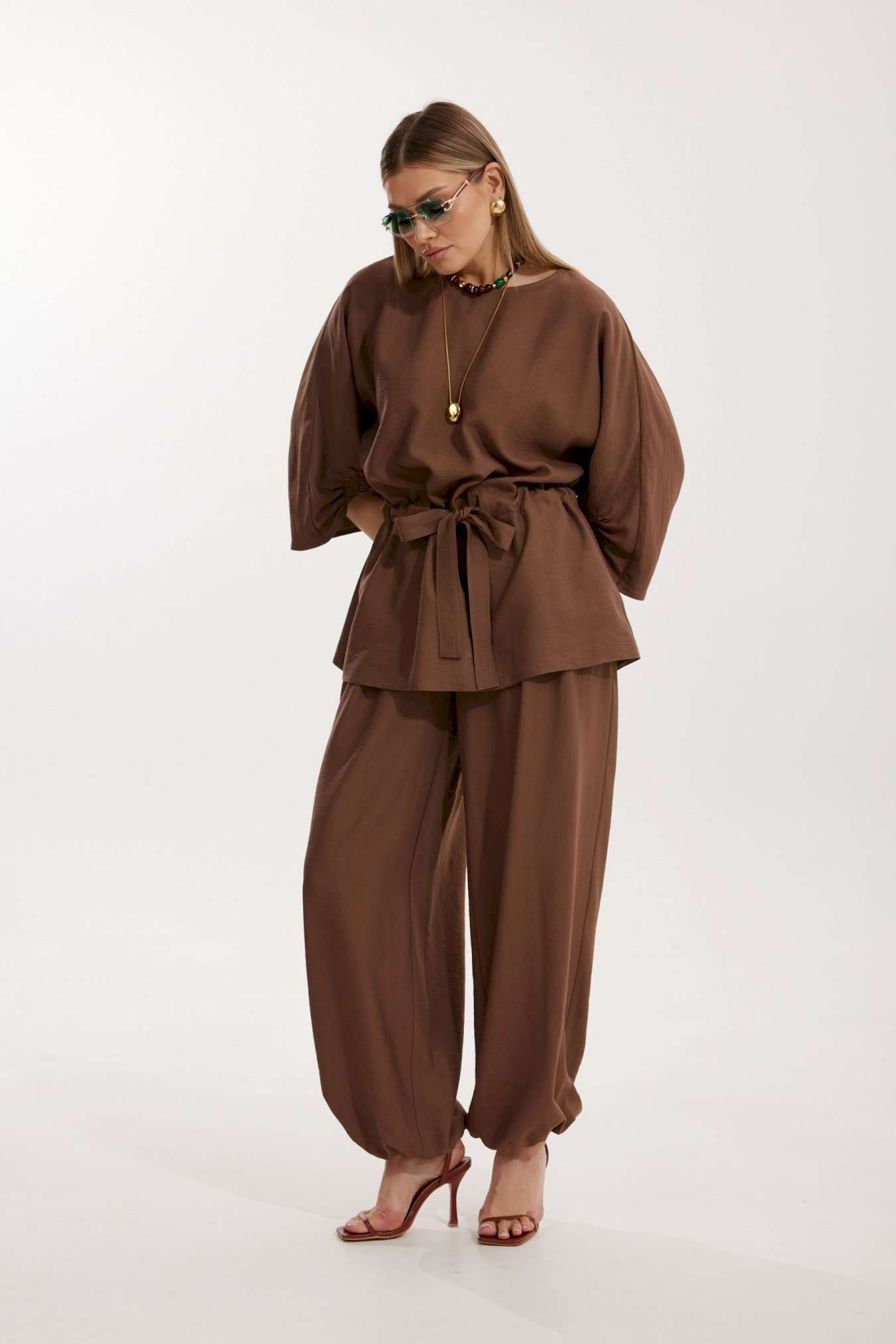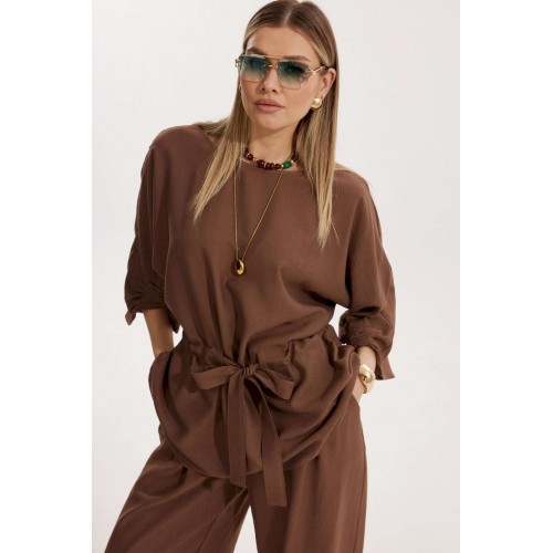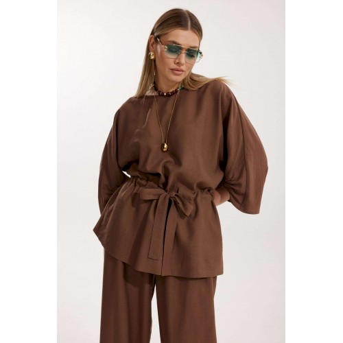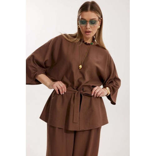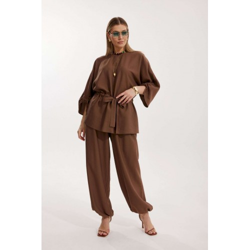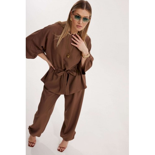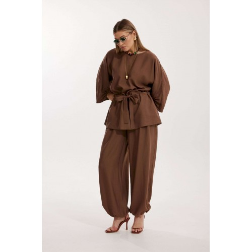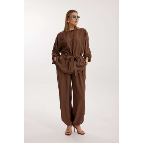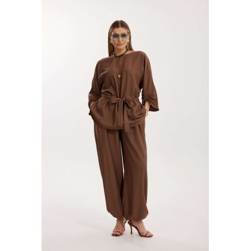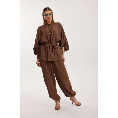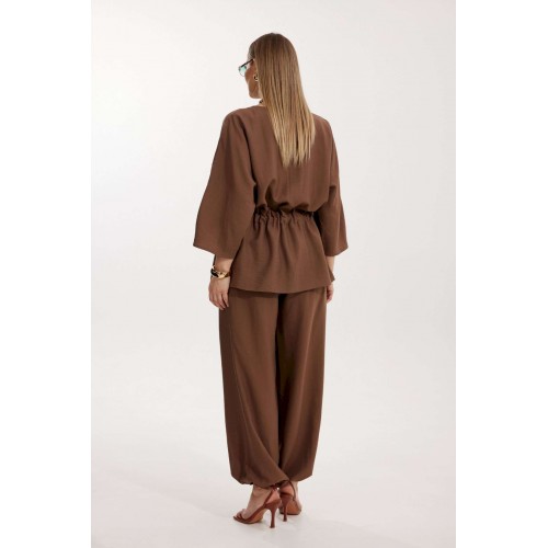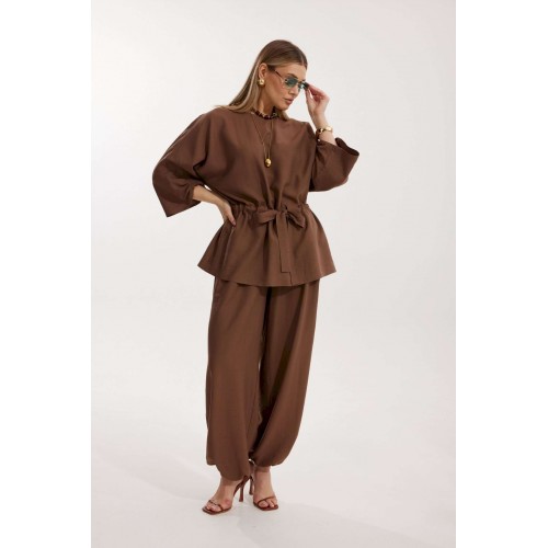 Костюм женский, состоящий из блузы и брюк. Блуза кроя «летучая мышь» длиной за линию бедра. Перед цельный с округлой горловиной. Спинка со средним швом. В районе талии обработана кулиса с широким поясом. По низу рукава по передней части выполнено несколько рядов сборки. Горловина обработана окантовкой. Брюки прямого силуэта с поясом на резинке. По передним половинкам заложены складки и обработаны наклонные карманы с отрезным бочком По низу брюки собраны на резинку. Верхний срез брюк обработан отрезным поясом на частичной резинке.