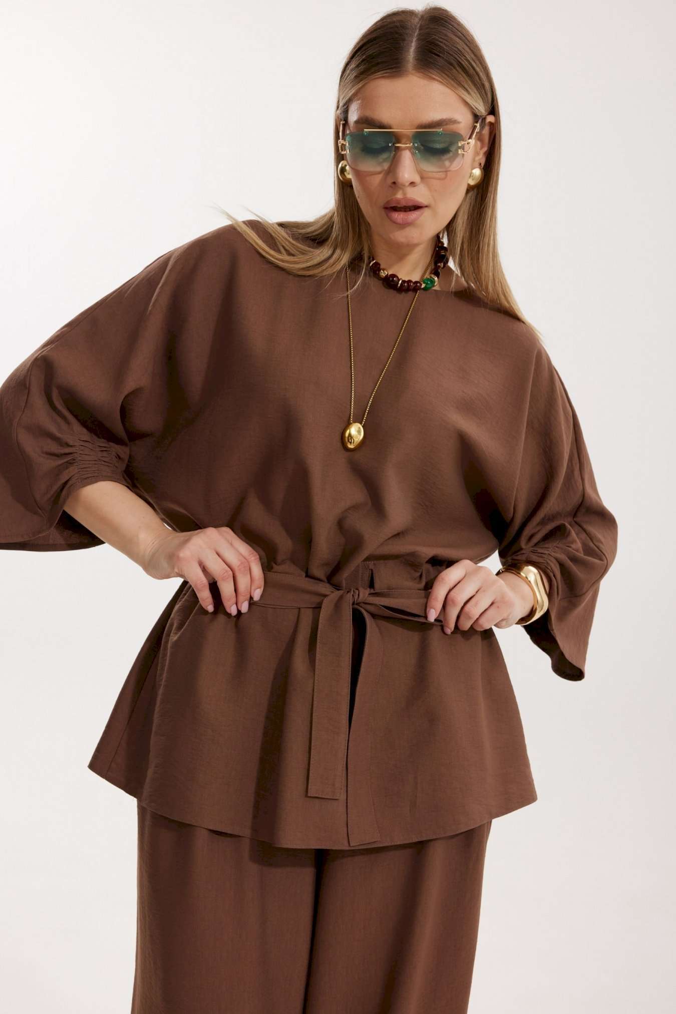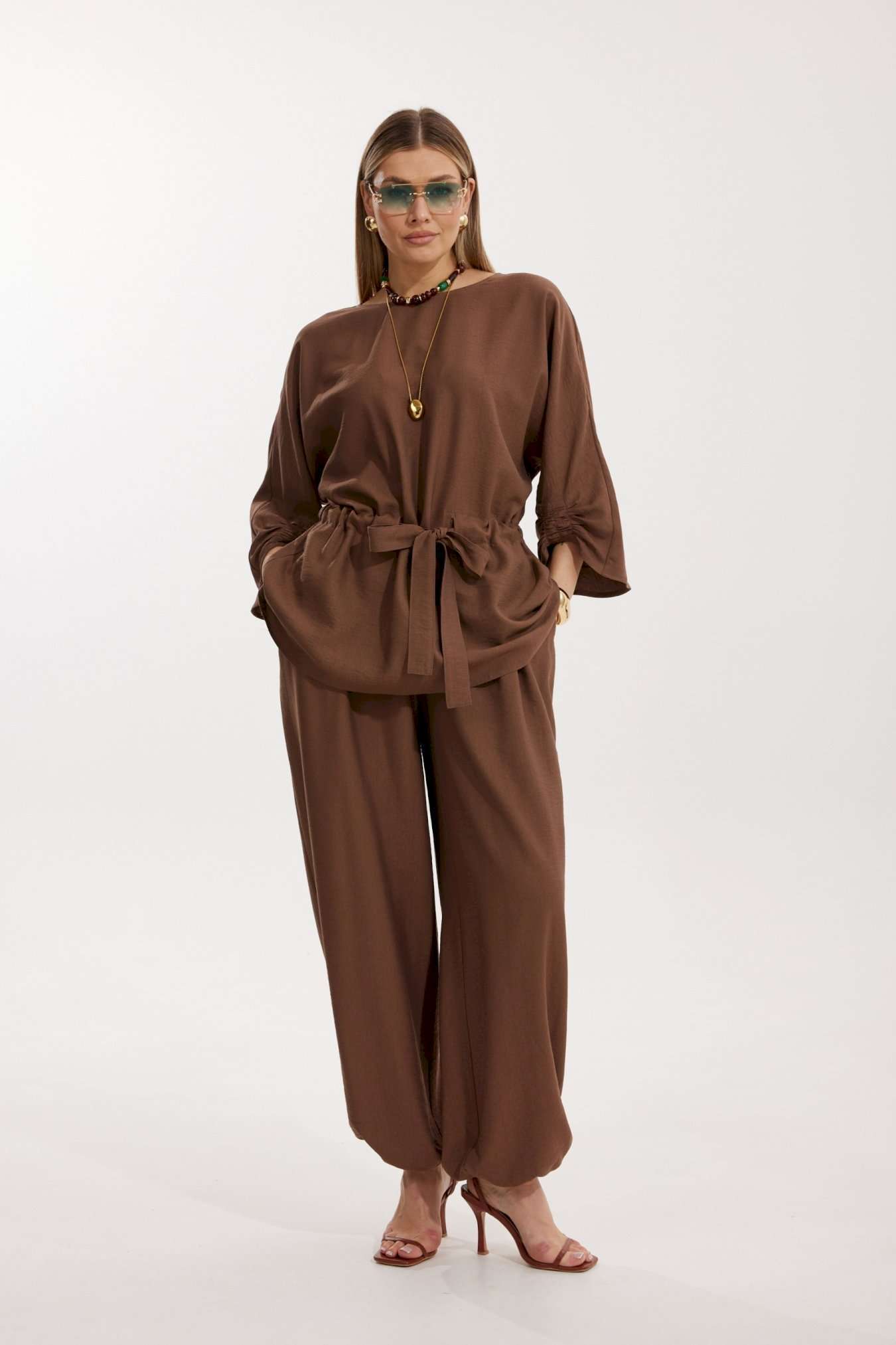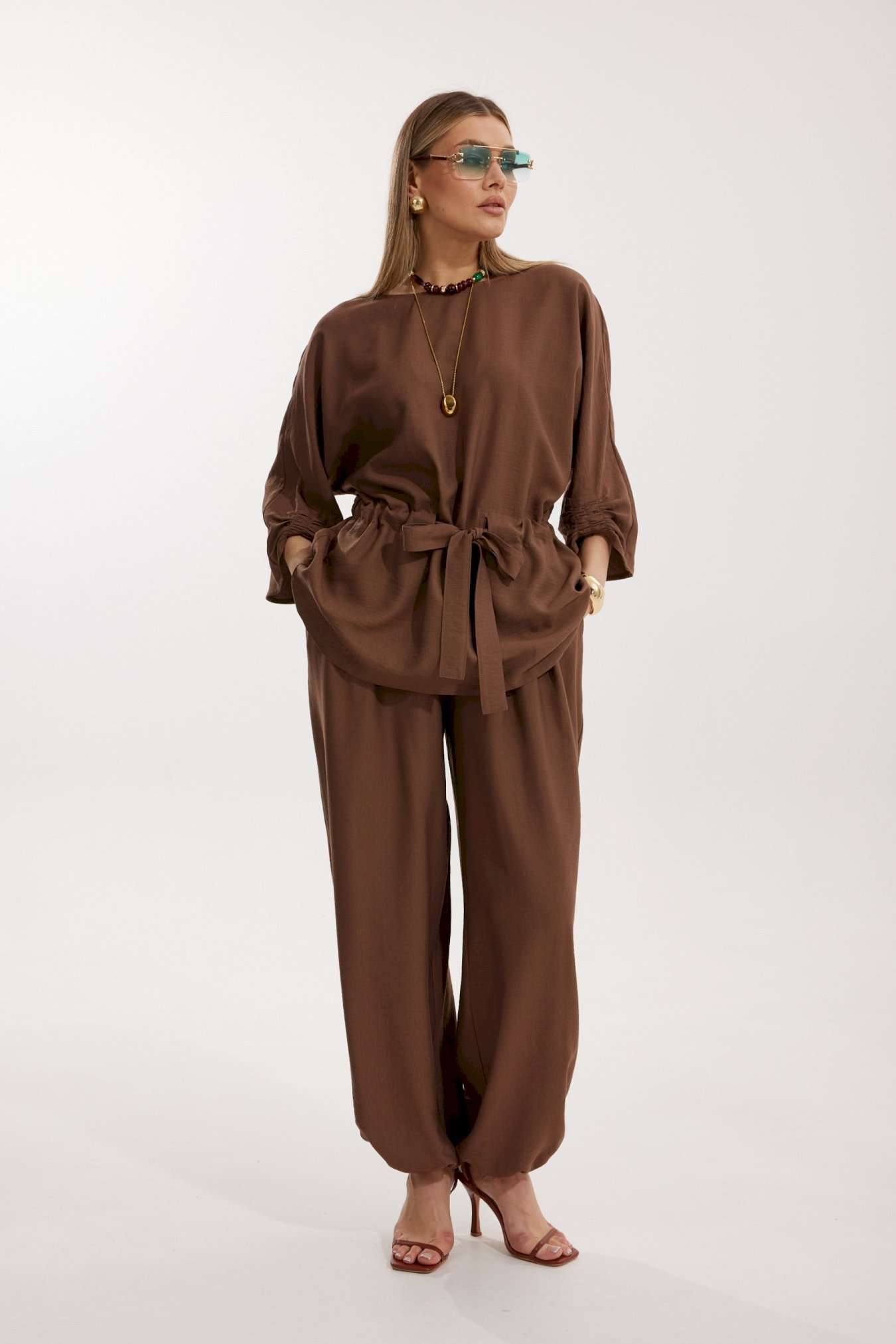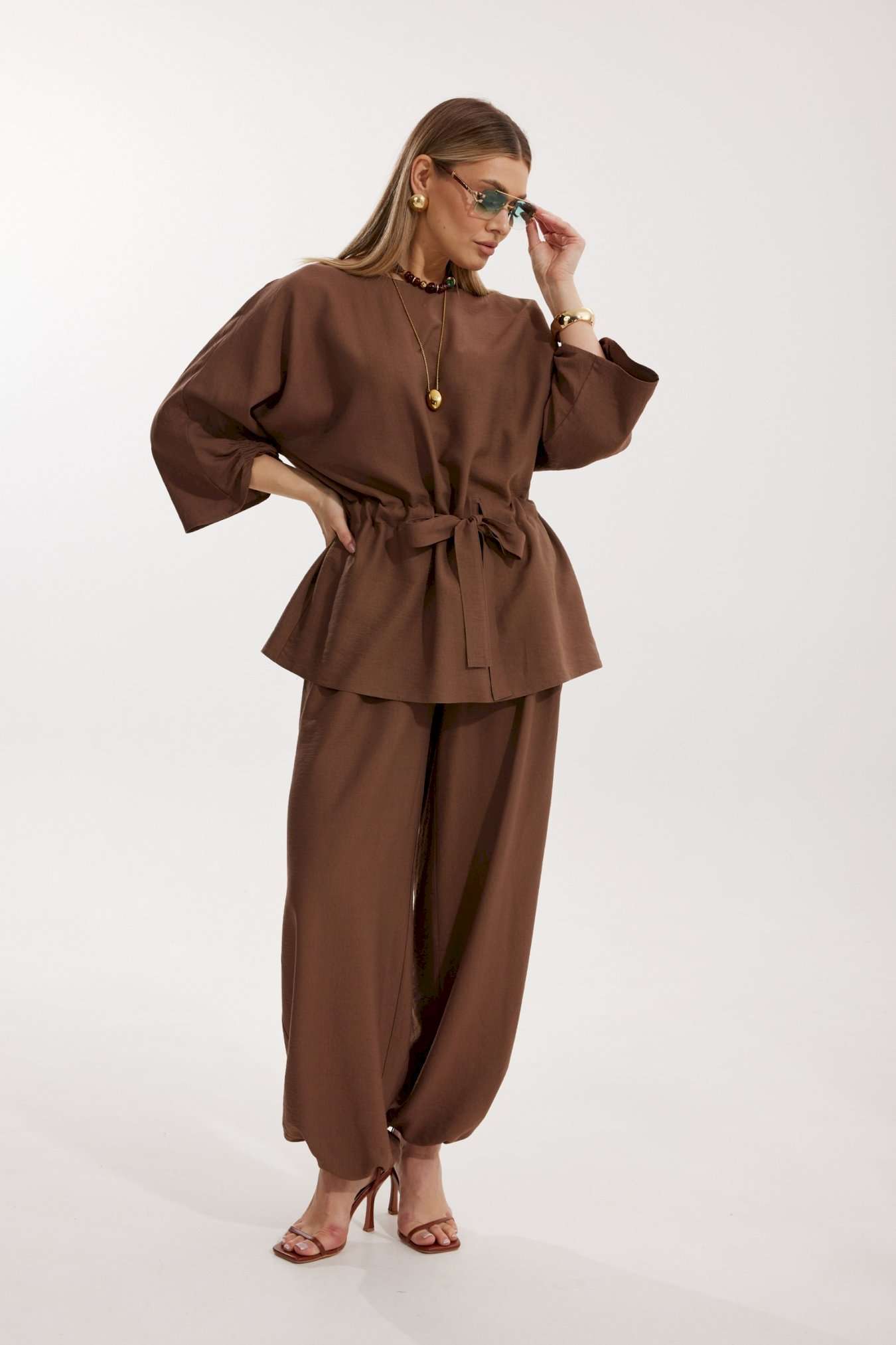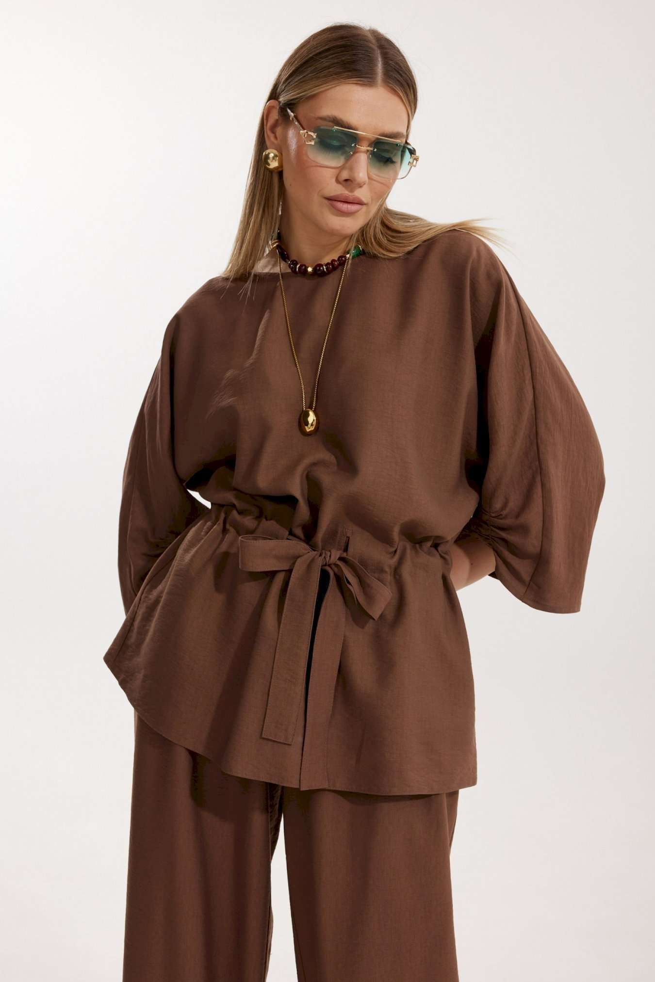 Костюм женский, состоящий из блузы и брюк. Блуза кроя «летучая мышь» длиной за линию бедра. Перед цельный с округлой горловиной. Спинка со средним швом. В районе талии обработана кулиса с широким поясом. По низу рукава по передней части выполнено несколько рядов сборки. Горловина обработана окантовкой. Брюки прямого силуэта с поясом на резинке. По передним половинкам заложены складки и обработаны наклонные карманы с отрезным бочком По низу брюки собраны на резинку. Верхний срез брюк обработан отрезным поясом на частичной резинке.