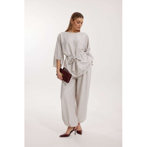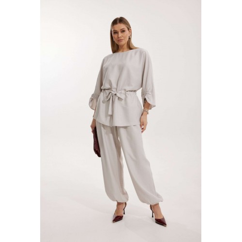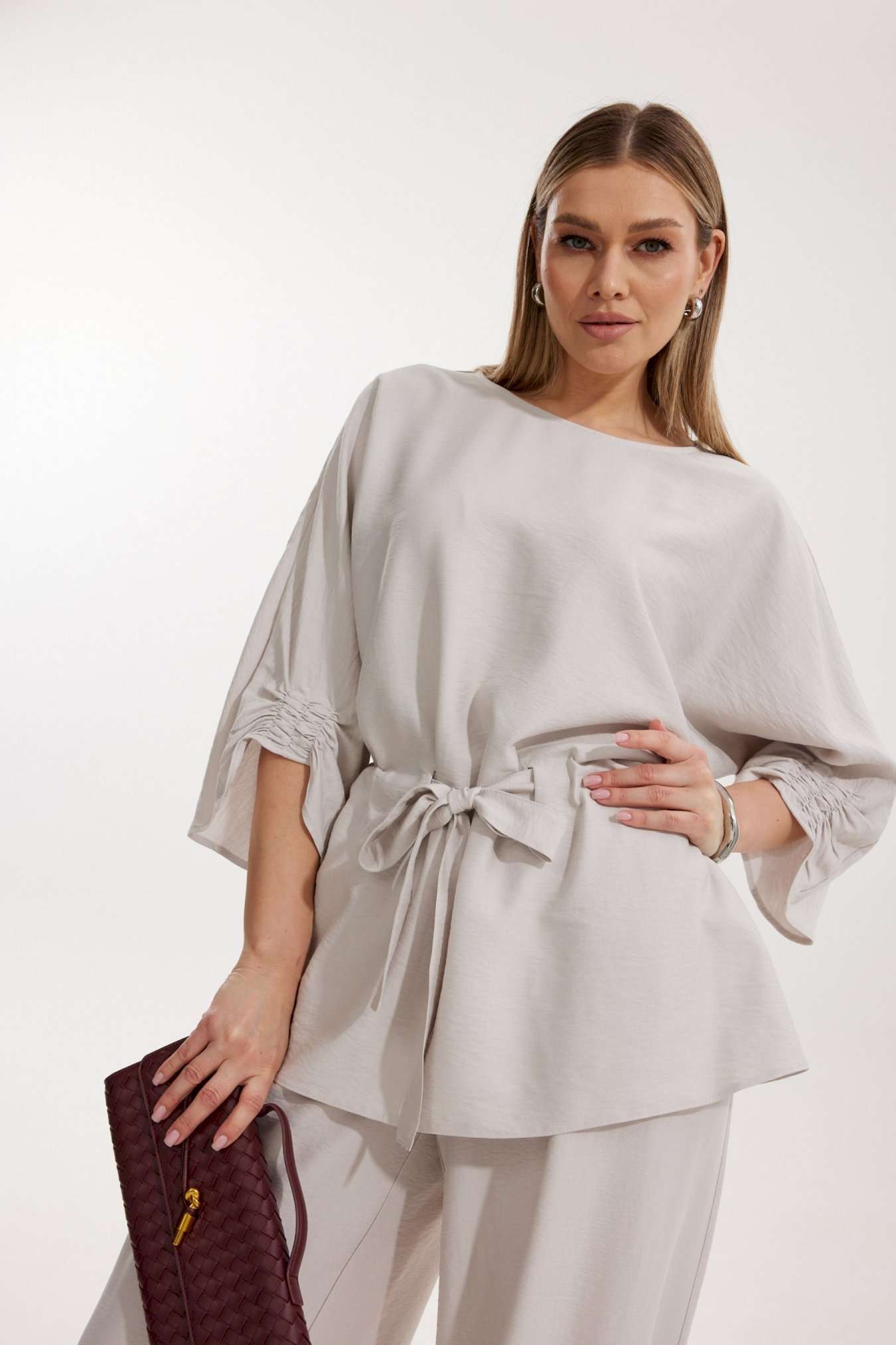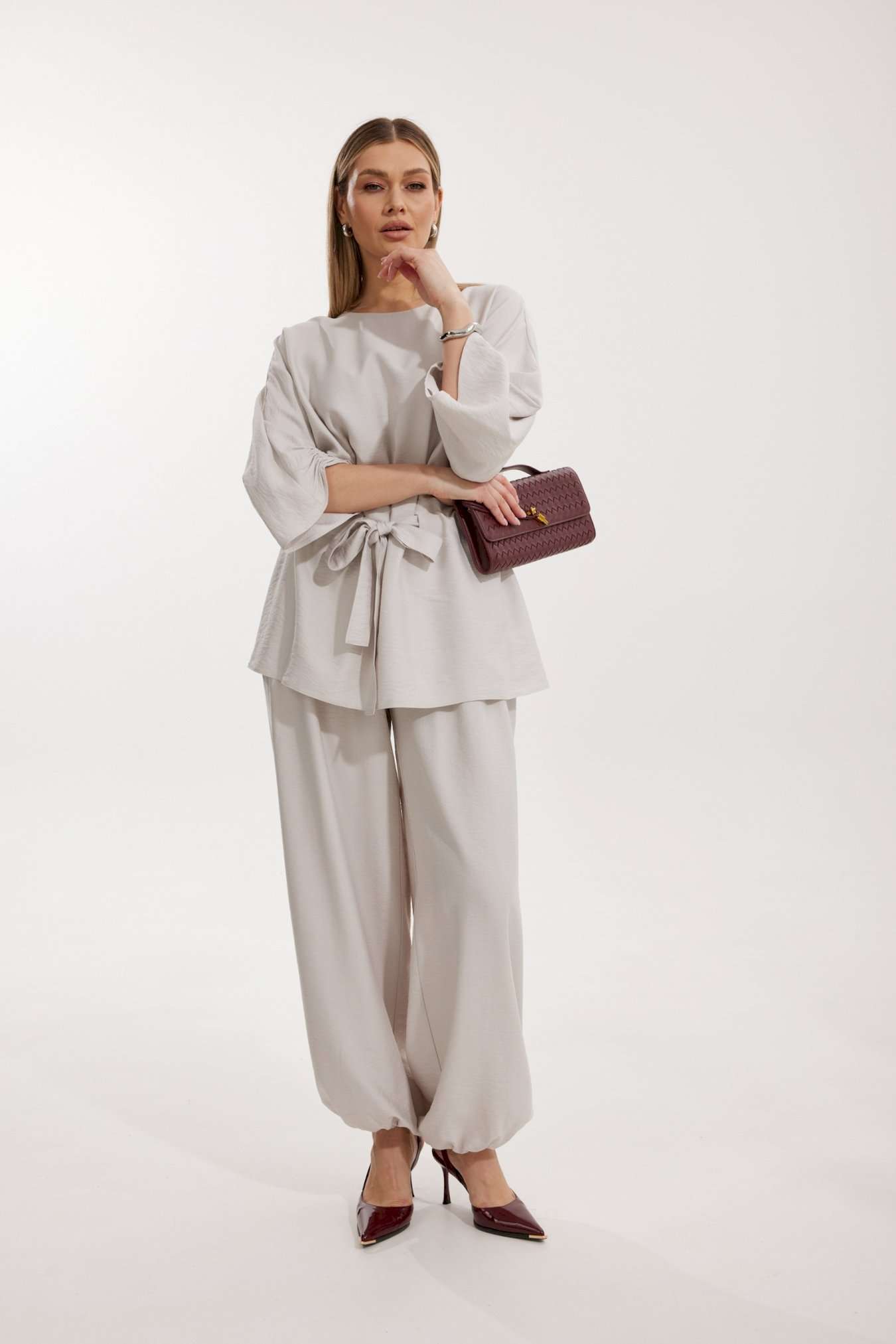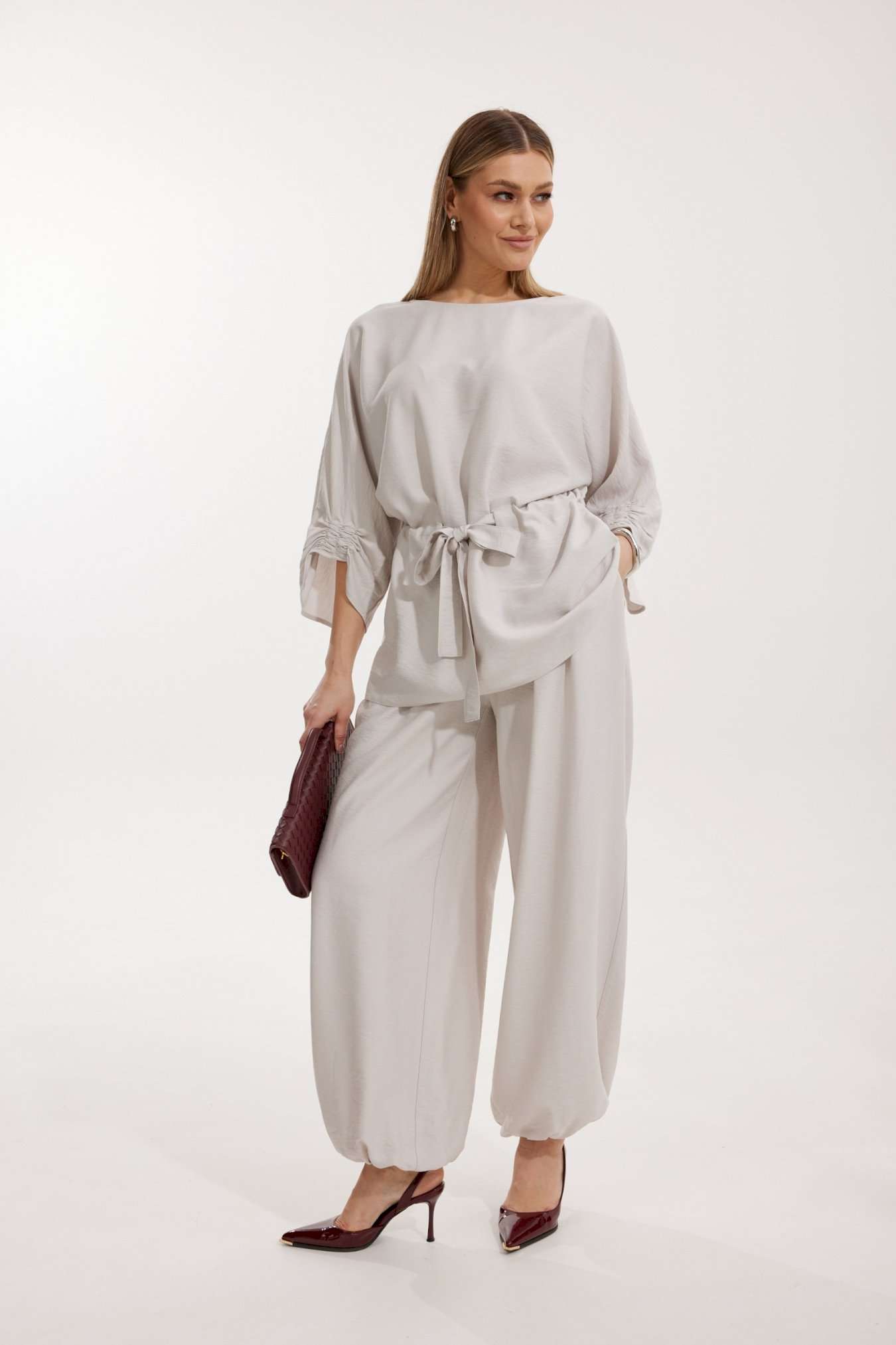 Костюм женский, состоящий из блузы и брюк. Блуза кроя «летучая мышь» длиной за линию бедра. Перед цельный с округлой горловиной. Спинка со средним швом. В районе талии обработана кулиса с широким поясом. По низу рукава по передней части выполнено несколько рядов сборки. Горловина обработана окантовкой. Брюки прямого силуэта с поясом на резинке. По передним половинкам заложены складки и обработаны наклонные карманы с отрезным бочком По низу брюки собраны на резинку. Верхний срез брюк обработан отрезным поясом на частичной резинке.