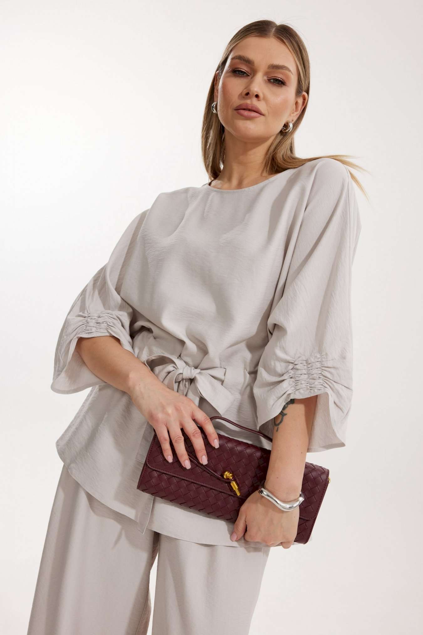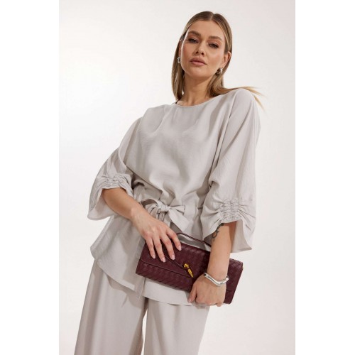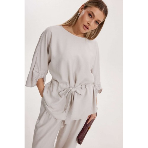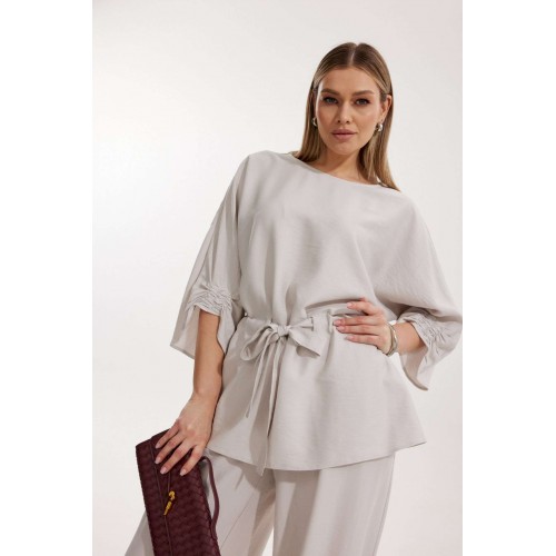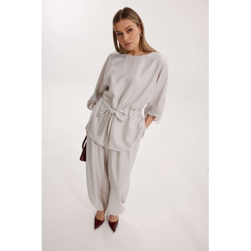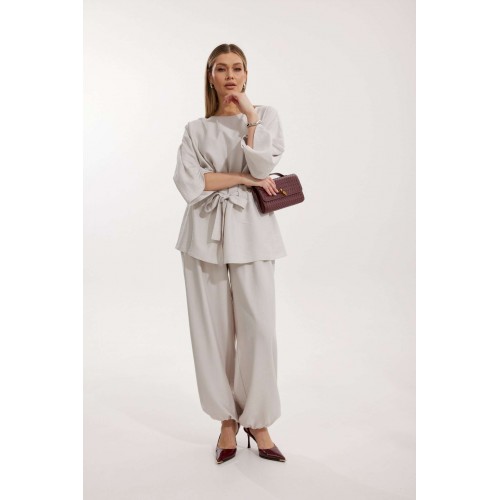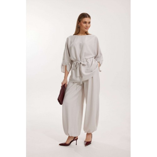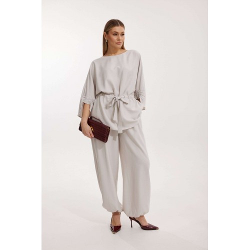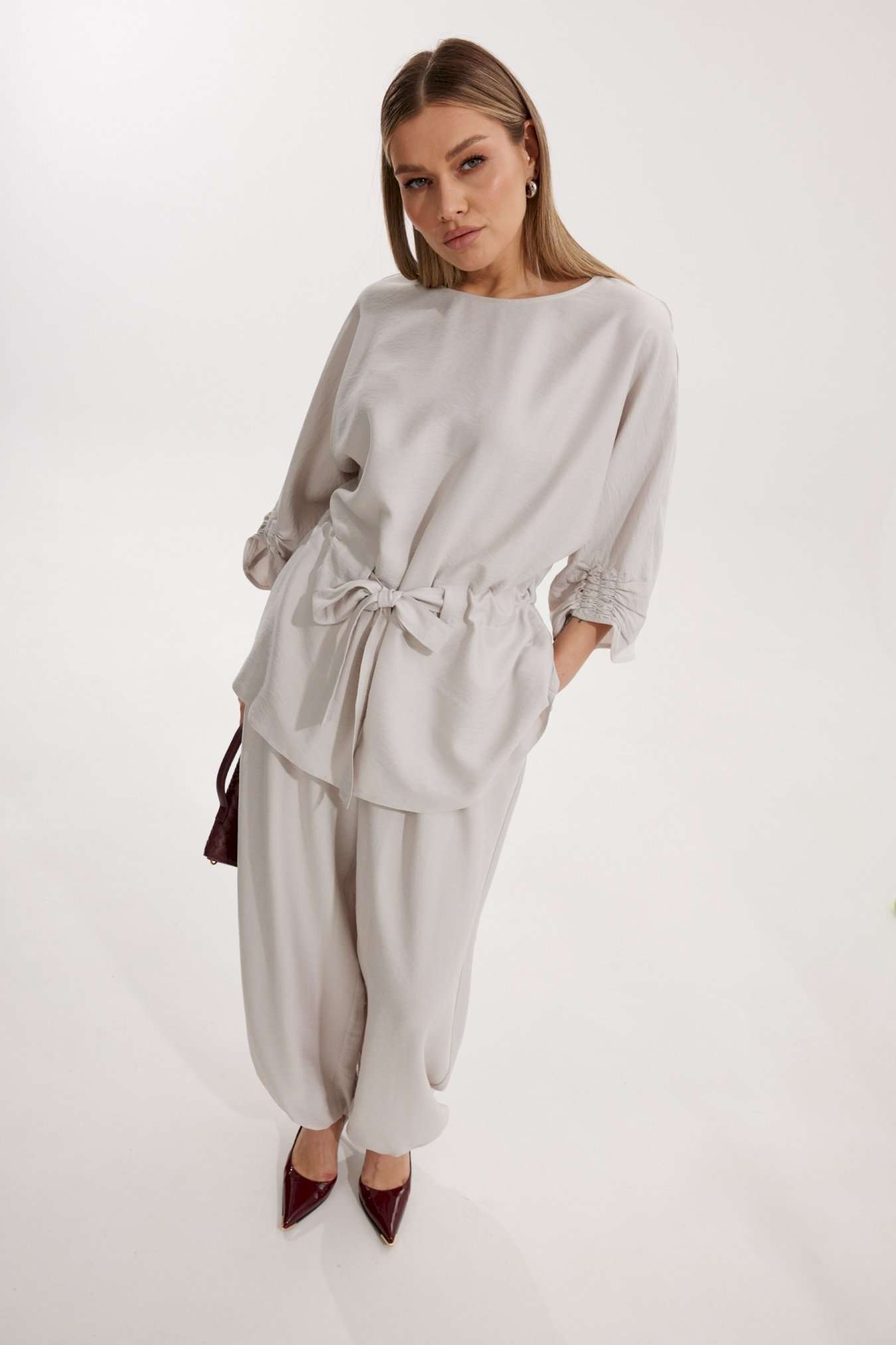 Костюм женский, состоящий из блузы и брюк. Блуза кроя «летучая мышь» длиной за линию бедра. Перед цельный с округлой горловиной. Спинка со средним швом. В районе талии обработана кулиса с широким поясом. По низу рукава по передней части выполнено несколько рядов сборки. Горловина обработана окантовкой. Брюки прямого силуэта с поясом на резинке. По передним половинкам заложены складки и обработаны наклонные карманы с отрезным бочком По низу брюки собраны на резинку. Верхний срез брюк обработан отрезным поясом на частичной резинке.