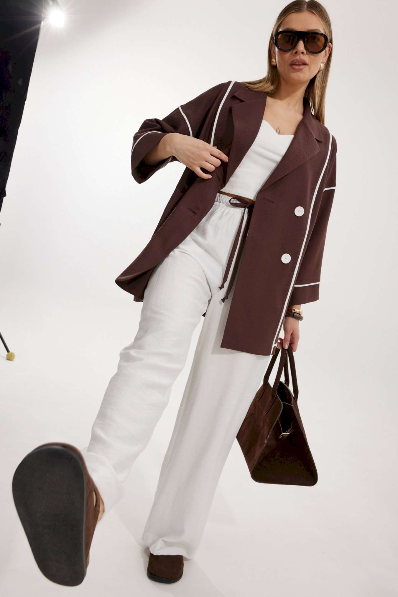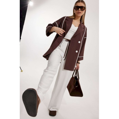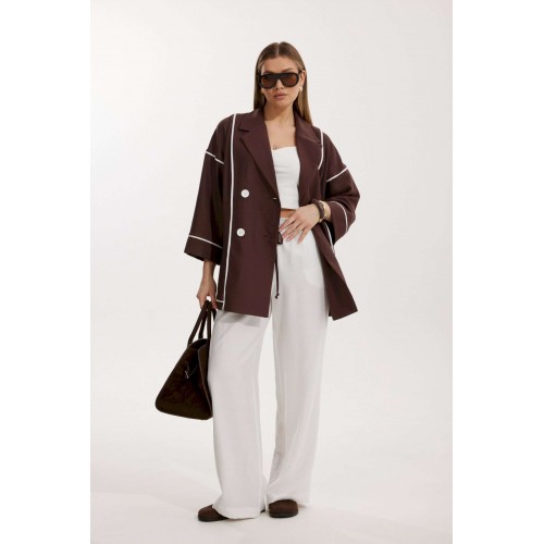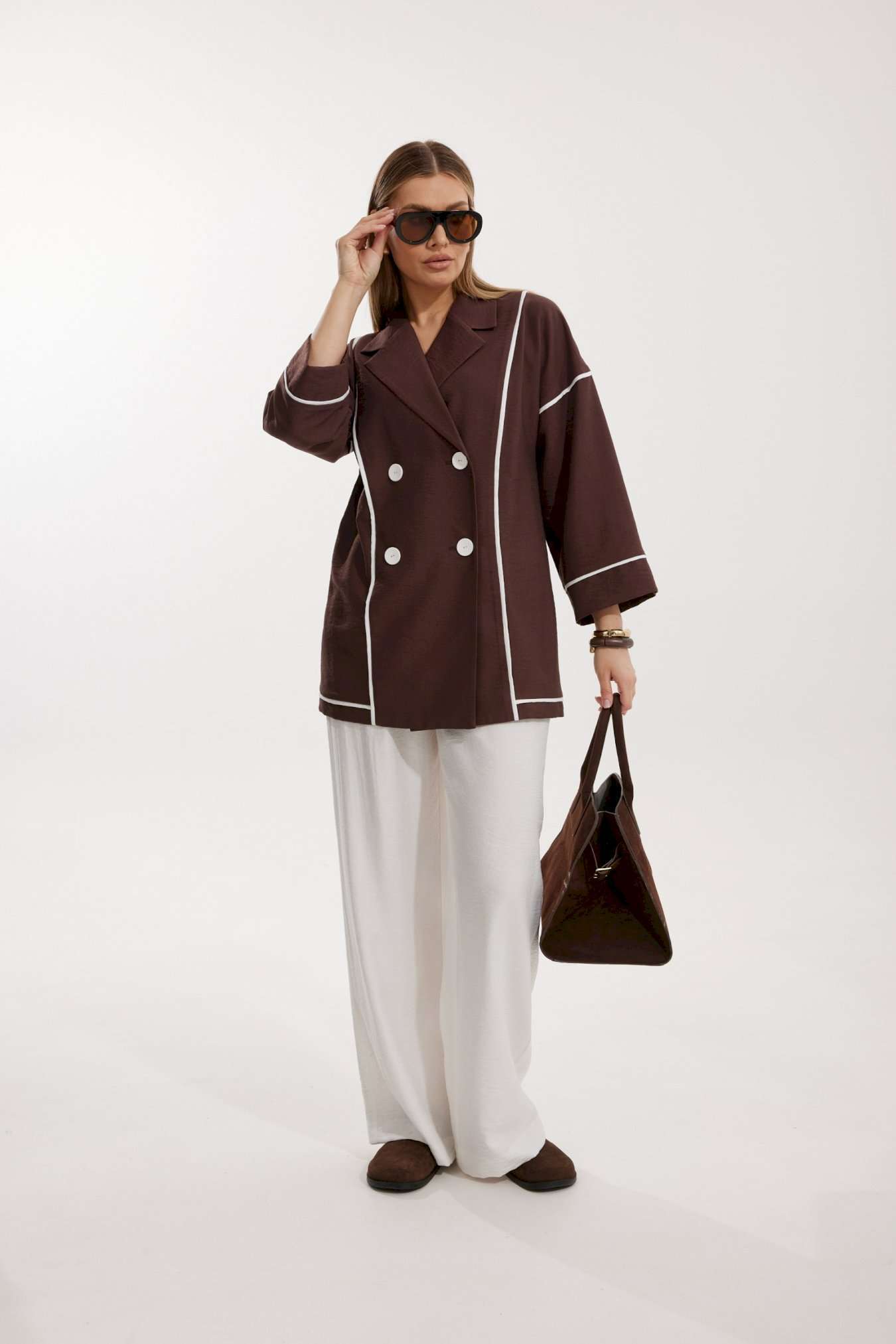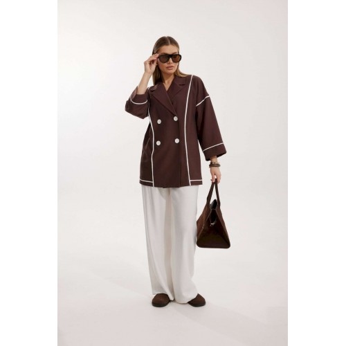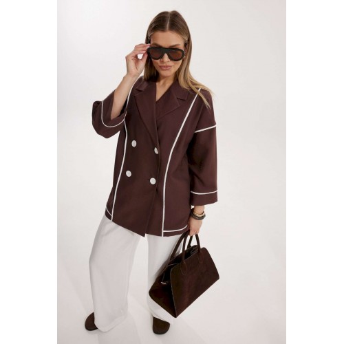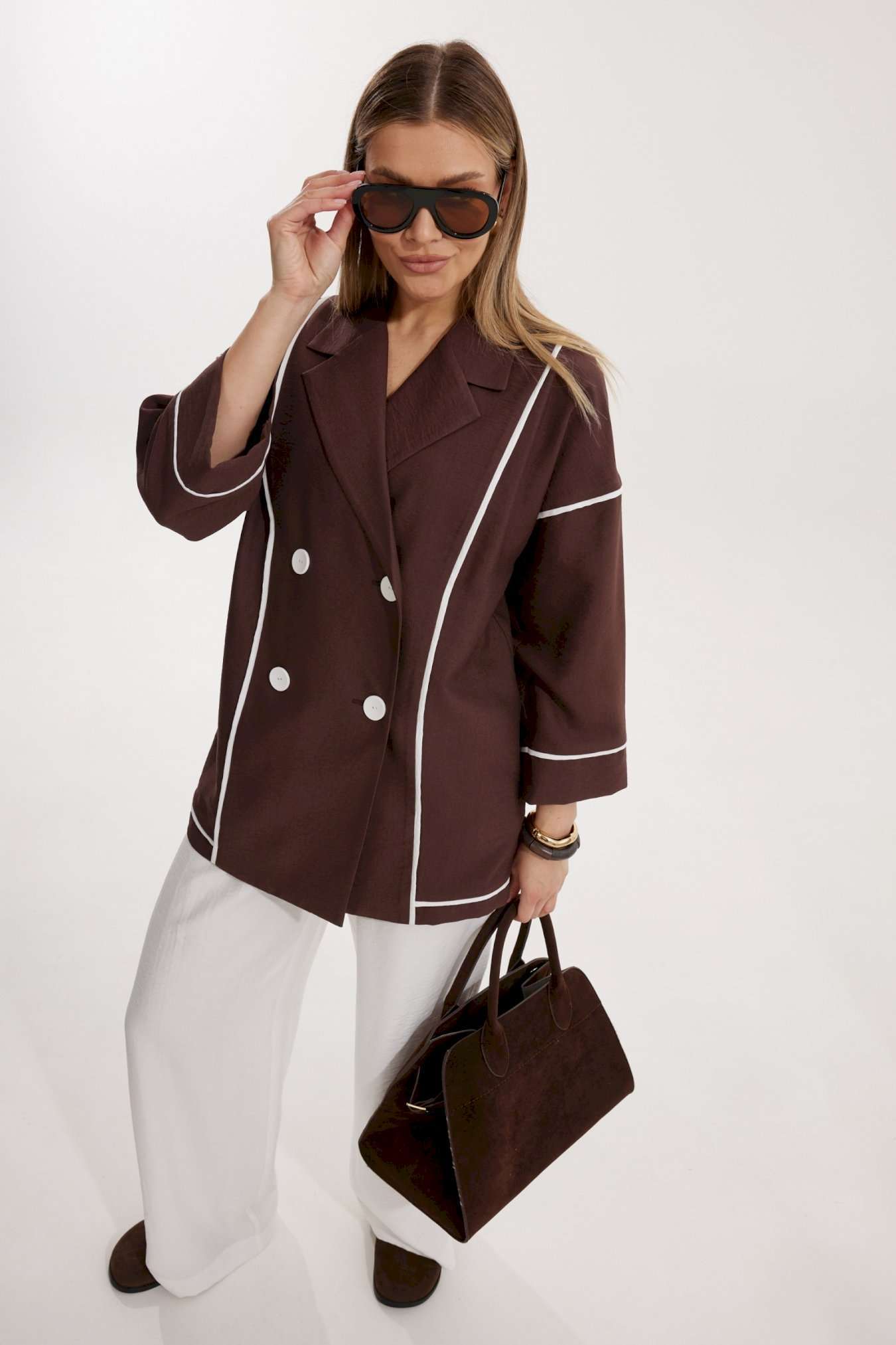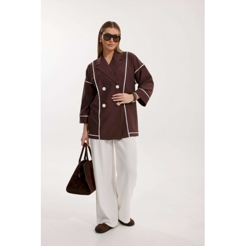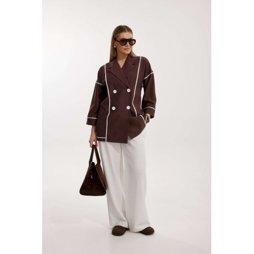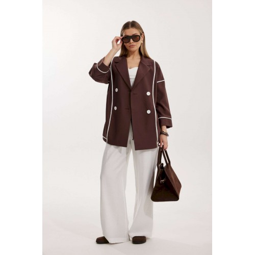Жакет женский двубортный без подкладки прямого силуэта со спущенной линией плеча длиной за линию бедра. Перед жакета состоит из центральной и боковой части, между ними вставлен отделочный кант контрастного цвета. Спинка состоит из центральной и боковых деталей, в швах располагаются детали канта, контрастного цвета. Рукав втачной одношовный, по низу рукава пришита отрезная манжета, в швах располагается контрастный кант. Горловина обработана отрезным воротником с лацканом. Застежка двубортная на отделочные контрастные пуговицы. Брюки контрастного цвета прямого силуэта с карманами в боковом шве и имитацией гульфика. На задних половинках брюк застрочены вытачки. Пояс притачной на резинке со шнуром в цвет отделочного канта.