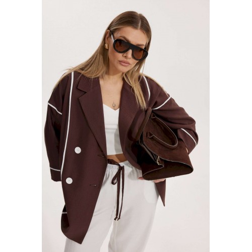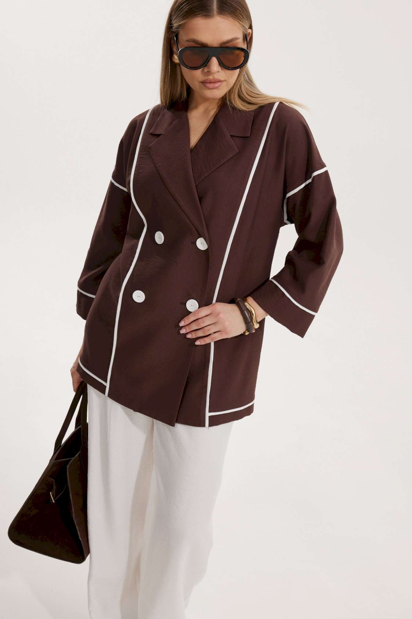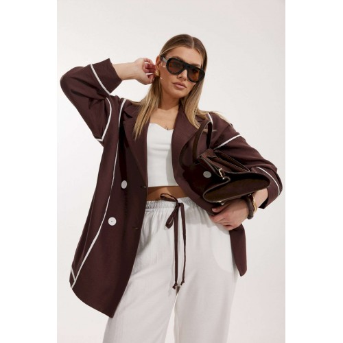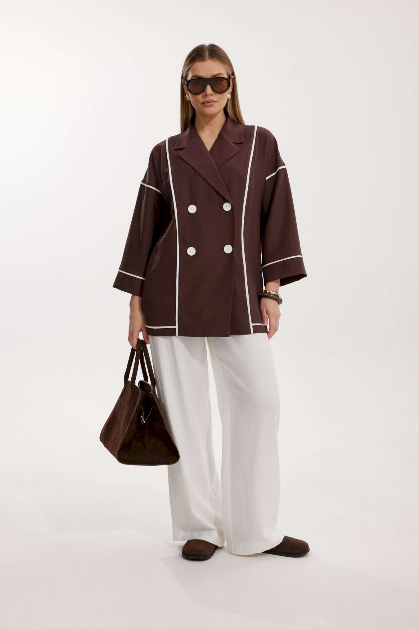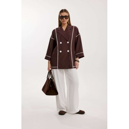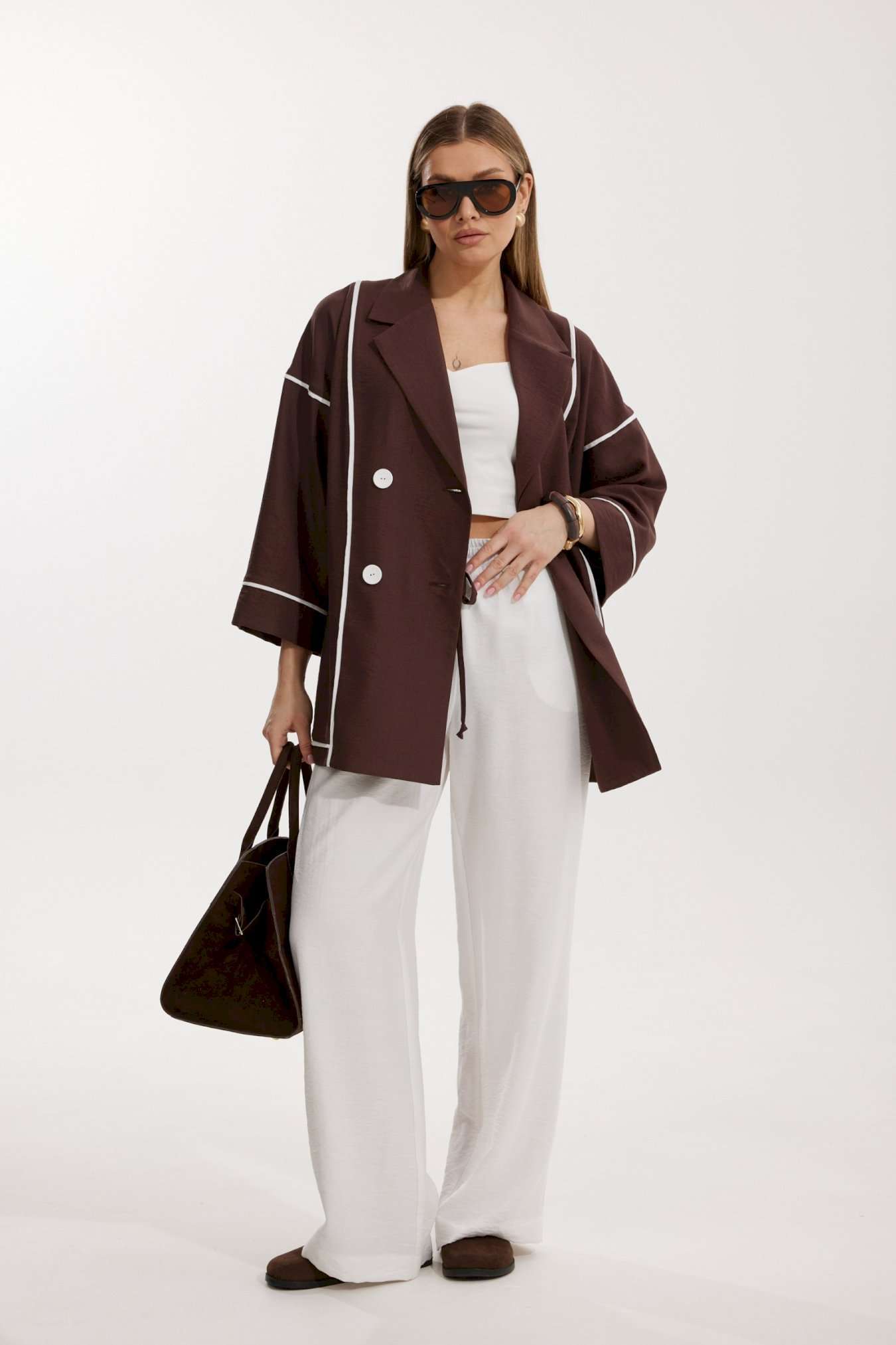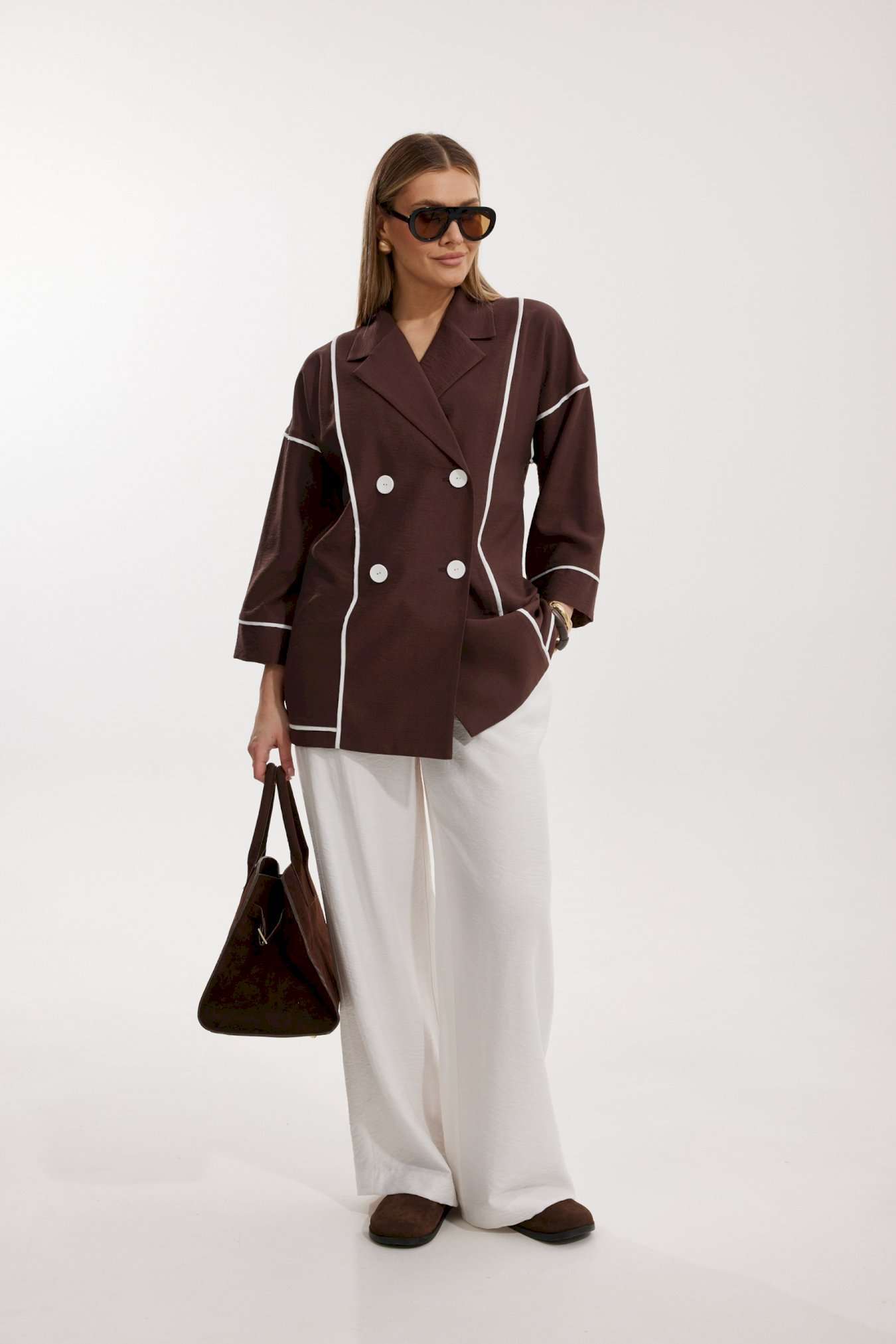 Жакет женский двубортный без подкладки прямого силуэта со спущенной линией плеча длиной за линию бедра. Перед жакета состоит из центральной и боковой части, между ними вставлен отделочный кант контрастного цвета. Спинка состоит из центральной и боковых деталей, в швах располагаются детали канта, контрастного цвета. Рукав втачной одношовный, по низу рукава пришита отрезная манжета, в швах располагается контрастный кант. Горловина обработана отрезным воротником с лацканом. Застежка двубортная на отделочные контрастные пуговицы. Брюки контрастного цвета прямого силуэта с карманами в боковом шве и имитацией гульфика. На задних половинках брюк застрочены вытачки. Пояс притачной на резинке со шнуром в цвет отделочного канта.
