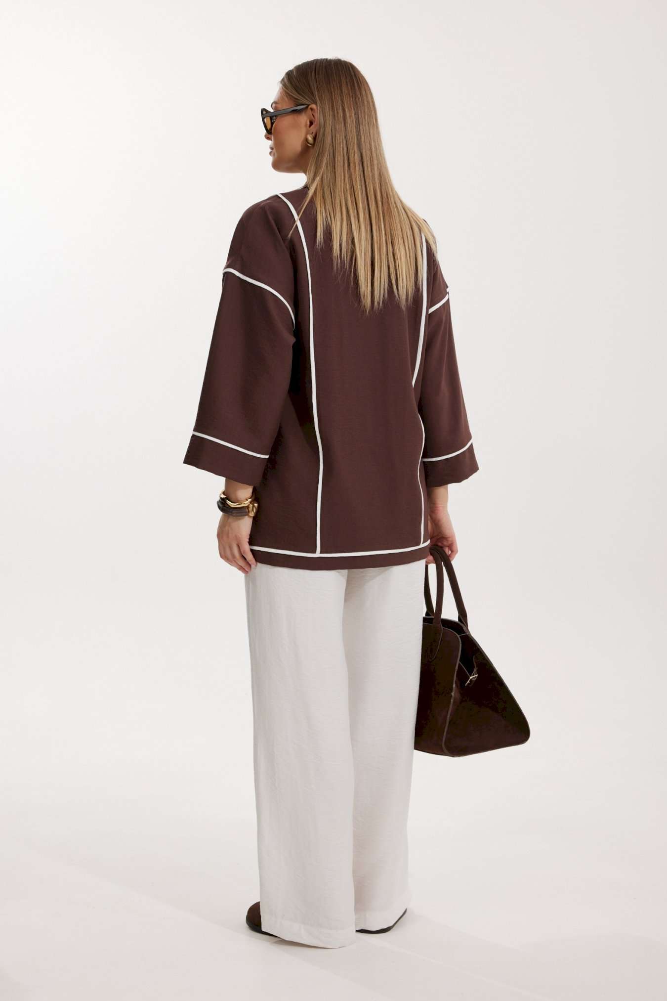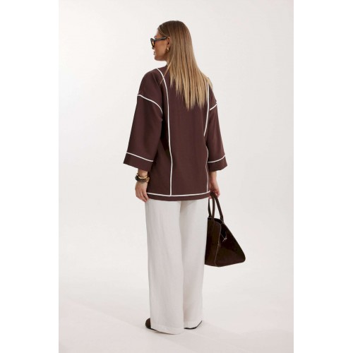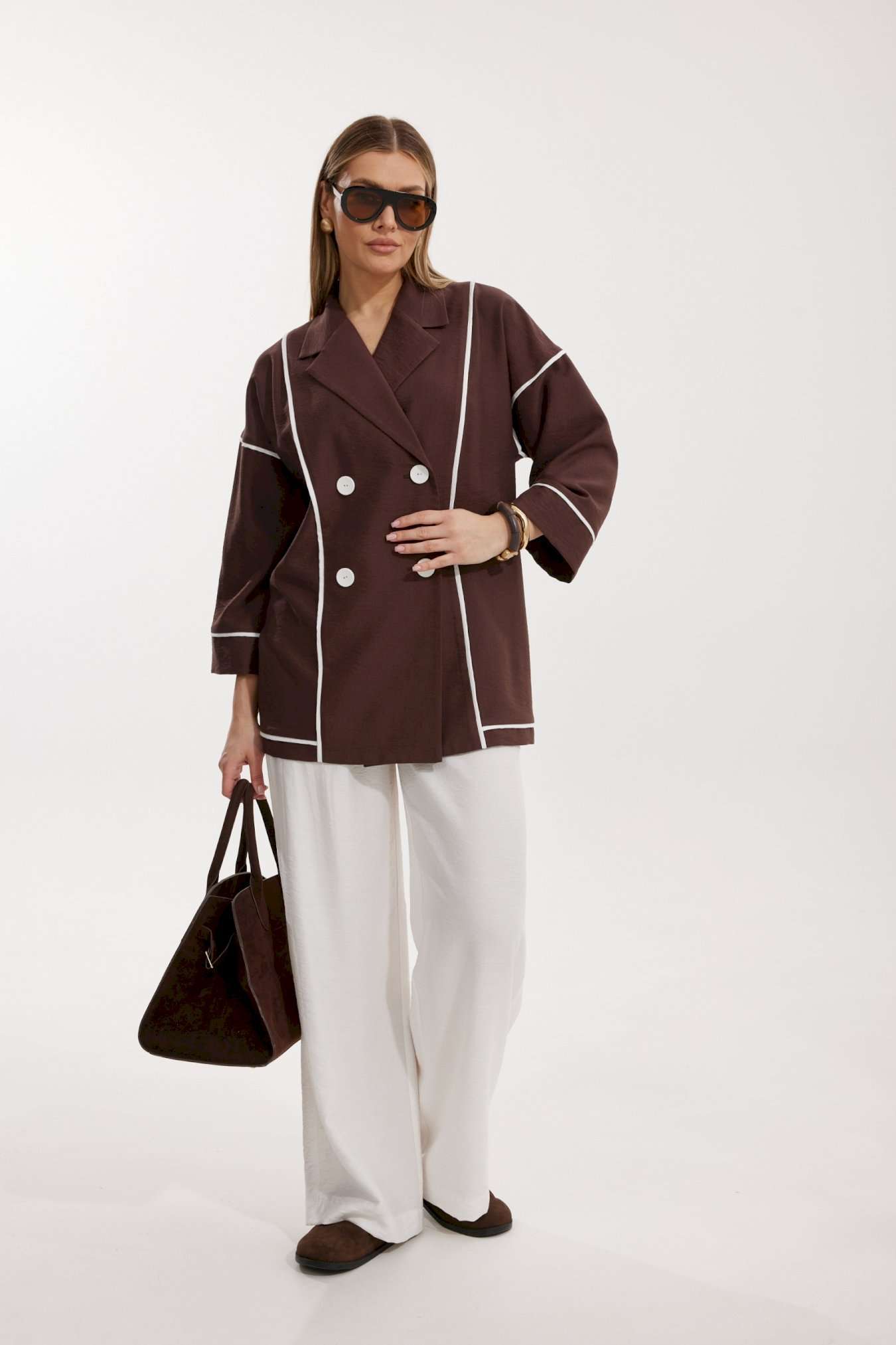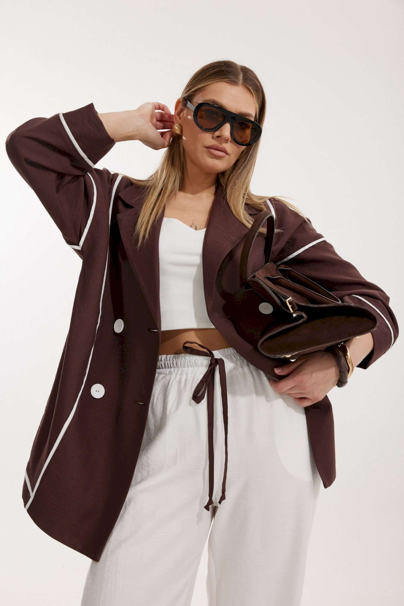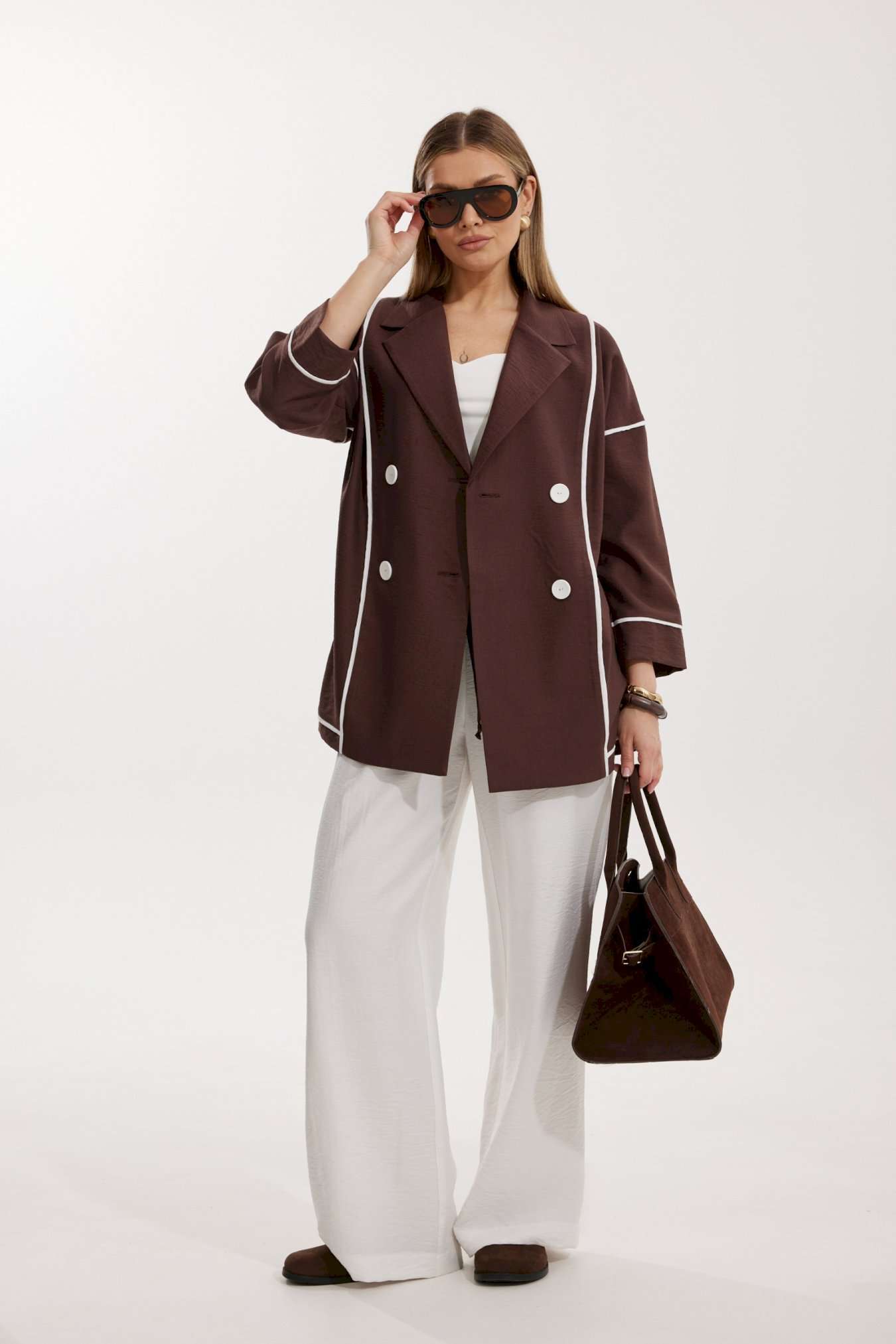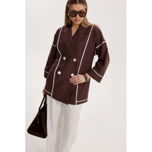 Жакет женский двубортный без подкладки прямого силуэта со спущенной линией плеча длиной за линию бедра. Перед жакета состоит из центральной и боковой части, между ними вставлен отделочный кант контрастного цвета. Спинка состоит из центральной и боковых деталей, в швах располагаются детали канта, контрастного цвета. Рукав втачной одношовный, по низу рукава пришита отрезная манжета, в швах располагается контрастный кант. Горловина обработана отрезным воротником с лацканом. Застежка двубортная на отделочные контрастные пуговицы. Брюки контрастного цвета прямого силуэта с карманами в боковом шве и имитацией гульфика. На задних половинках брюк застрочены вытачки. Пояс притачной на резинке со шнуром в цвет отделочного канта.