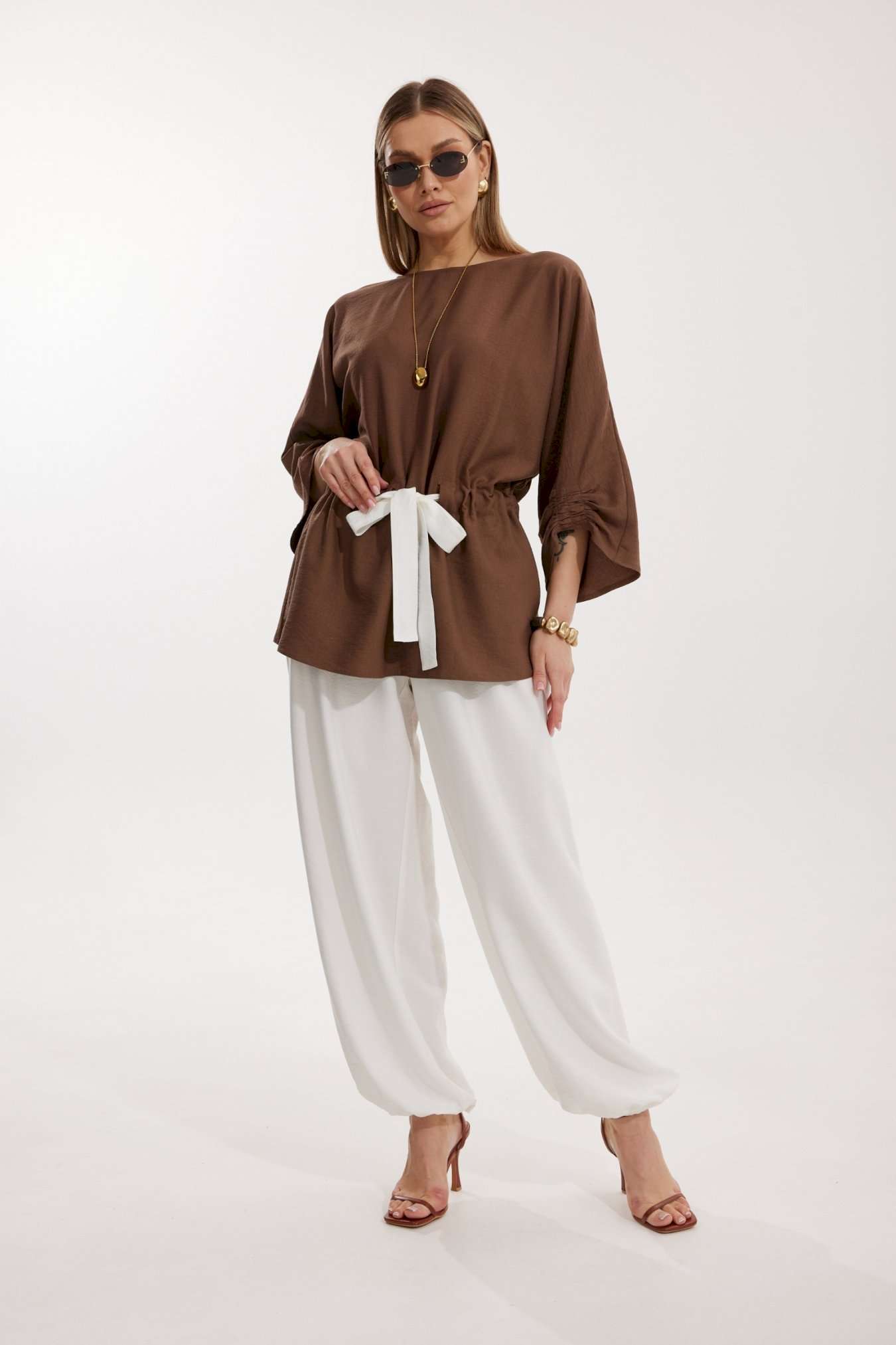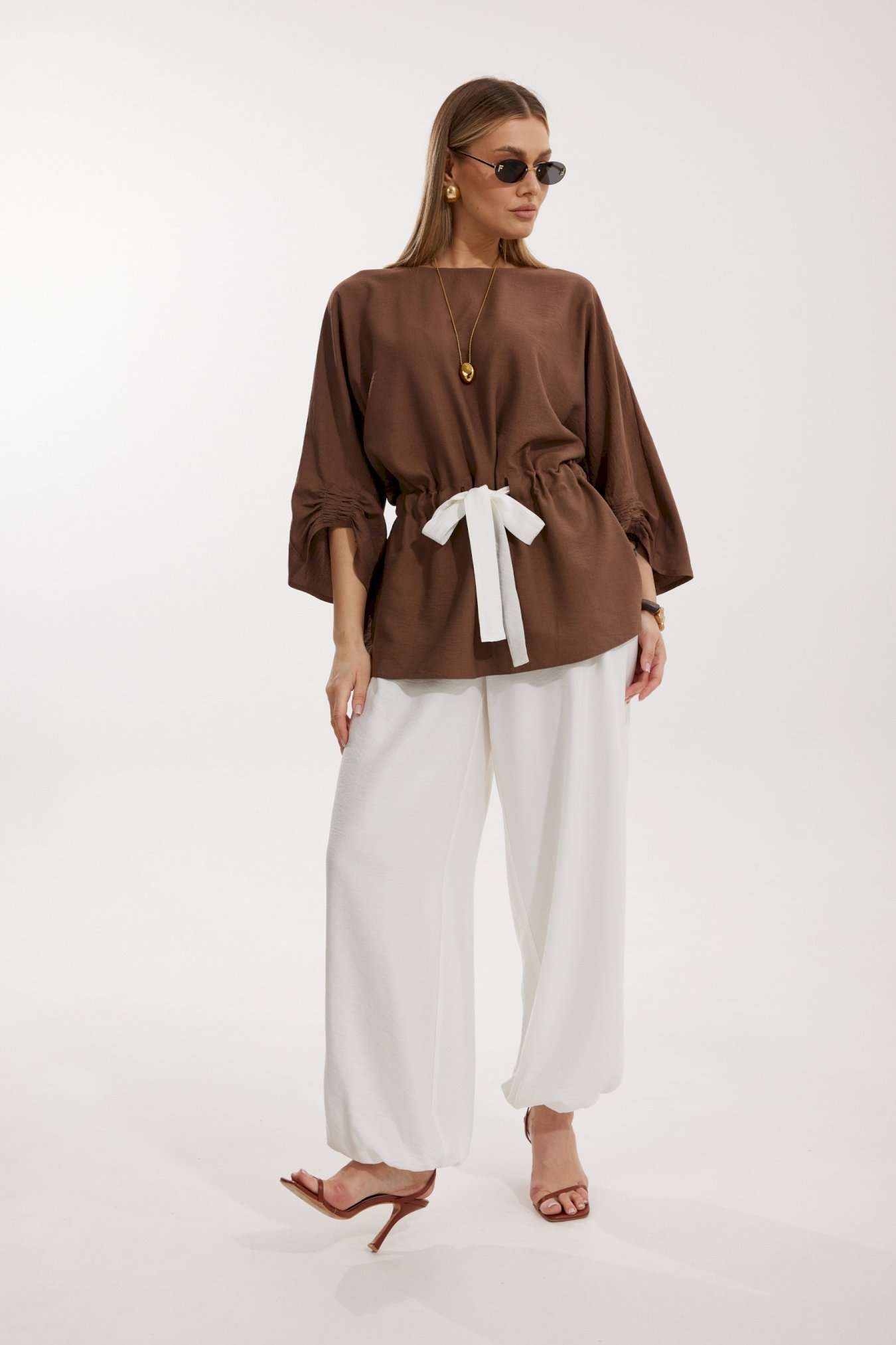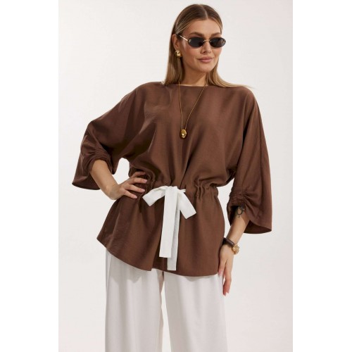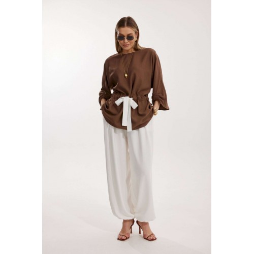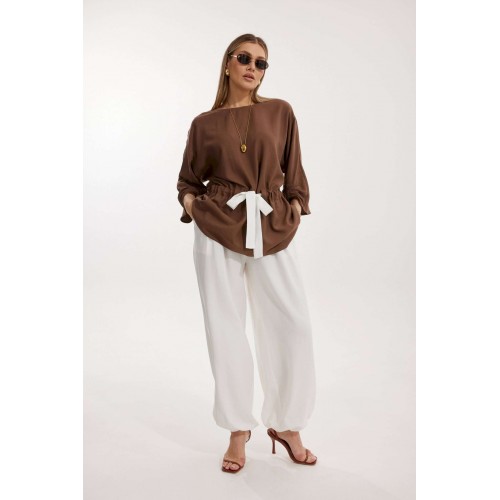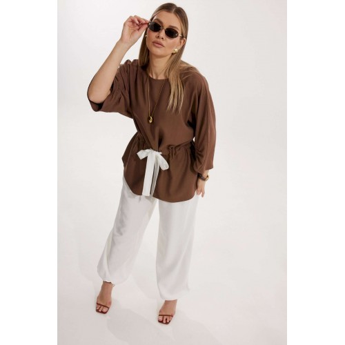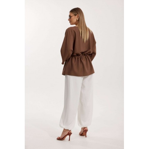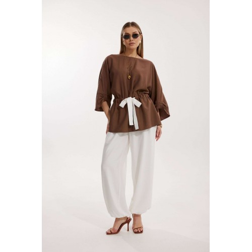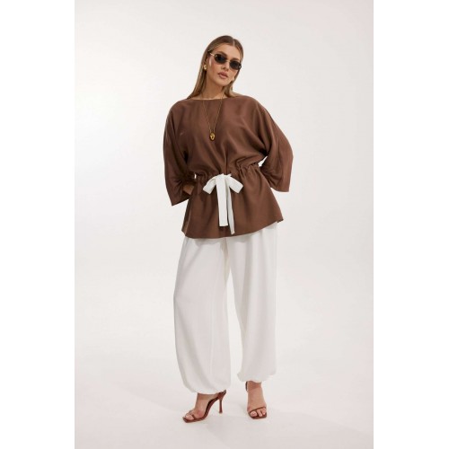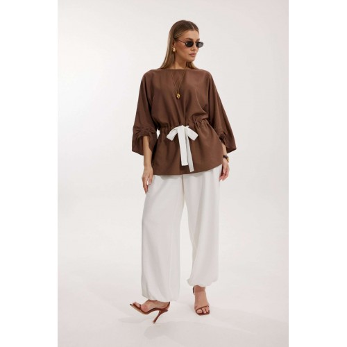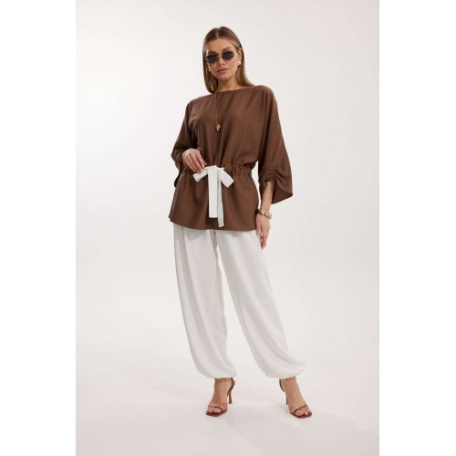 Костюм женский, состоящий из блузы и брюк. Блуза кроя «летучая мышь» длиной за линию бедра. Перед цельный с округлой горловиной. Спинка со средним швом. В районе талии обработана кулиса с широким контрастным поясом. По низу рукава по передней части выполнено несколько рядов сборки. Горловина обработана окантовкой. Брюки контрастного цвета прямого силуэта с поясом на резинке. По передним половинкам заложены складки и обработаны наклонные карманы с отрезным бочком По низу брюки собраны на резинку. Верхний срез брюк обработан отрезным поясом на частичной резинке.