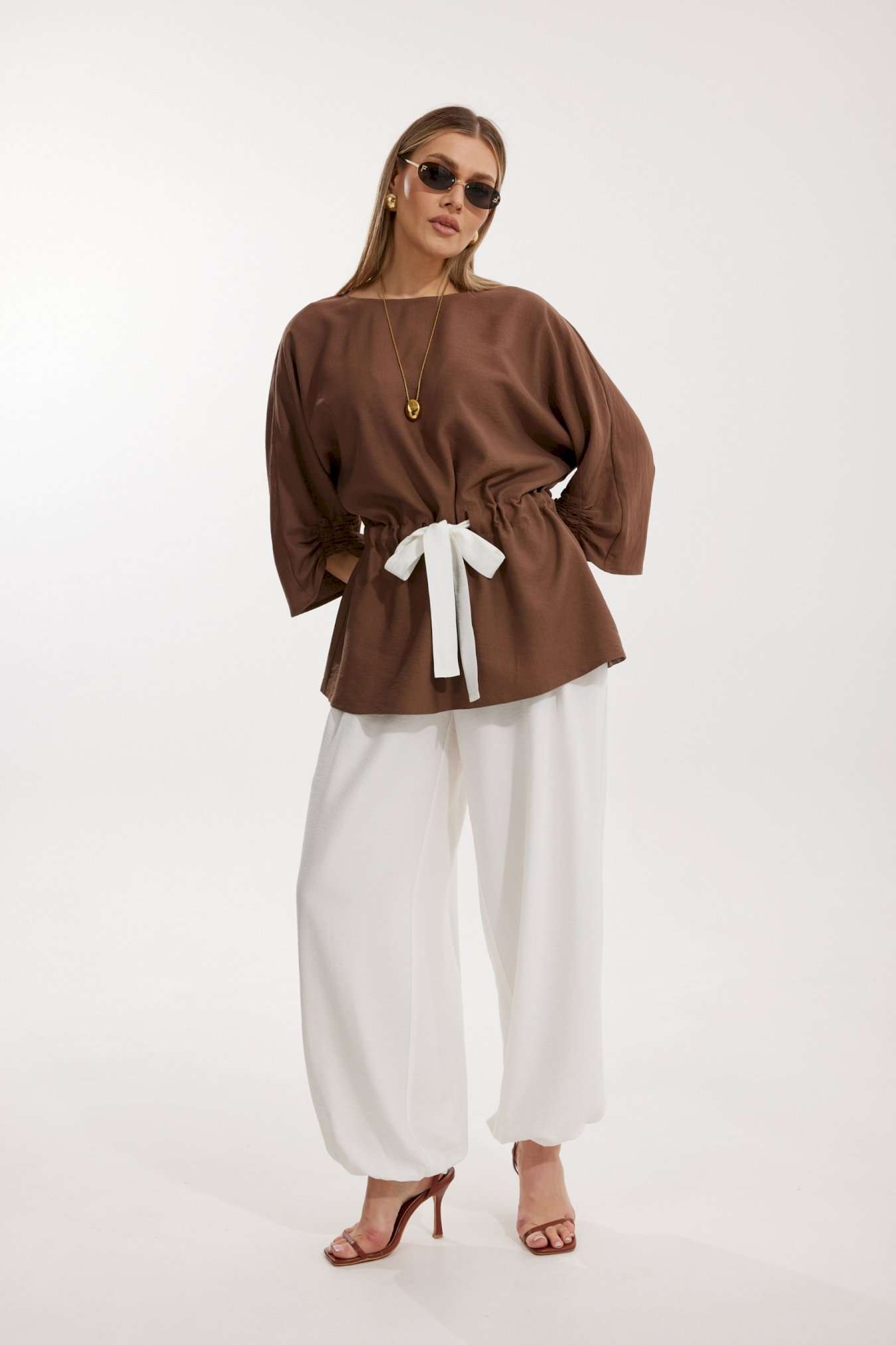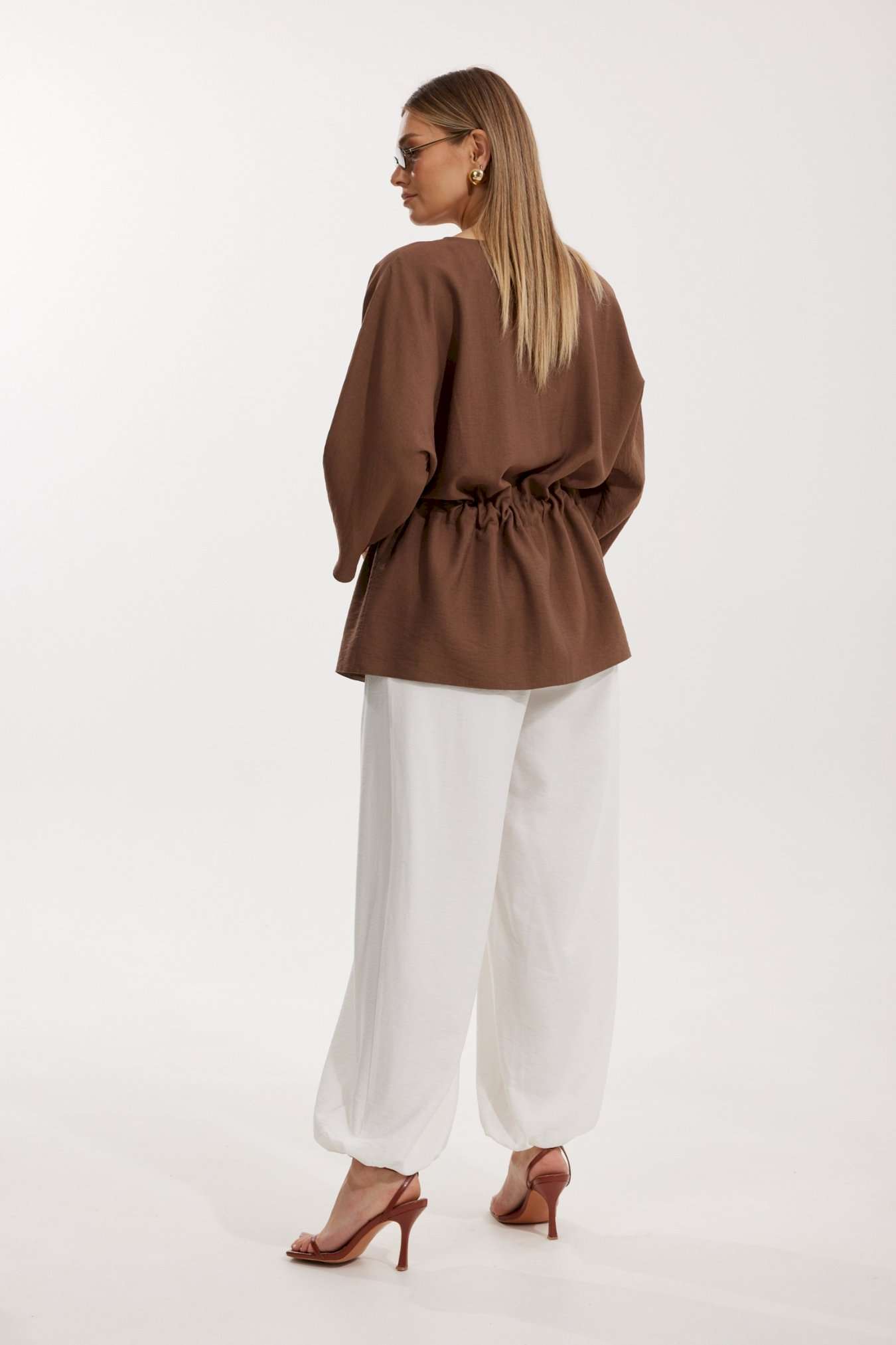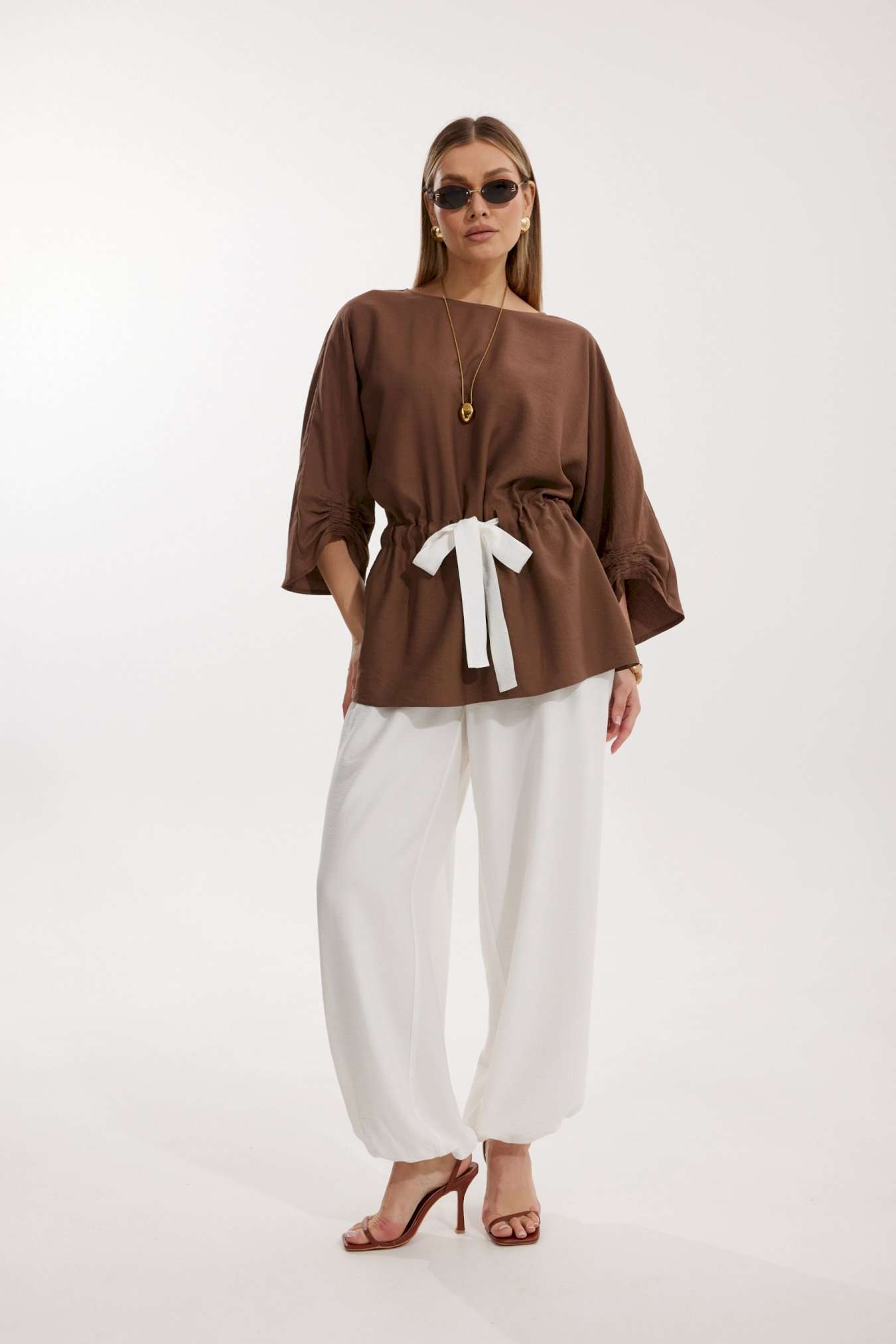 Костюм женский, состоящий из блузы и брюк. Блуза кроя «летучая мышь» длиной за линию бедра. Перед цельный с округлой горловиной. Спинка со средним швом. В районе талии обработана кулиса с широким контрастным поясом. По низу рукава по передней части выполнено несколько рядов сборки. Горловина обработана окантовкой. Брюки контрастного цвета прямого силуэта с поясом на резинке. По передним половинкам заложены складки и обработаны наклонные карманы с отрезным бочком По низу брюки собраны на резинку. Верхний срез брюк обработан отрезным поясом на частичной резинке.