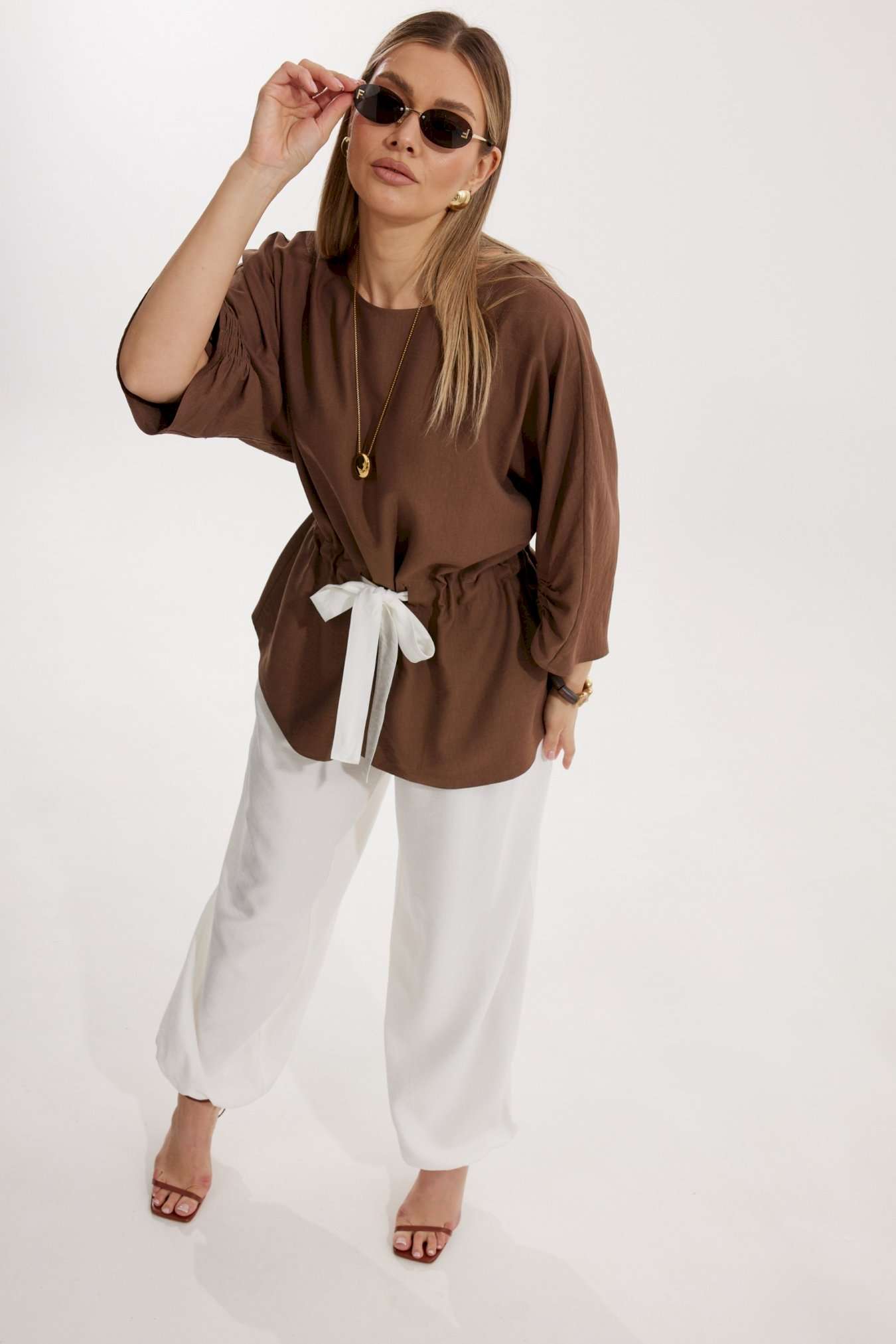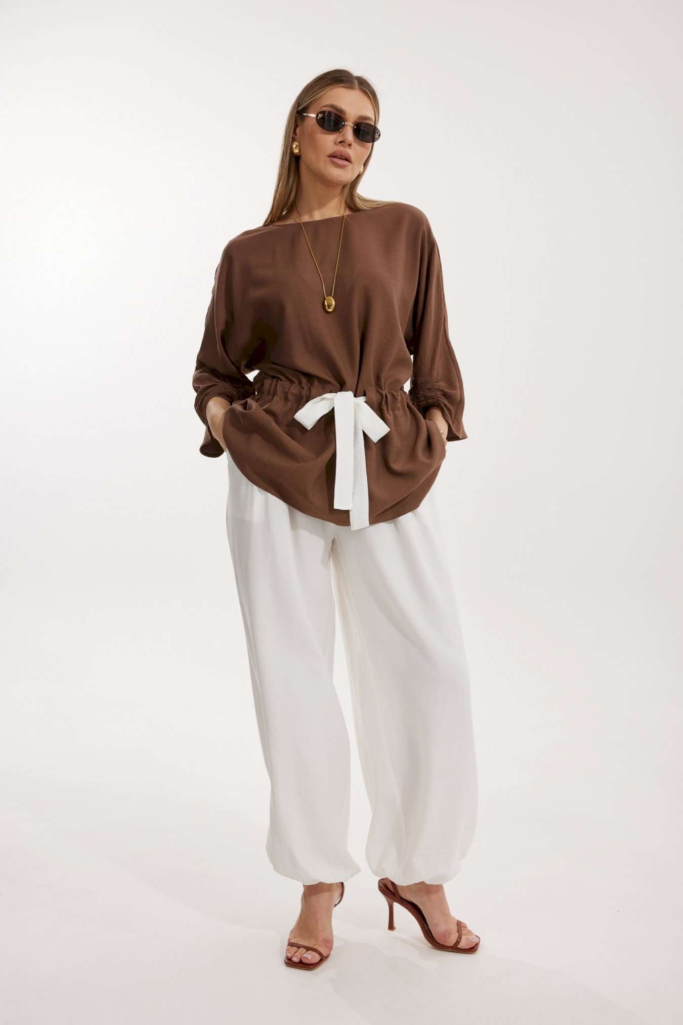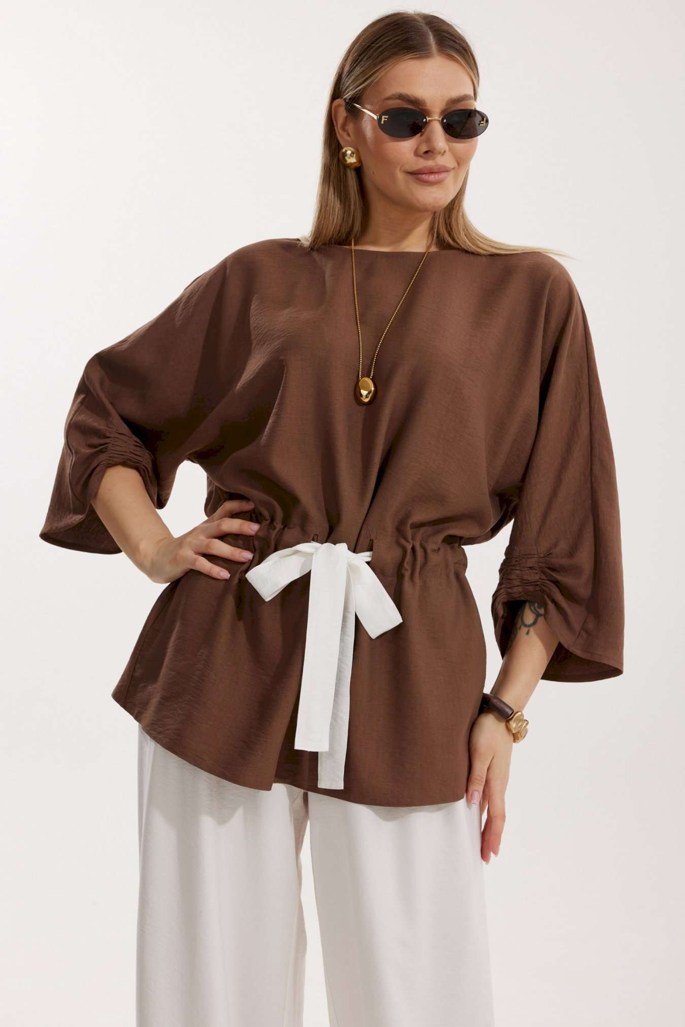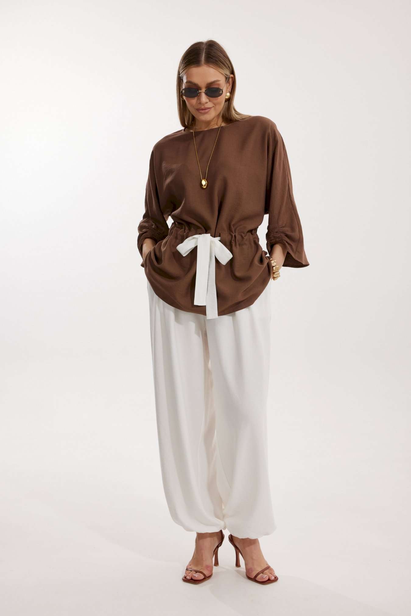 Костюм женский, состоящий из блузы и брюк. Блуза кроя «летучая мышь» длиной за линию бедра. Перед цельный с округлой горловиной. Спинка со средним швом. В районе талии обработана кулиса с широким контрастным поясом. По низу рукава по передней части выполнено несколько рядов сборки. Горловина обработана окантовкой. Брюки контрастного цвета прямого силуэта с поясом на резинке. По передним половинкам заложены складки и обработаны наклонные карманы с отрезным бочком По низу брюки собраны на резинку. Верхний срез брюк обработан отрезным поясом на частичной резинке.