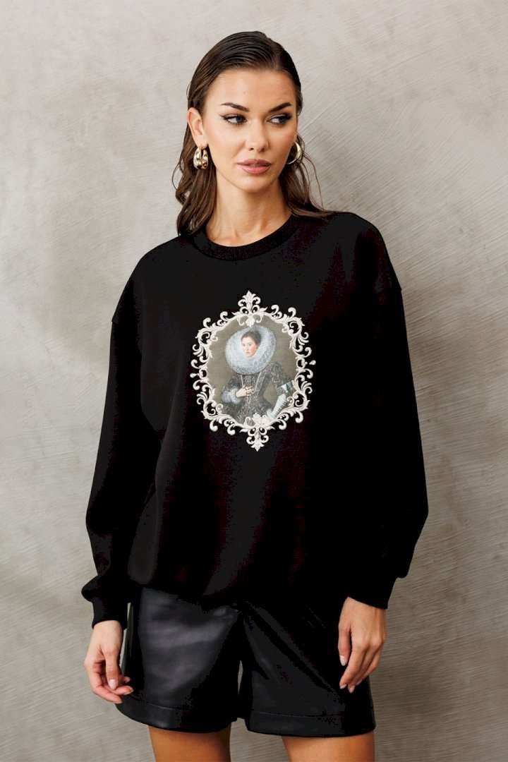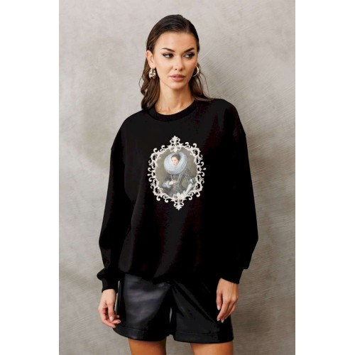 Джемпер из технологичного трикотажного полотна с эффектом peach. Прямого силуэта с втачным рукавом и спущенной линией плеча, с манжетой из отделочной ткани по низу рукава. По переду печать с вышивкой \"Queen\". По горловине и низу изделия притачная планка из отделочной ткани.