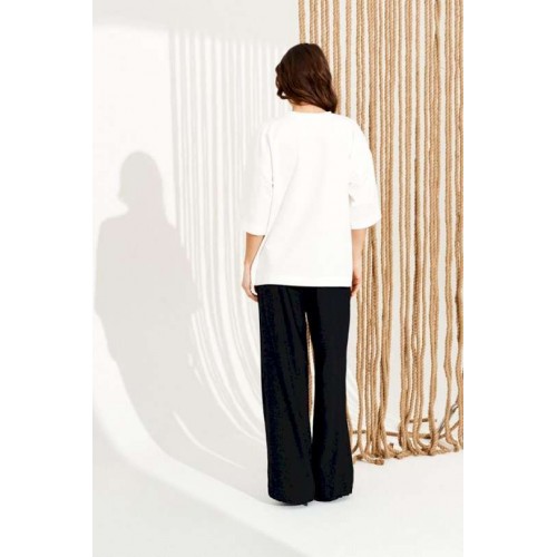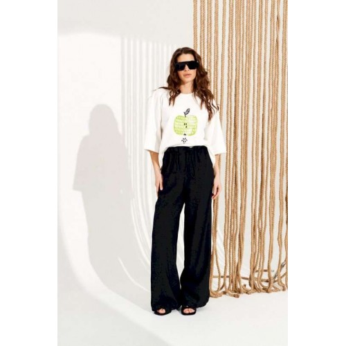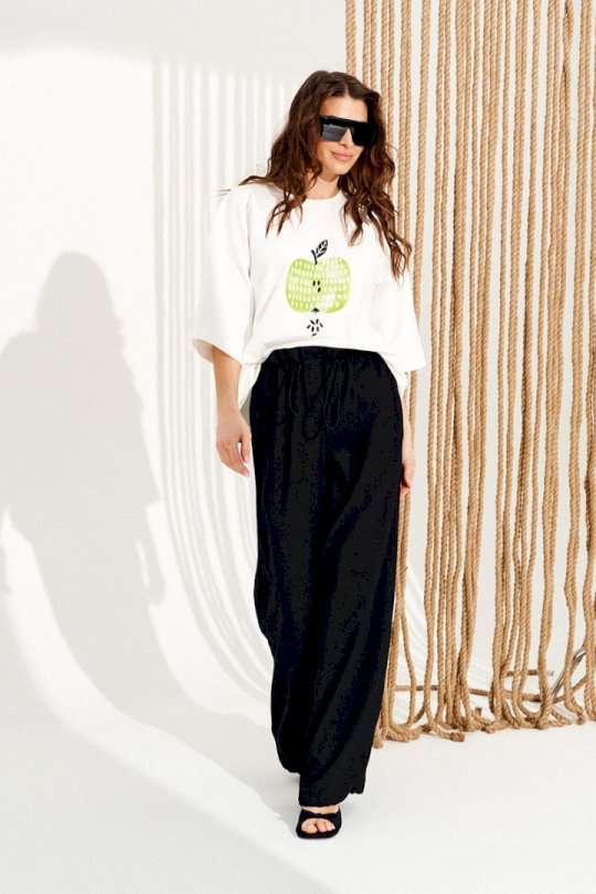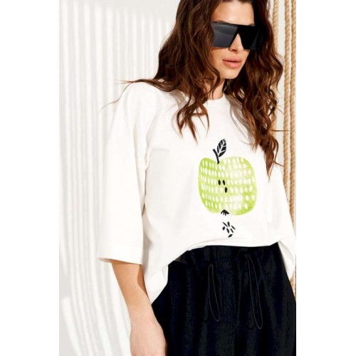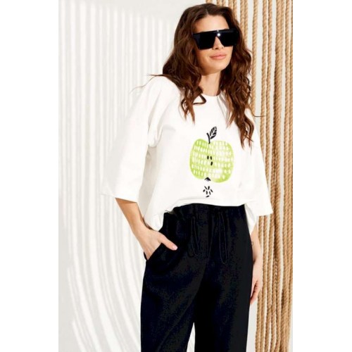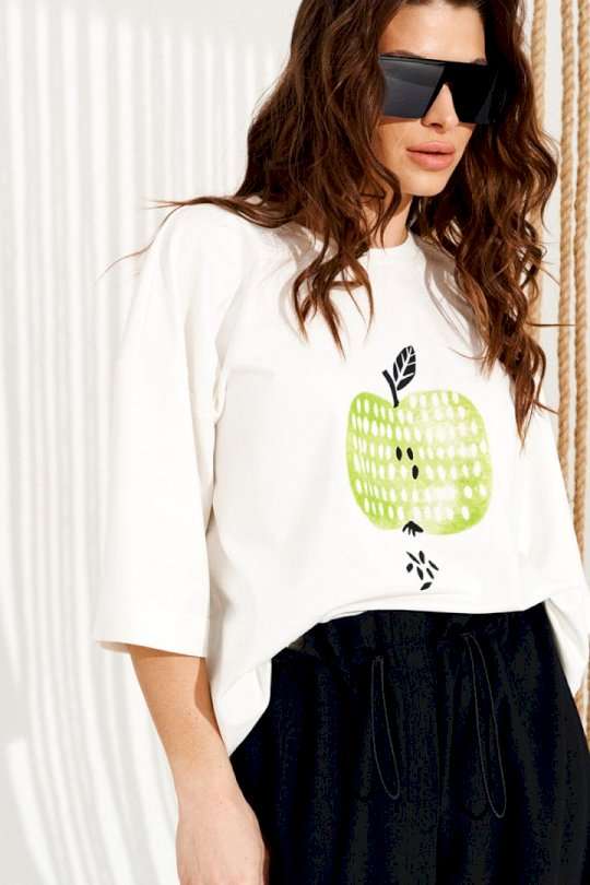 Джемпер из трикотажного полотна свободного объема, прямого силуэта, с круглым вырезом горловины. Вырез горловины обработан притачной обтачкой. Перед и спинка цельные. По переду выполнена печать «Яблоко». Рукав втачной, одношовный, короткий. Длина изделия на модели вдоль середины спинки — 68,5 см (допустимое отклонение +/- 1 см)