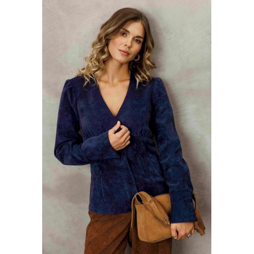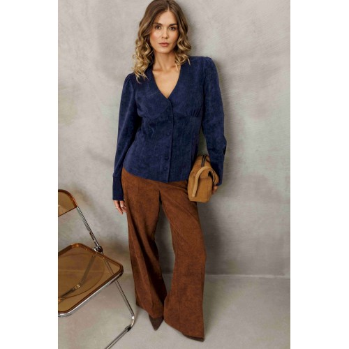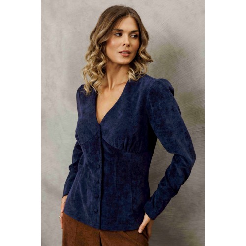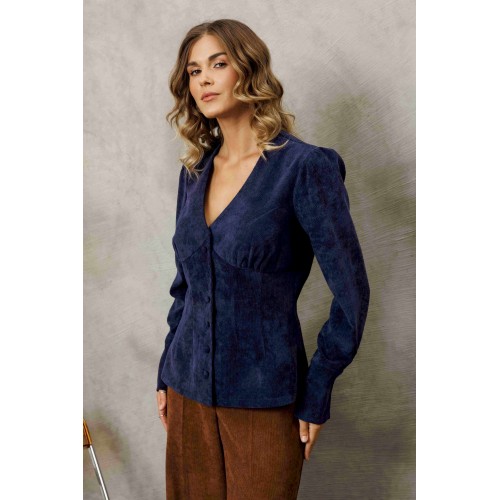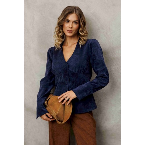 Блузка оригинальная приталенного силуэта из вельветовой ткани. Перед с подрезом под грудью, сборкой в районе груди и талиевыми вытачками. Затсежка на петли и пуговицы. Горловина V-образной формы. Спинка с талиевыми вытачками. Рукав втачной со сборкой по окату и с манжетой по низу. Манжета высокая с двумя петлями и пуговицами. Длина блузки - 63 см. Длина рукава блузки - 64 см.