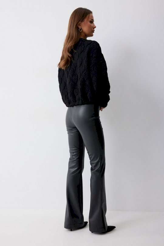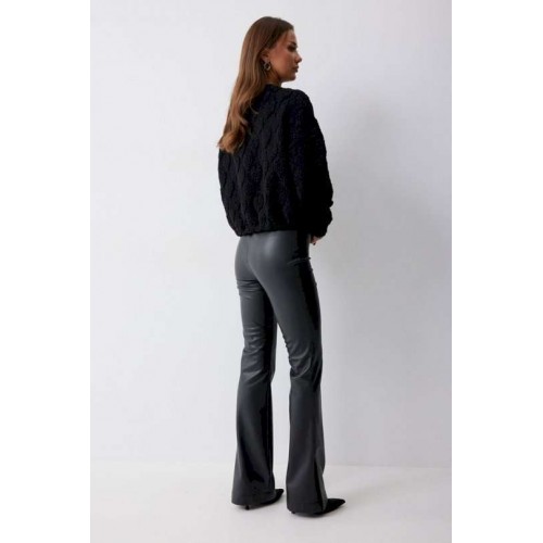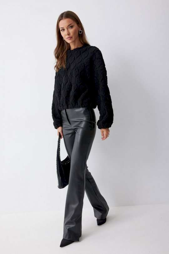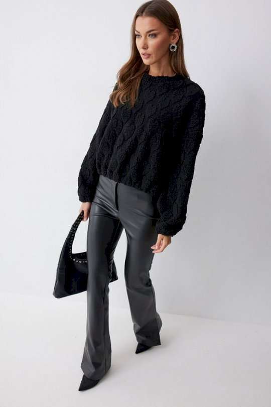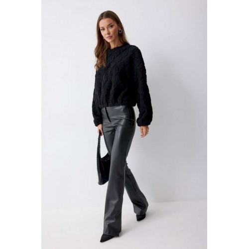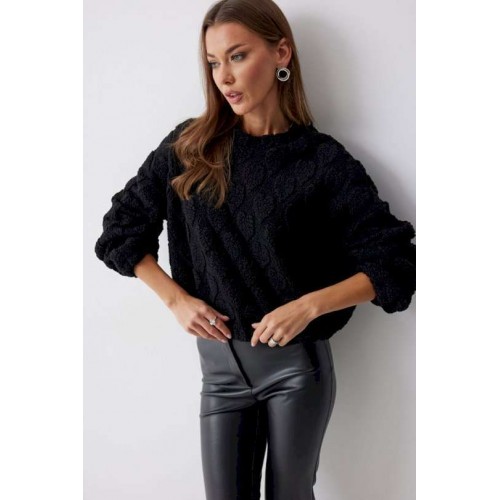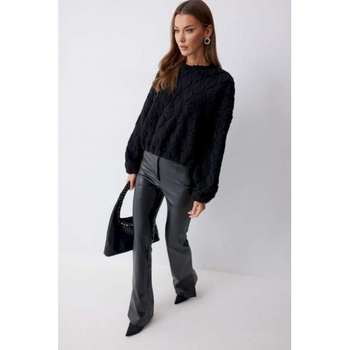 Укороченный джемпер прямого силуэта из трикотажного полотна. Горловина округлая. Рукав со спущенной линией плеча, по низу резинка. По низу джемпера резинка. Подходит на рост 164-170 см. Длина джемпера (44-48р – 52см)(50-54р - 60см). Длина рукава от горловины (44-48р - 74см)(50-54р - 75,5см).