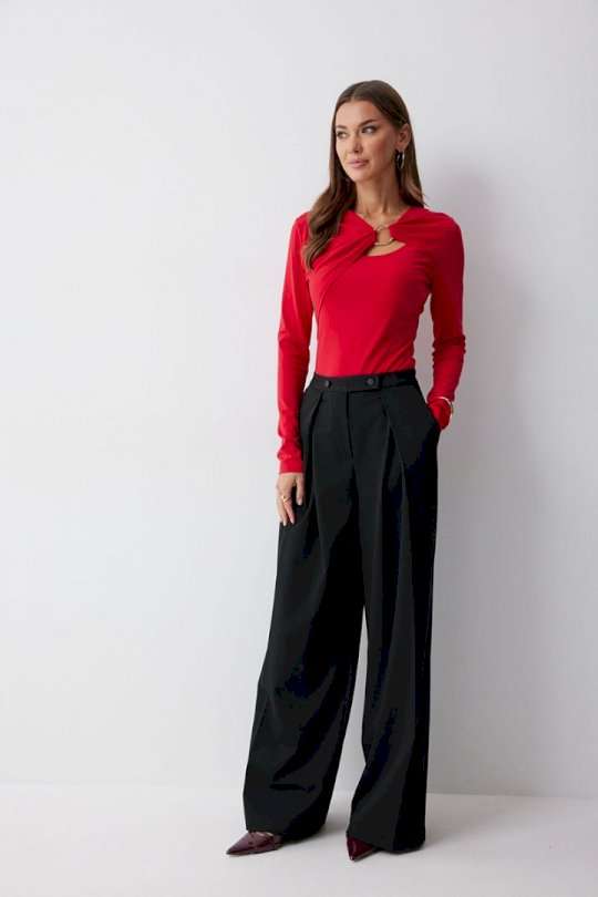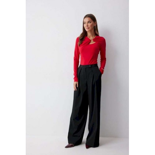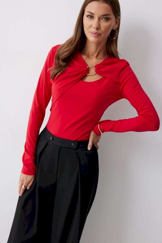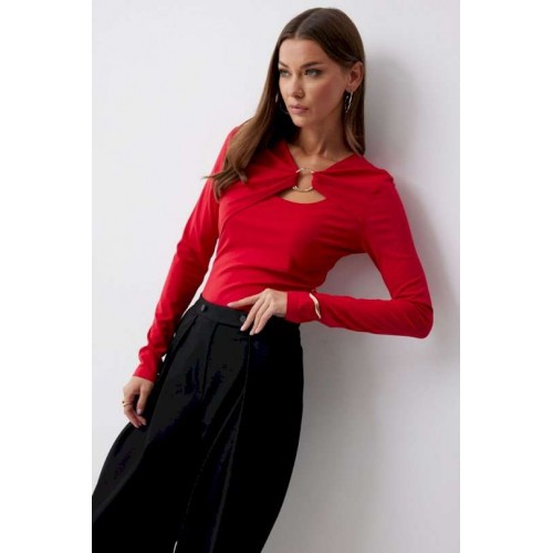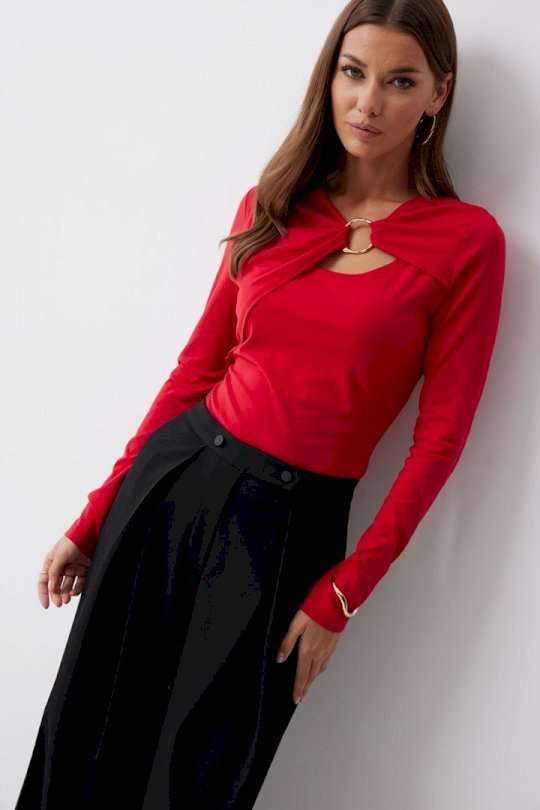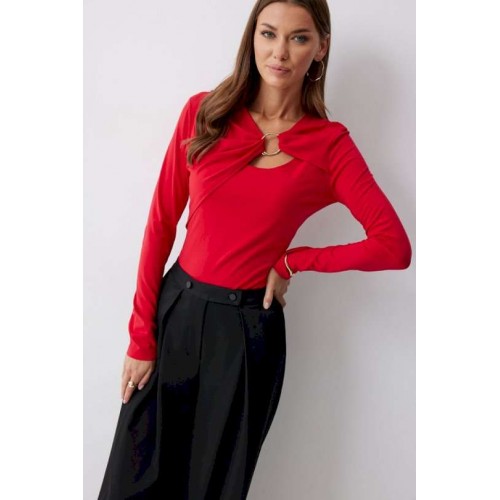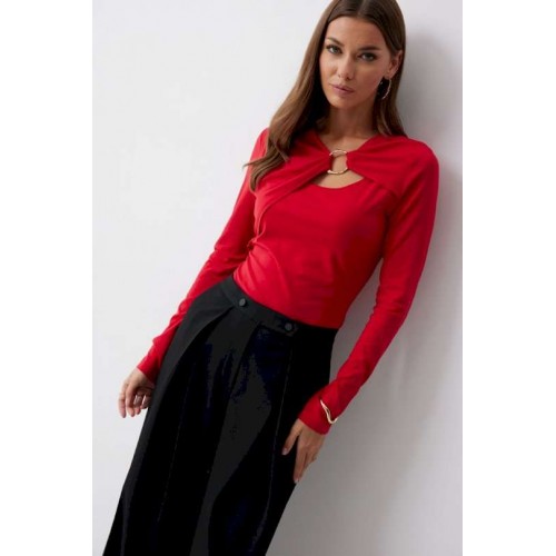 Джемпер прилегающего силуэта из трикотажного полотна. Горловина с фигурным вырезом декоративными складками и фурнитурой. Рукав втачной удлиненный . Обращаем ваше внимание, что фурнитура может отличаться от фото. Подходит на рост 164-170 см. Длина блузки (44-48р - 57см)(50-54р - 60см). Длина рукава 63см.