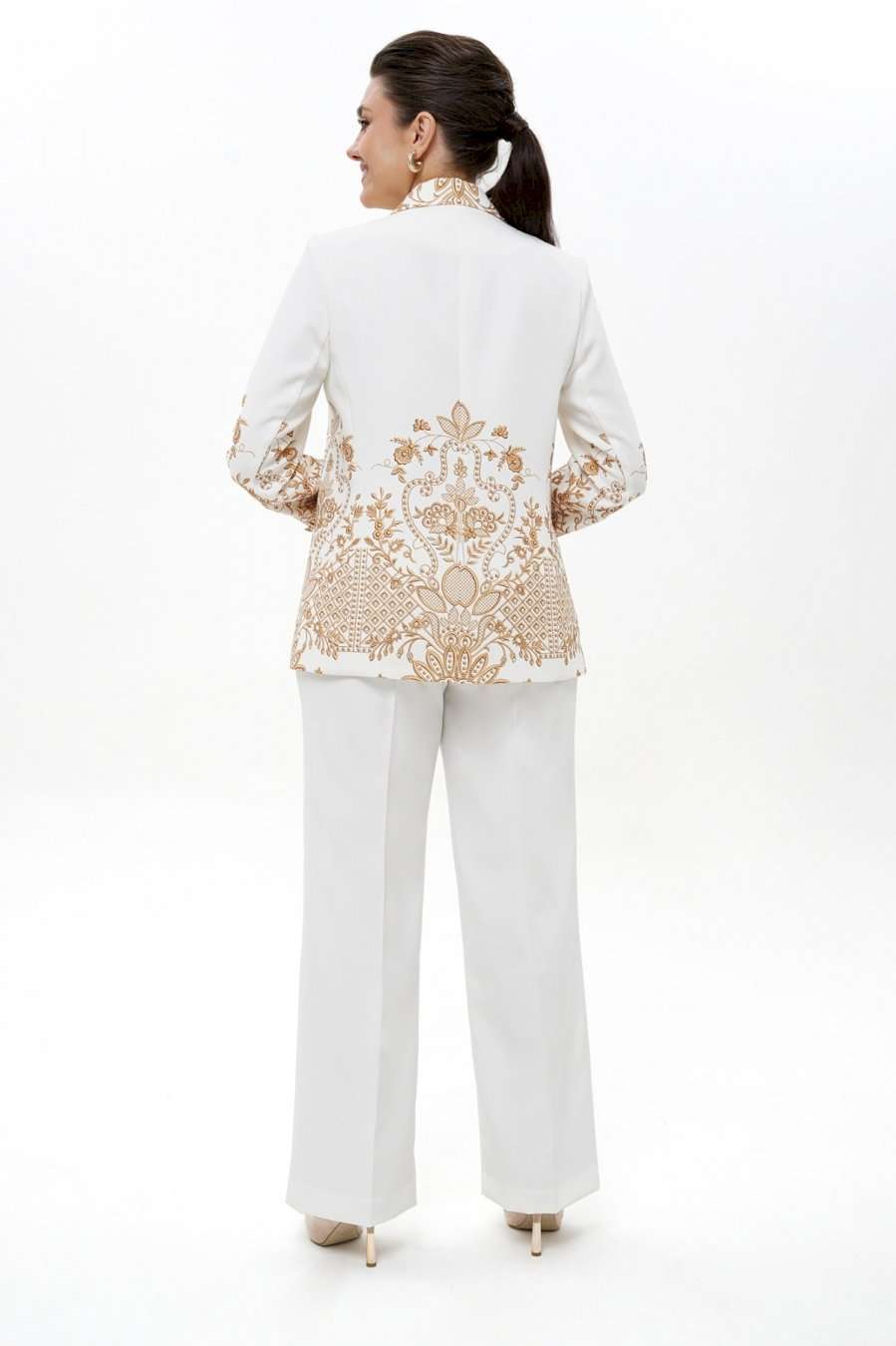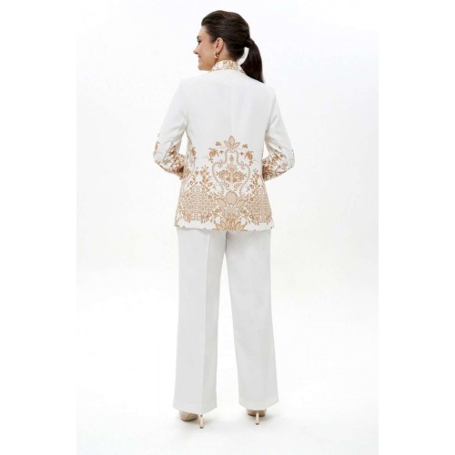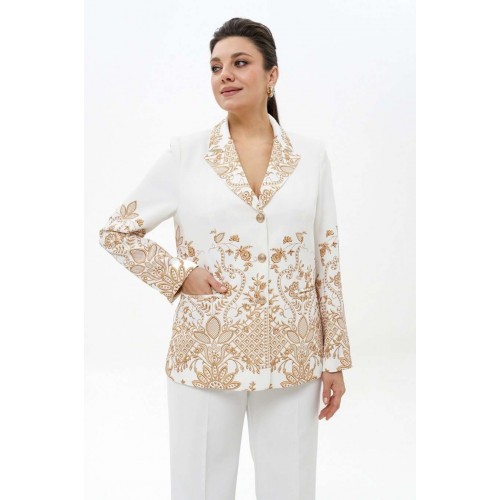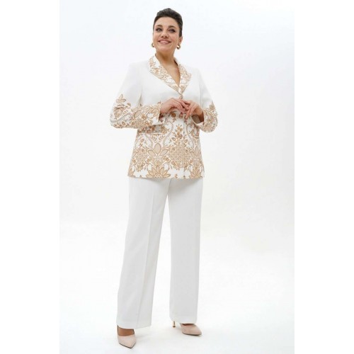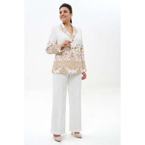 Костюм брючный 2496 молоко + золото ALANI — это выбор современной женщины, стремящейся к стильной индивидуальности. Коллекция бренда ALANI предлагает комплект из жакета и брюк, выполненный из ткани, сочетающей вискозу и полиэстер. Полуприлегающий силуэт жакета с отложными лацканами и рельефными швами подчёркивает элегантность образа, а прорезные карманы добавляют практичности. Брюки прямого силуэта создают актуальный и утончённый вид. Молочного цвета костюм с золотыми элементами подходит для любого сезона, позволяя чувствовать себя уверенно и комфортно как на прогулке, так и в офисе. Это идеальный выбор для делового и стильного гардероба.