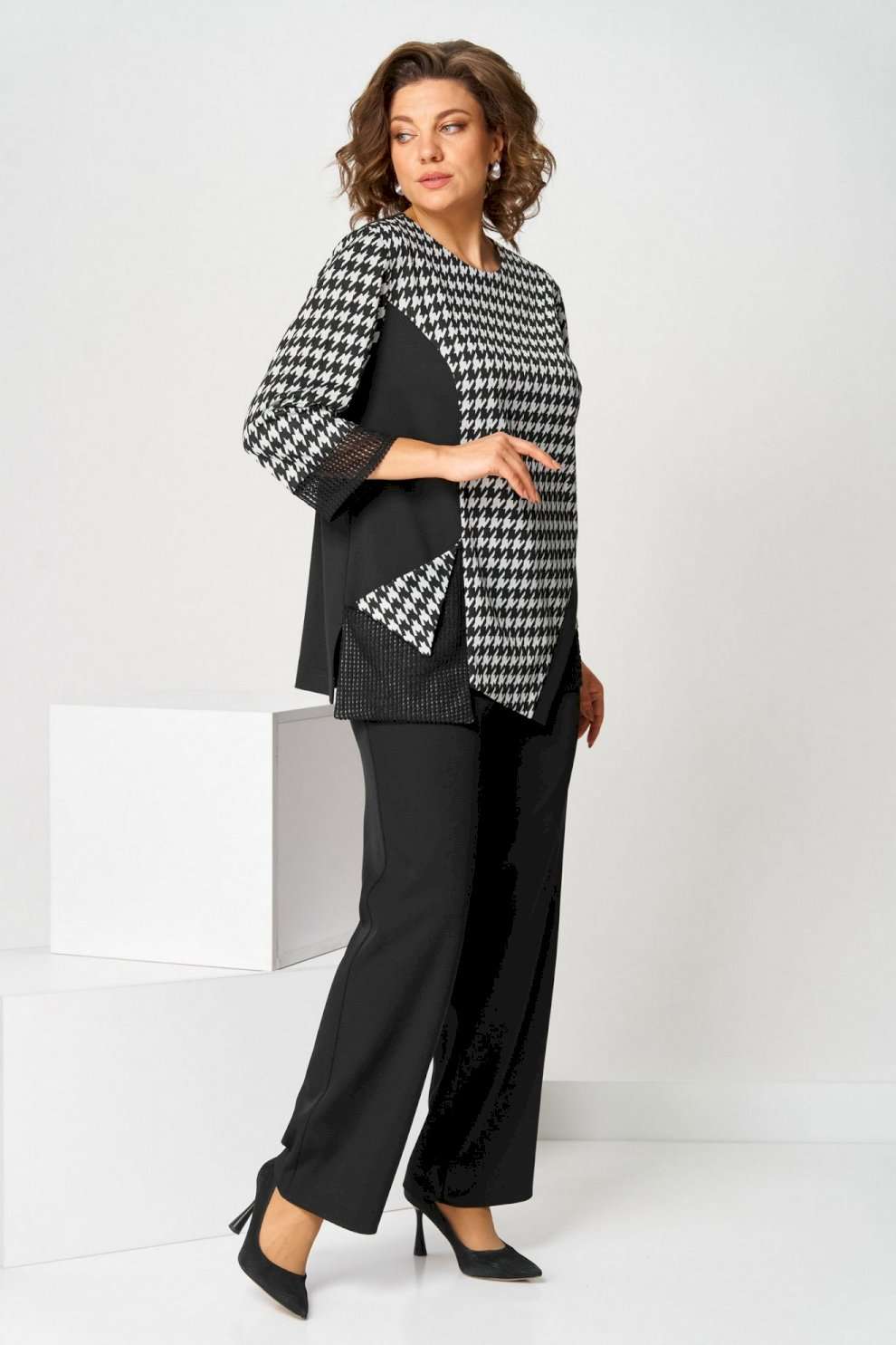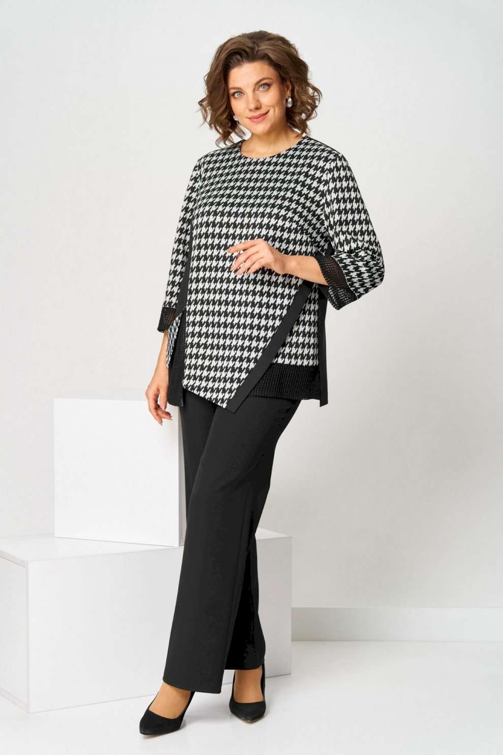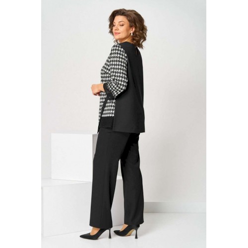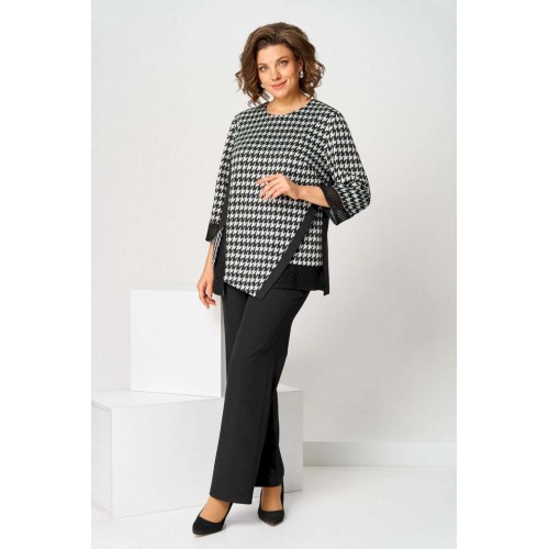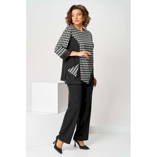 Костюм брючный (двойка) женский полуприлегающего силуэта, состоит из джемпера и брюк. Костюм выполнен и трикотажного полотна и брючной ткани. Джемпер выполнен из трикотажа. На передней половине джемпера карман, водящий в рельеф. К левому боковому шву наискосок расположена декоративная планка По низу рукавов, карманов вставки из ткани \"сетка\". Брюки классические, на поясе с резинкой. Застежка на гульфик, на тесьму-молнию. Вверху косые карманы. Длина изделия джемпер - 69 (±1) см., брюки - 100 (±2) см. Рисунок абстракция, гусиная лапка Длина рукава 47 (±1) см.