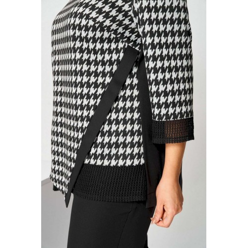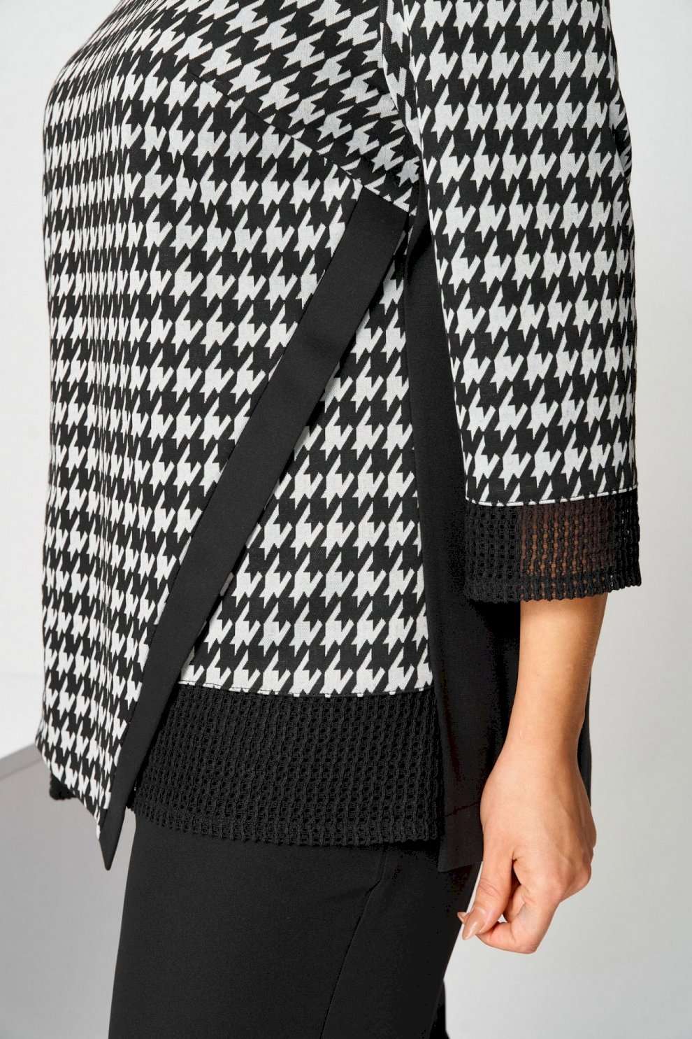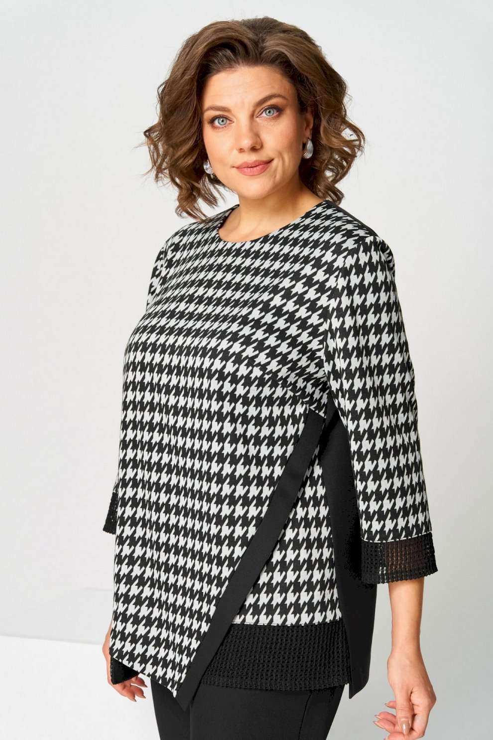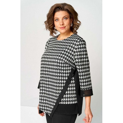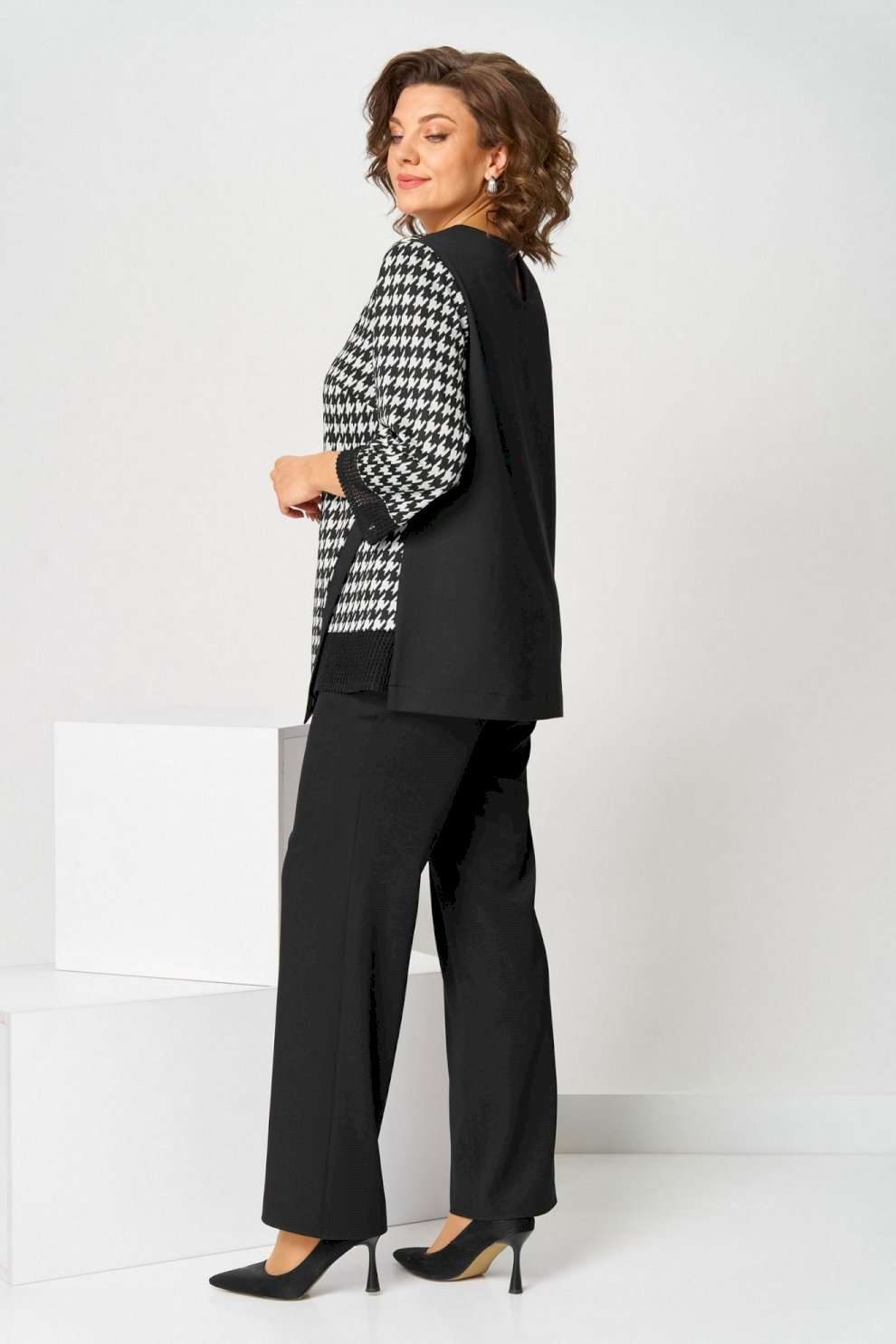 Костюм брючный (двойка) женский полуприлегающего силуэта, состоит из джемпера и брюк. Костюм выполнен и трикотажного полотна и брючной ткани. Джемпер выполнен из трикотажа. На передней половине джемпера карман, водящий в рельеф. К левому боковому шву наискосок расположена декоративная планка По низу рукавов, карманов вставки из ткани \"сетка\". Брюки классические, на поясе с резинкой. Застежка на гульфик, на тесьму-молнию. Вверху косые карманы. Длина изделия джемпер - 69 (±1) см., брюки - 100 (±2) см. Рисунок абстракция, гусиная лапка Длина рукава 47 (±1) см.
