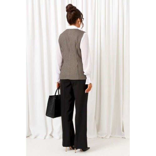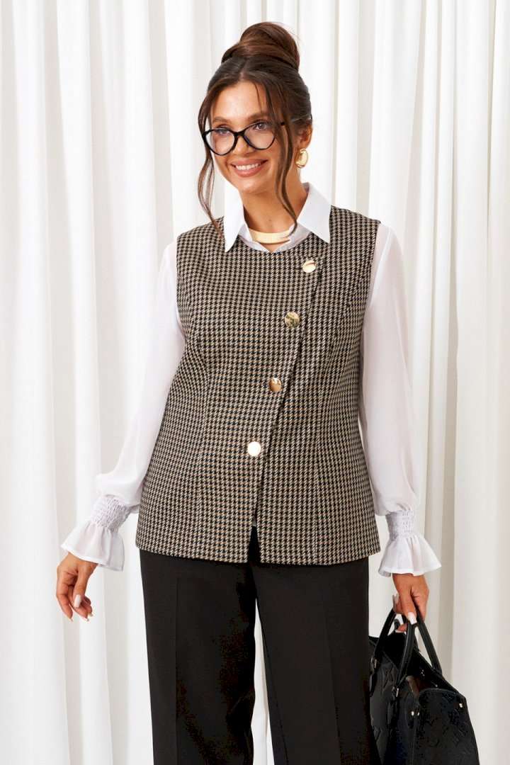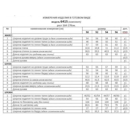 Состав: жилет – вискоза 89%; акрил 8%; эластан 3%, брюки – вискоза 60%; п/э 37%; спандекс 3% , блузка – пэ 75%; вискоза 25%