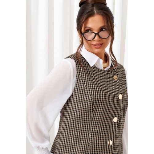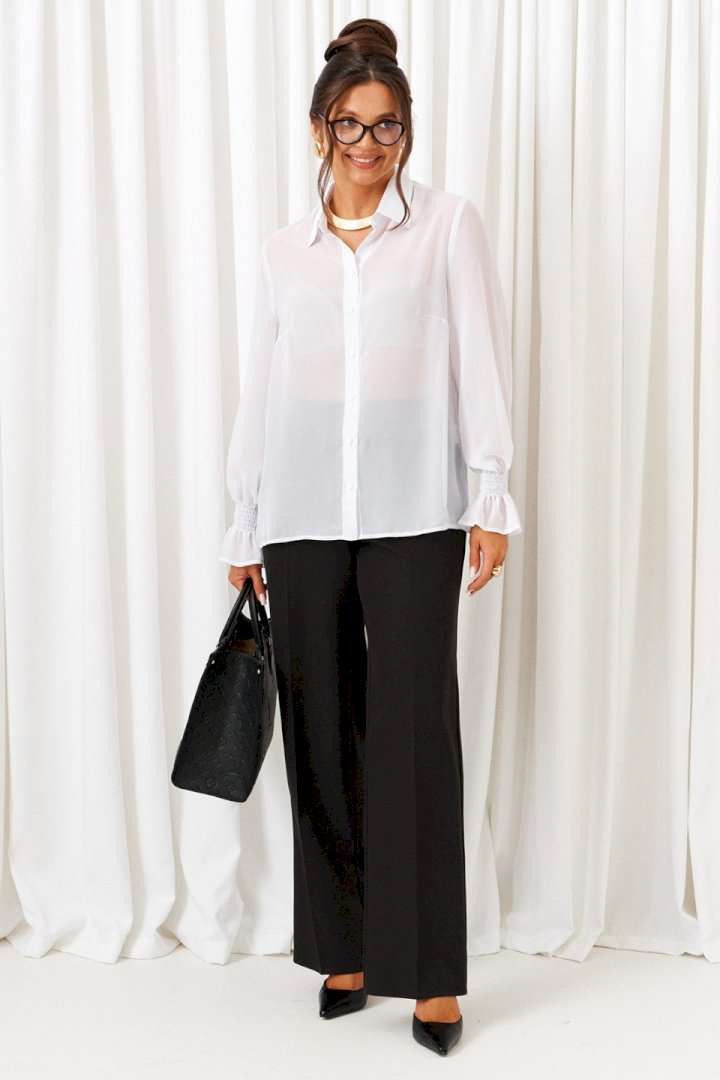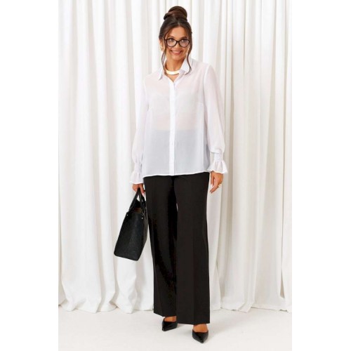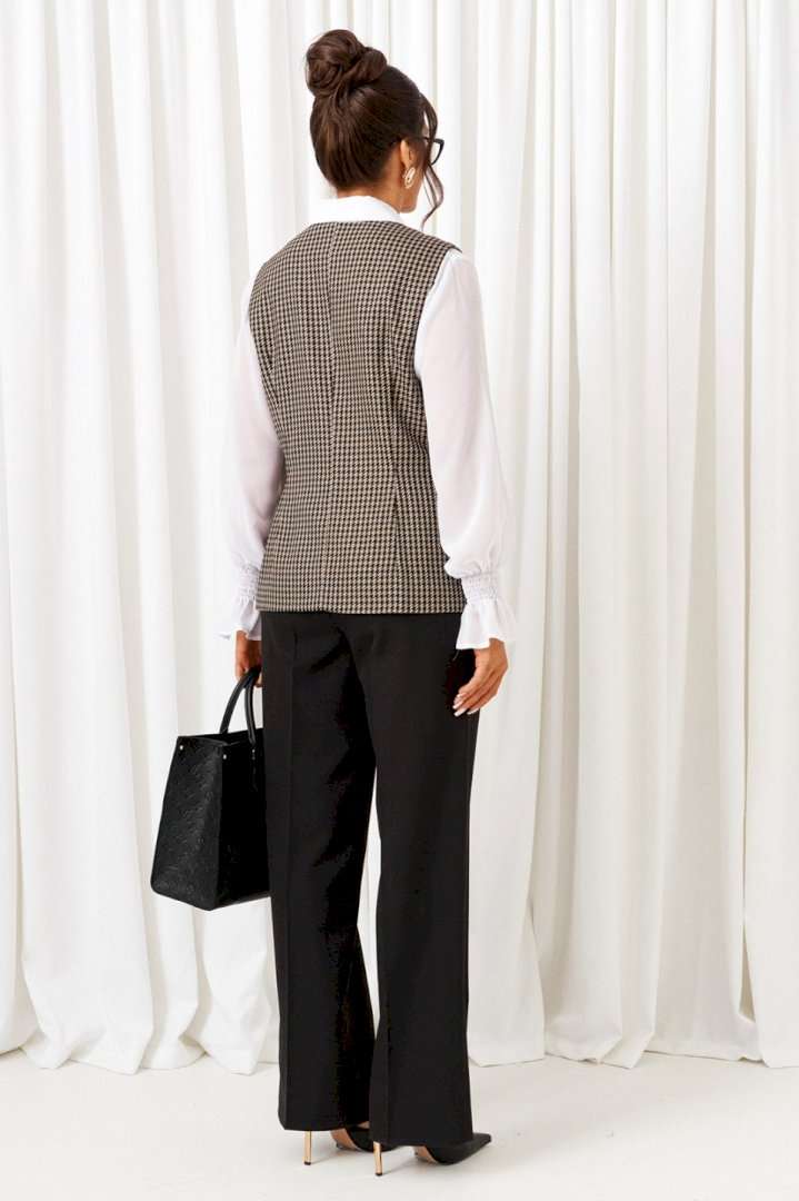 Деловой комплект 3-ка, состоящий из трех предметов: жилета, брюк и блузки. Блузка рубашечного типа выполнена из легкой, струящейся шифоновой ткани. Передняя часть блузки цельнокроеная с двумя нагрудными вытачками. Застежка центральная на петли и пуговицы. Спинка цельнокроеная с двумя вытачками на уровне талии. Нижний край блузы ровный. Воротник отложной рубашечный, на отрезной стойке. Рукав длинный одношовный втачной. Нижний край рукава декоративный с широкой оборкой. Брюки классические прямые длинные выполнены из костюмно-смесового полотна с нежной, гладко-бархатистой фактурой, приятной на ощупь и матовой поверхностью; В верхней части брюк расположены функциональные карманы. Посадка стандартная высокая. Пояс притачной с резинкой по кругу. Жилет полуприлегающего силуэта; выполнен из костюмно-смесового полотна отличительного дизайна; на подкладке. Передняя часть с вертикальными рельефами от проймы. Спинка разрезная по среднему шву и вытачками на талии от низа. Горловина округлой формы, переходящая в борт с выступом. Застежка смещенная по наклонной на прорезные петли и четыре видимые декоративные и одну потайную пуговицы. Длина блузки (по среднему шву спинки) – 68 см. Длина рукава блузки – 63 см. Длина жилета (по среднему шву спинки) – 63 см. Длина брюк (по боковому шву с поясом) – 108 см.