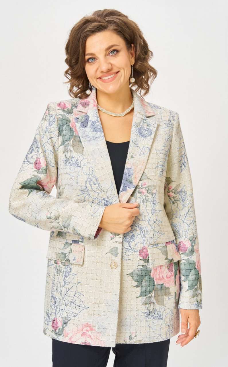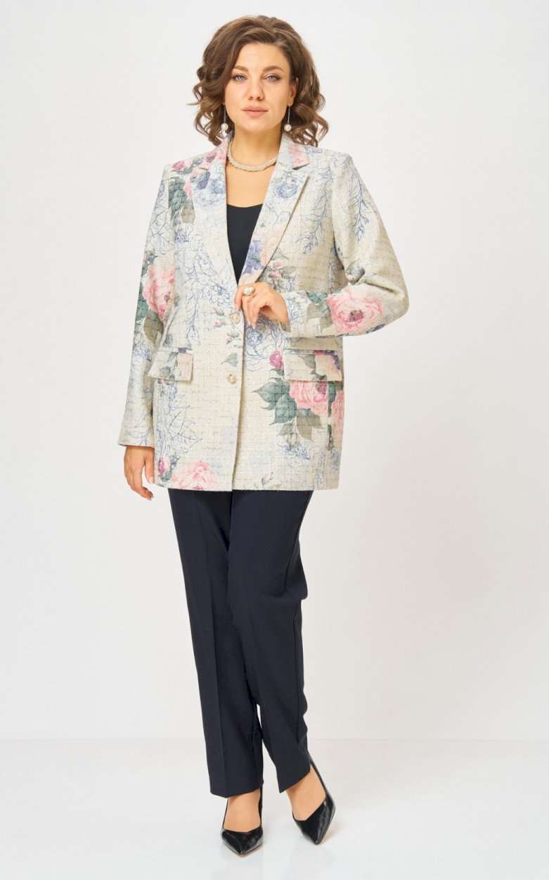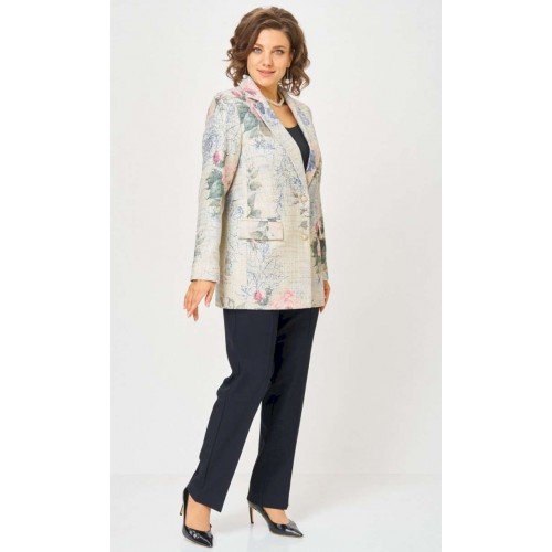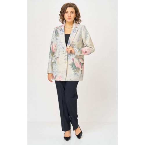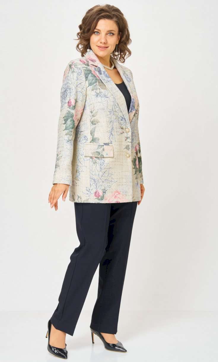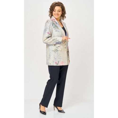 Комплект женский-двойка,из костюмной ткани, жакет удлиненный, свободного силуэта с центральной бортовой застежкой на пуговицы до линии перегиба лацкана. По переду имеется отрезной бочок и вертикальные вытачки. С прорезными карманами с клапаном и двумя обтачками. Спинка цельная. Воротник пиджачного типа. Рукав двухшовный, втачной. Жакет на подкладке. Длина рукава 63 см, длина по спинке 75 см. Брюки прямые, классические, из текстильной ткани, с заутюженными стрелками, по переду обработаны карманы с отрезным бочком, застежка на тесьму-молнию и 1 пуговицу. На задних половинках обработаны вытачки и имитация карманов с листочкой, пояс в брюках притачной. Длина брюк от талии по боковому шву 103 см.