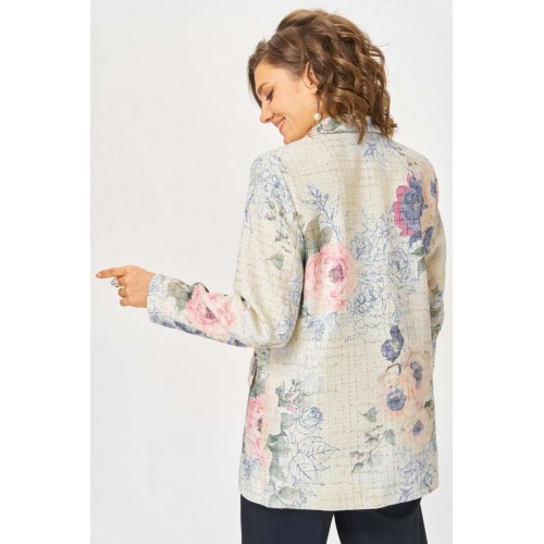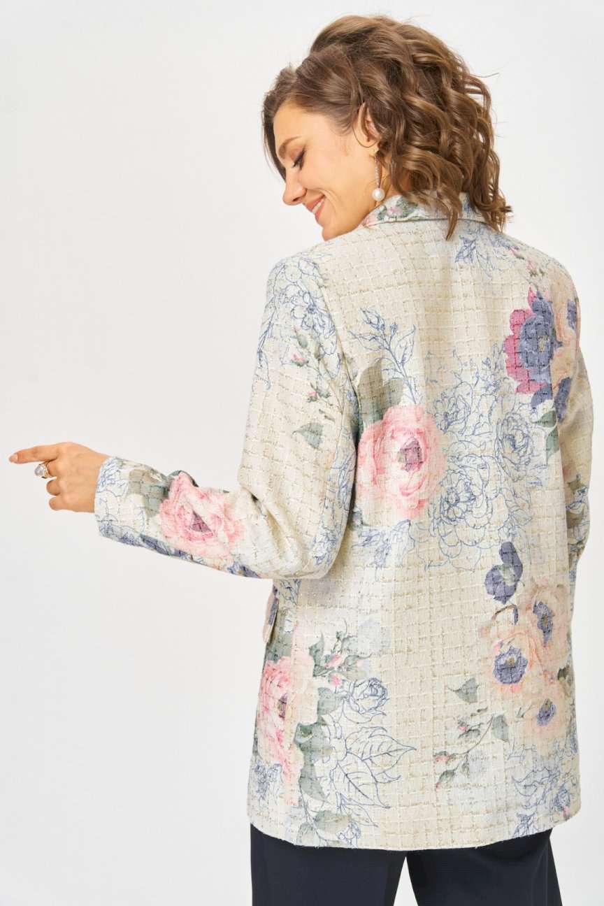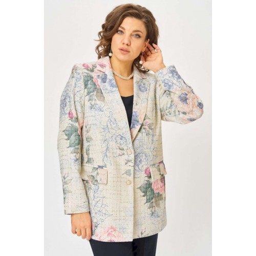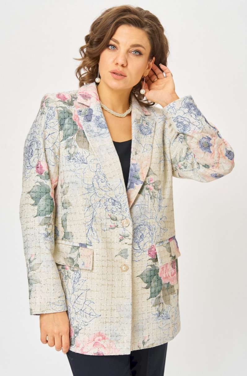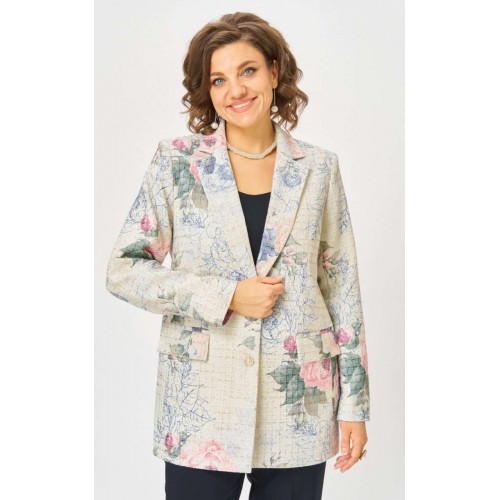 Комплект женский-двойка,из костюмной ткани, жакет удлиненный, свободного силуэта с центральной бортовой застежкой на пуговицы до линии перегиба лацкана. По переду имеется отрезной бочок и вертикальные вытачки. С прорезными карманами с клапаном и двумя обтачками. Спинка цельная. Воротник пиджачного типа. Рукав двухшовный, втачной. Жакет на подкладке. Длина рукава 63 см, длина по спинке 75 см. Брюки прямые, классические, из текстильной ткани, с заутюженными стрелками, по переду обработаны карманы с отрезным бочком, застежка на тесьму-молнию и 1 пуговицу. На задних половинках обработаны вытачки и имитация карманов с листочкой, пояс в брюках притачной. Длина брюк от талии по боковому шву 103 см.