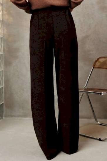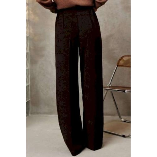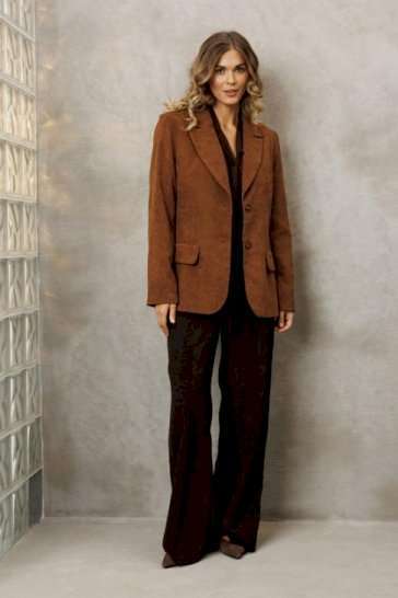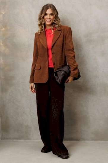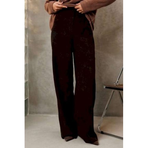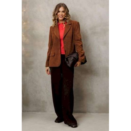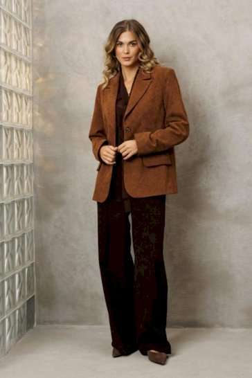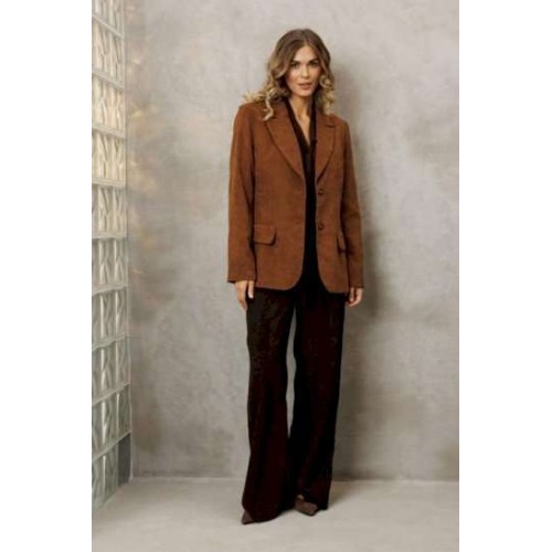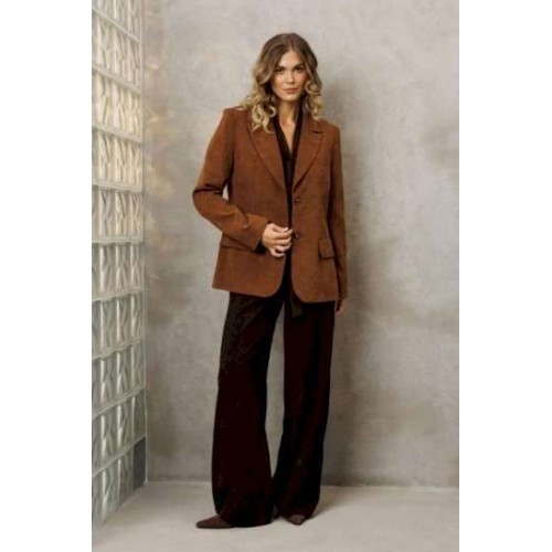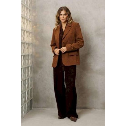 Костюм состоит из жакета и брюк. Жакет полуприлегающего силуэта из мягкой вельветовой ткани приятного каштанового цвета. Застежка однобортная на две пуговицы, воротник пиджачного типа. Перед с талиевой вытачкой, рельефом и декоративным клапаном. Спинка с рельефами из проймы и средним швом. Рукав втачной двухшовный. Жакет на подкладке. Брюки палаццо с притачным поясом из мягкой вельветовой ткани. Спереди застежка гульфик на молнии и петлей и пуговицей по поясу. По задней частям брюк вытачки. Пояс с резинкой в боковых частях. Брюки с заутюженными стрелками. Длина жакета - 68 с. Длина рукава жакета - 60 см. Длина брюк с учетом пояса - 109 см.