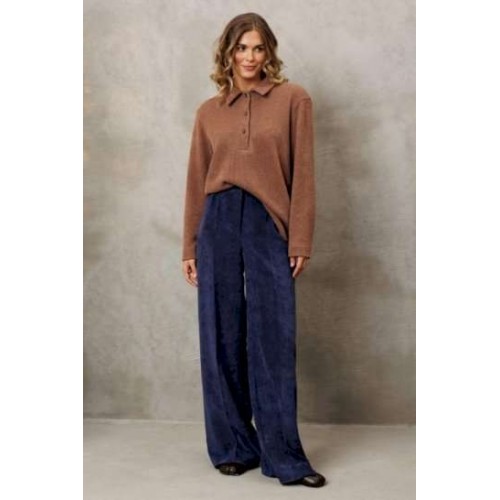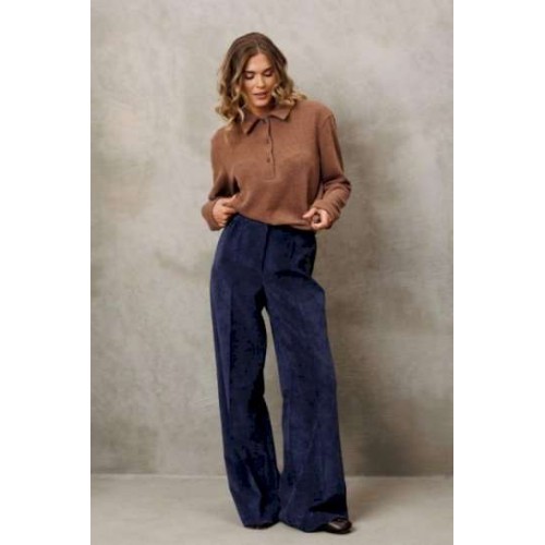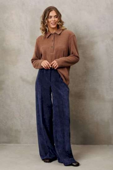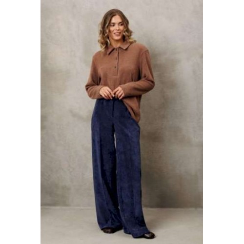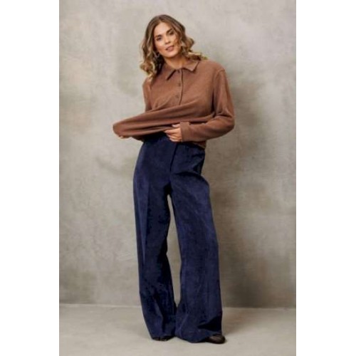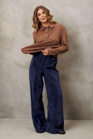 Костюм состоит из джемпера и брюк. Джемпер прямого силуэта с воротником поло из теплого трикотажного полотна. Рукав втачной одношовный. Брюки палаццо с притачным поясом из мягкой вельветовой ткани. Спереди застежка гульфик на молнии и петлей и пуговицей по поясу. По задней частям брюк вытачки. Пояс с резинкой в боковых частях. Брюки с заутюженными стрелками. Длина джемпера- 66 см. Длина рукава - 60 см. Длина брюк с учетом пояса - 109 см.