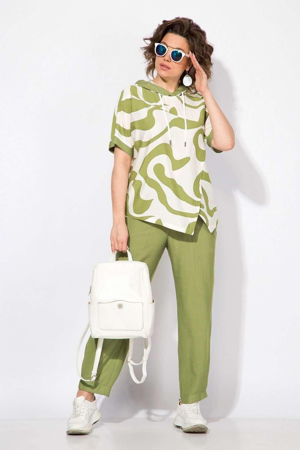 Костюм брючный 1438л голубой Liliana-style — это идеальный выбор для летнего сезона. Коллекция бренда Liliana-style сочетает в себе комфорт и стиль благодаря использованию вискозы и льна для создания легкой и дышащей ткани. Удлиненная туника свободного кроя с капюшоном и кулиской на шнуровке добавляют динамичности образу, а ассиметричный подрез и разноуровневый низ придают индивидуальность. Брюки с завышенной посадкой и боковыми карманами обеспечивают практичность и комфорт. Длина туники по спинке составляет 68 см, длина брюк — 98-100 см. Этот комплект в голубых тонах идеально подходит для повседневных прогулок.