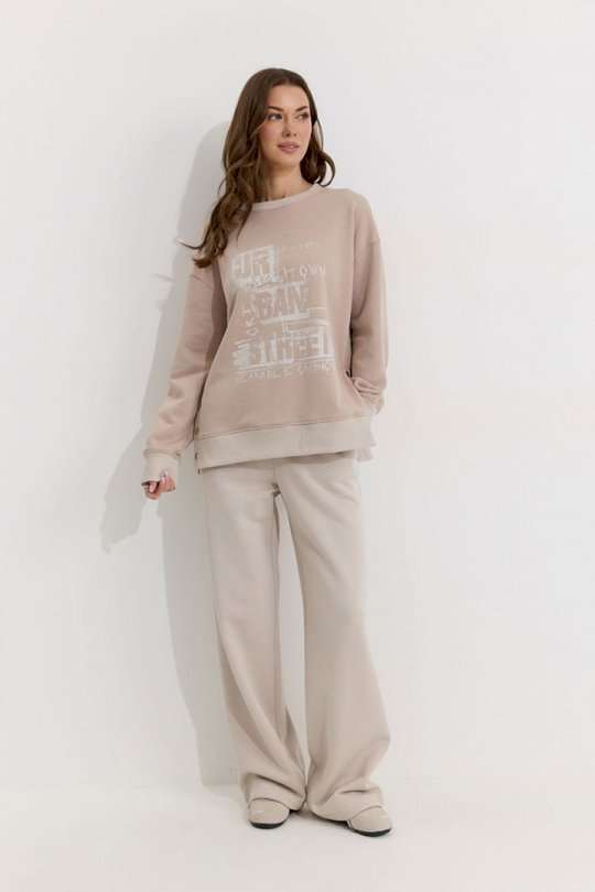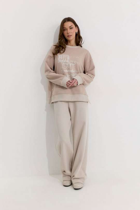 Костюм состоящий из джемпера и брюк. Джемпер прямого силуэта из трикотажного полотна. Горловина округлая. Рукав со спущенной линией плеча, по низу манжета из отделочной ткани. По низу в боковых швах декоративная шлица с кнопками. По низу джемпера притачной пояс из отделочной ткани. По переду дизайнерская печать. Обращаем ваше внимание, что фурнитура может отличаться от фото. Брюки прямого силуэта расширенные книзу из трикотажного полотна. По верху брюк притачной пояс. По переду наклонные карманы. По низу брюк кулиса с завязками для регулирования длины изделия. Обращаем ваше внимание, что фурнитура может отличаться от фото. Подходит на рост 164-170 см. Длина джемпера (44-48р – 65см)(50-54р - 68см). Длина рукава от горловины (44-48р - 75см)(50-54р - 76см). Длина брюк (44-48р - 108 +4,5см пояс)(50-54р - 109 +4,5см пояс).