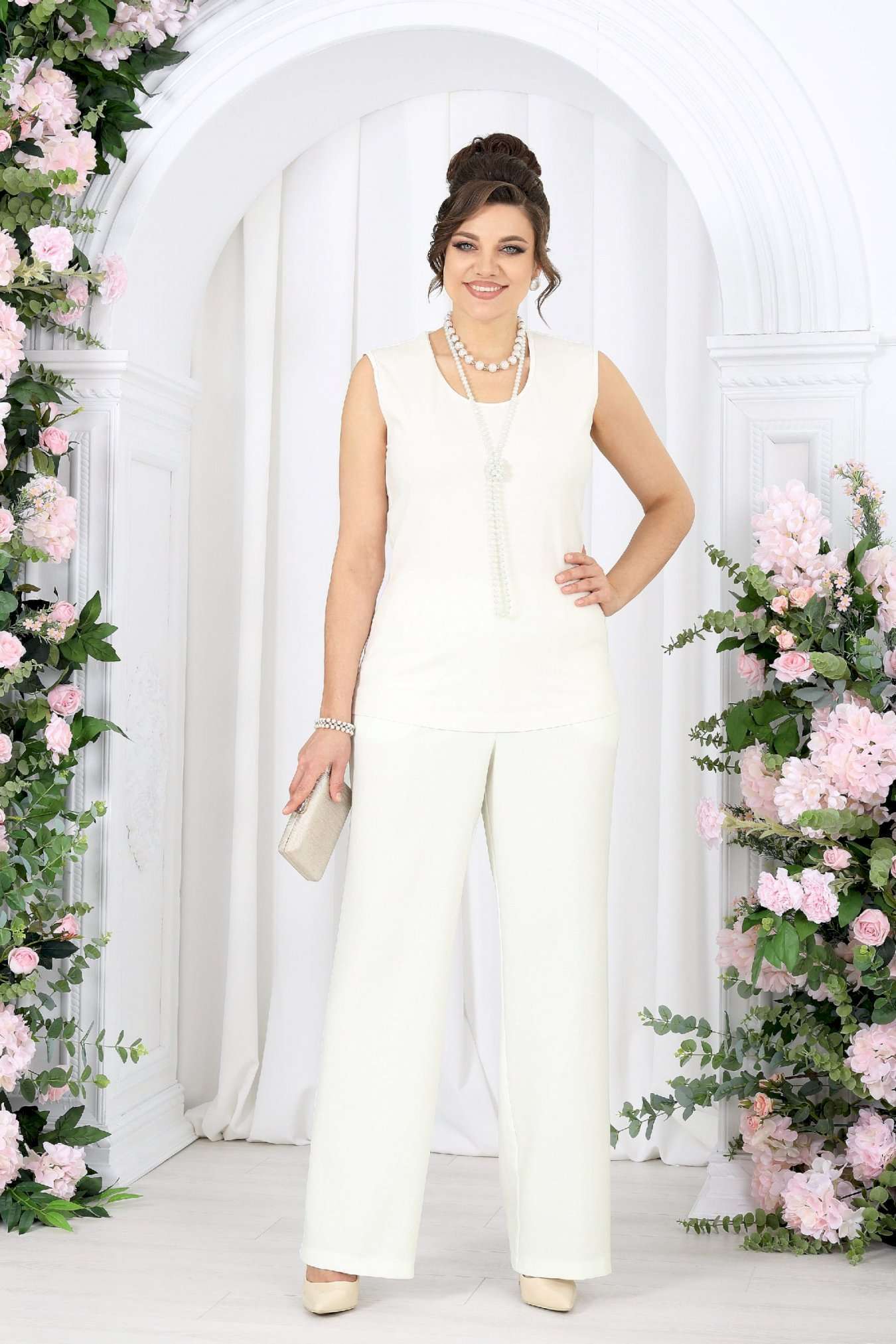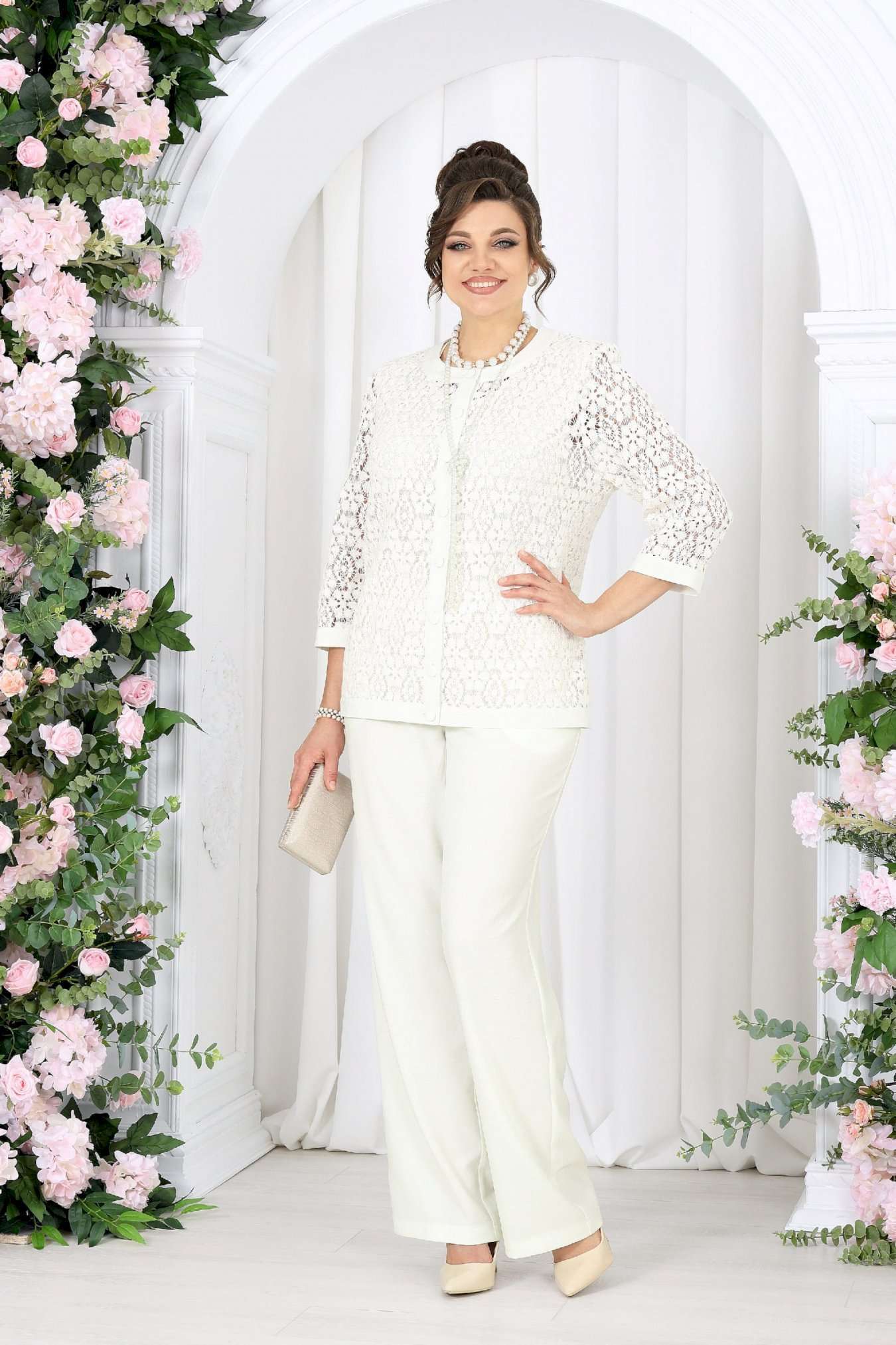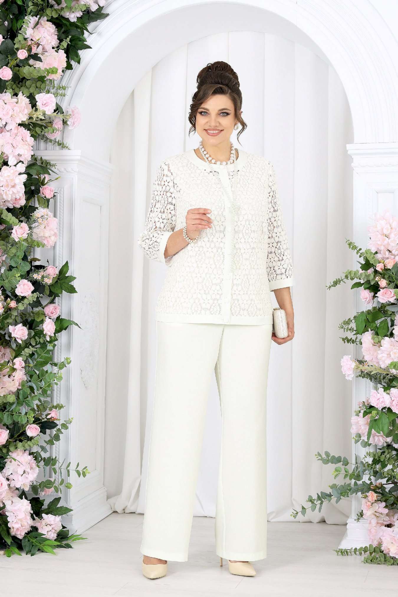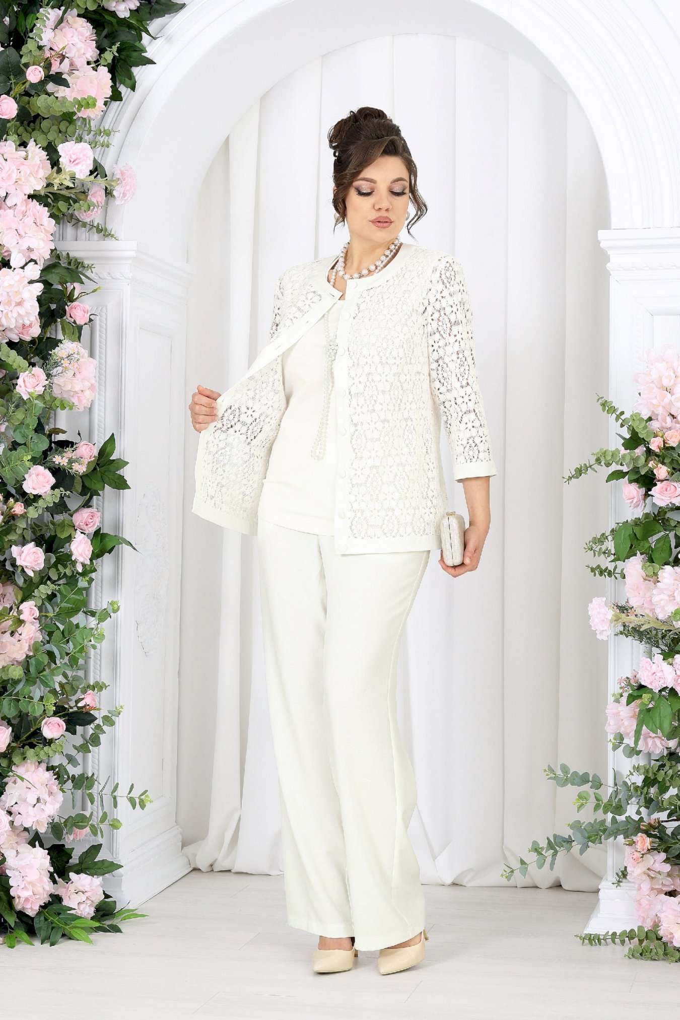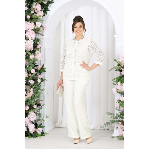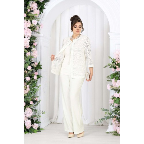 Брючный костюм 3 в 1 — утончённая элегантность на каждый день и особый случай. Этот костюм — как дыхание весны: светлый, воздушный, гармоничный. Он создан для женщины, которая выбирает не просто одежду, а настроение — легкое, уверенное и по-настоящему женственное. Кружевной жакет добавляет образу изысканности и глубины, словно тонкая работа мастера. Полупрозрачная фактура мягко играет на свету, подчеркивая деликатность и статус. Под ним — лаконичный джемпер из вискозного трикотажа, который дарит комфорт и ощущение уюта в течение всего дня. Брюки из ткани «лен-вишер» завершают образ — они держат форму, струятся при движении и создают тот самый эффект «дорогой простоты». Комплект брючный 3-х предметный, состоящий из жакета, джемпера и брюк. Жакет полуприлегающего силуэта, выполнен из кружева х/б. Модель без подкладки и без плечевых накладок. Перед с нагрудными вытачками, направленными от пройм вниз, и отрезной планкой по подборту и горловине. Жакет с центральной внешней застежкой на 8 петель и пуговиц (обтянутых основной тканью). Рукав 7/8, втачной с притачной замкнутой манжетой по низу. Низ жакета и горловина обработаны по низу притачной планкой из основной ткани. Длина жакета - 64 см (50-58 р-р); длина рукава – 45 см (50-58). Джемпер полуприлегающего силуэта, выполнен из вискозного трикотажного полотна. Горловина округлой формы, углубленная спереди. Срезы горловины и пройм окантованы косой бейкой. Длина джемпера –64 см. Брюки классические, с посадкой на талии, выполнены из ткани «лен-вишер». Модель без стрелок, с центральной застёжкой на тесьму-«молнию», на притачном поясе, застегивающемся на петлю и пуговицу. Задние половинки брюк с талиевыми вытачками, направленными от пояса вниз. По передним половинкам брюк застрочены складки-«защипы» по центру. Спереди обработаны боковые наклонные карманы. Для лучшего прилегания брюк в области талии в поясе по задним половинкам вставлена эластичная лента. Длина брюк по боковому (с поясом) – 107 см (50-58).