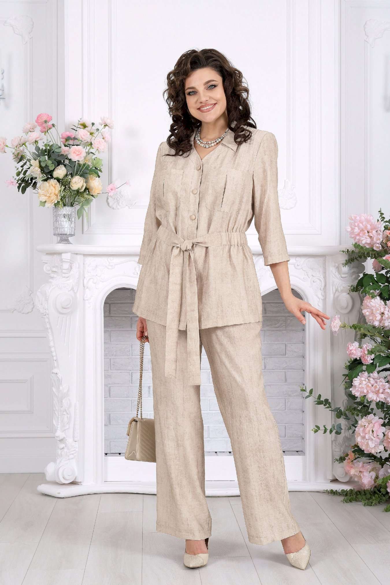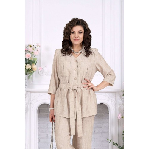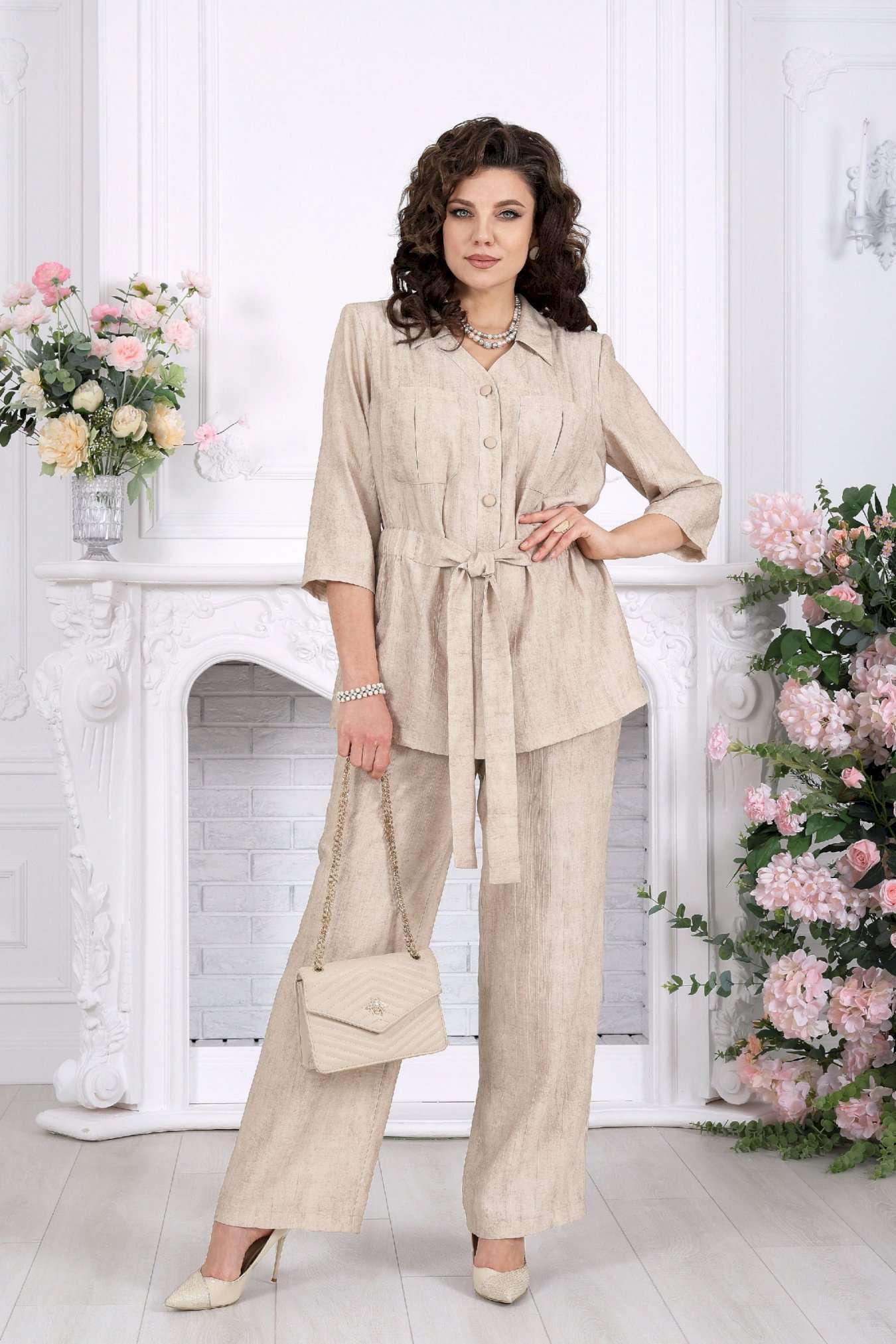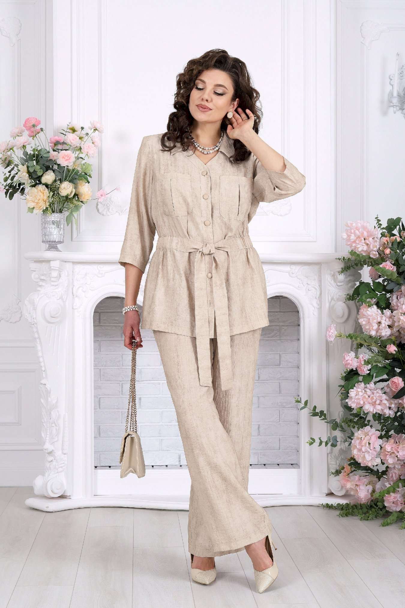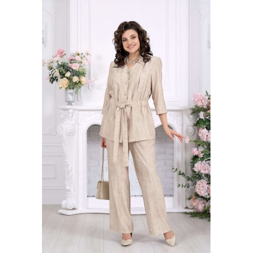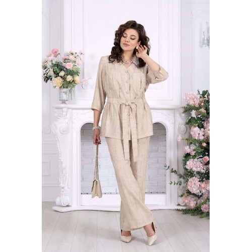 Брючный костюм — комфорт, который выглядит элегантно Этот комплект словно создан для тех дней, когда хочется выглядеть безупречно, не жертвуя удобством. Легкий, дышащий, пластичный — он мягко повторяет движения и подчеркивает естественную красоту силуэта. Блузка с аккуратным воротником и деликатной застежкой создает ощущение собранности и стиля, а пояс по линии талии позволяет подчеркнуть фигуру так, как хочется именно вам. Накладные карманы добавляют образу современности и легкой расслабленности. Брюки завершают комплект — прямые, струящиеся, они визуально вытягивают силуэт и дарят ощущение свободы в каждом шаге. Вискозное «крэш»-полотно — это баланс между натуральностью и практичностью. Оно легкое, дышащее, приятно к телу и не требует идеальной глажки, сохраняя эффект стильной фактурности. Комплект брючный 2-х предметный, состоящий из блузки и брюк. Блузка прямого силуэта, выполнена из вискозного полотна. Модель с втачным рукавом ¾ и плечевыми накладками. Перед с застежкой по притачной планке на 6 петель и 6 пуговиц. Горловина оформлена отложным воротником. Перед блузки с накладными карманами по линии груди. По линии талии спинки и частично переда с изнанки настрочена кулиса с широкой эластичной лентой внутри. По талии переда настрочен пояс. Длина блузки – 70 см (50-58 р-р); длина рукава (от горловины) – 44 см (50-52 р-р). Брюки длинные, прямого силуэта, с посадкой на талии, выполнены из вискозного полотна. Модель без стрелок, без застежки, с наклонными боковыми карманами, на притачном поясе с эластичной лентой внутри. Спереди обработаны наклонные боковые карманы. Длина брюк по боковому (с поясом) – 107 см (50-58 р-р).