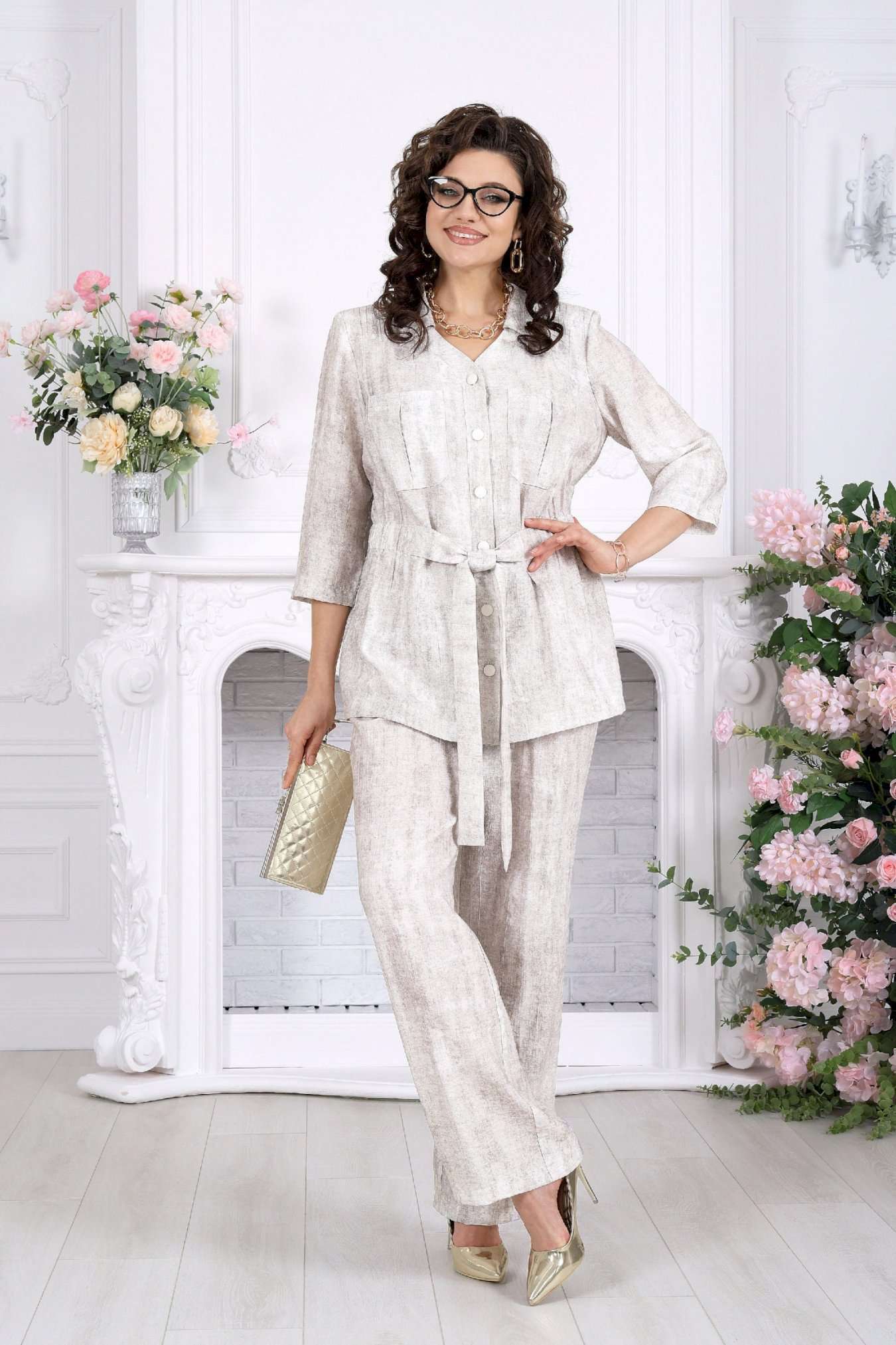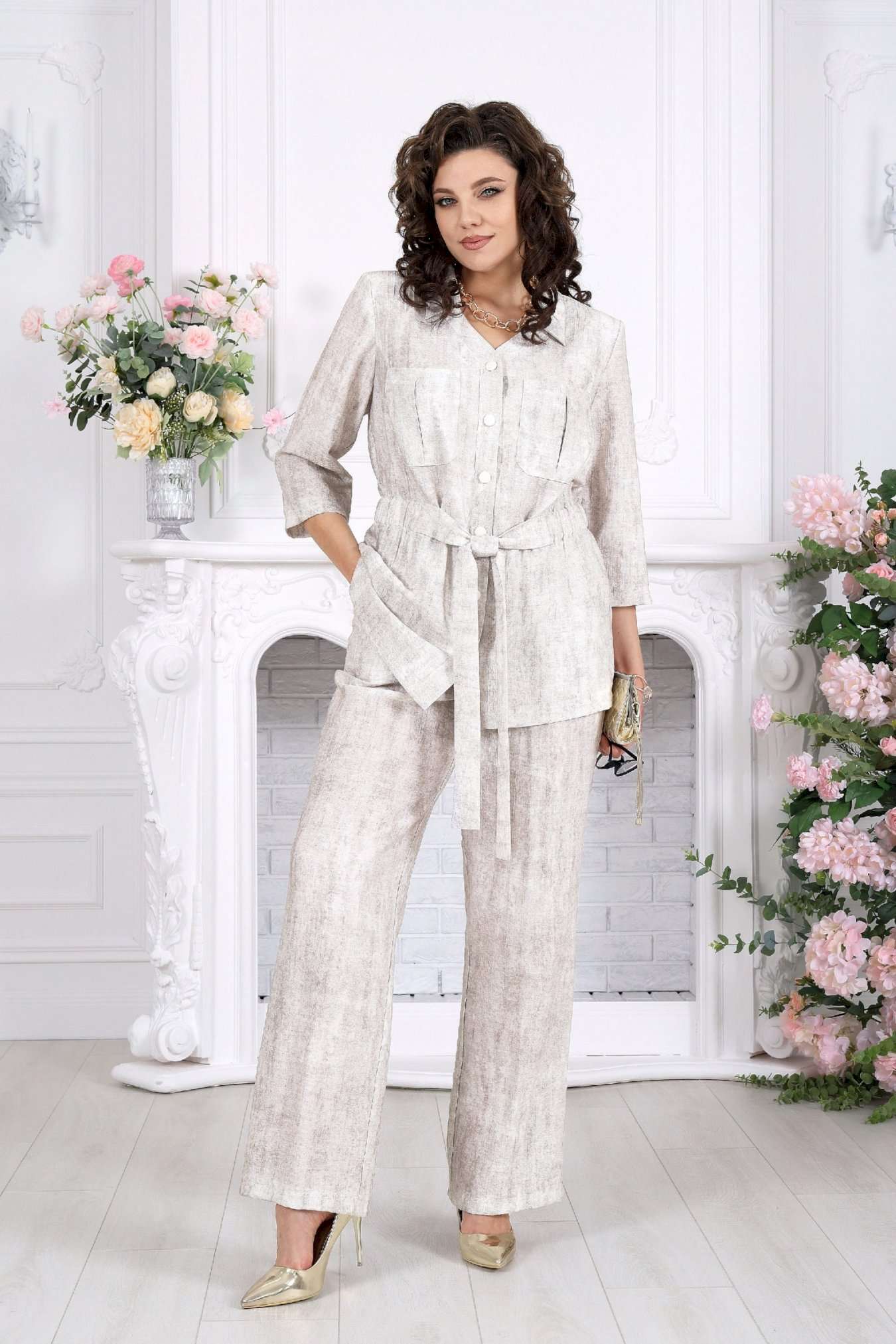 Брючный костюм — комфорт, который выглядит элегантно Этот комплект словно создан для тех дней, когда хочется выглядеть безупречно, не жертвуя удобством. Легкий, дышащий, пластичный — он мягко повторяет движения и подчеркивает естественную красоту силуэта. Блузка с аккуратным воротником и деликатной застежкой создает ощущение собранности и стиля, а пояс по линии талии позволяет подчеркнуть фигуру так, как хочется именно вам. Накладные карманы добавляют образу современности и легкой расслабленности. Брюки завершают комплект — прямые, струящиеся, они визуально вытягивают силуэт и дарят ощущение свободы в каждом шаге. Вискозное «крэш»-полотно — это баланс между натуральностью и практичностью. Оно легкое, дышащее, приятно к телу и не требует идеальной глажки, сохраняя эффект стильной фактурности. Комплект брючный 2-х предметный, состоящий из блузки и брюк. Блузка прямого силуэта, выполнена из вискозного полотна. Модель с втачным рукавом ¾ и плечевыми накладками. Перед с застежкой по притачной планке на 6 петель и 6 пуговиц. Горловина оформлена отложным воротником. Перед блузки с накладными карманами по линии груди. По линии талии спинки и частично переда с изнанки настрочена кулиса с широкой эластичной лентой внутри. По талии переда настрочен пояс. Длина блузки – 70 см (50-58 р-р); длина рукава (от горловины) – 44 см (50-52 р-р). Брюки длинные, прямого силуэта, с посадкой на талии, выполнены из вискозного полотна. Модель без стрелок, без застежки, с наклонными боковыми карманами, на притачном поясе с эластичной лентой внутри. Спереди обработаны наклонные боковые карманы. Длина брюк по боковому (с поясом) – 107 см (50-58 р-р).