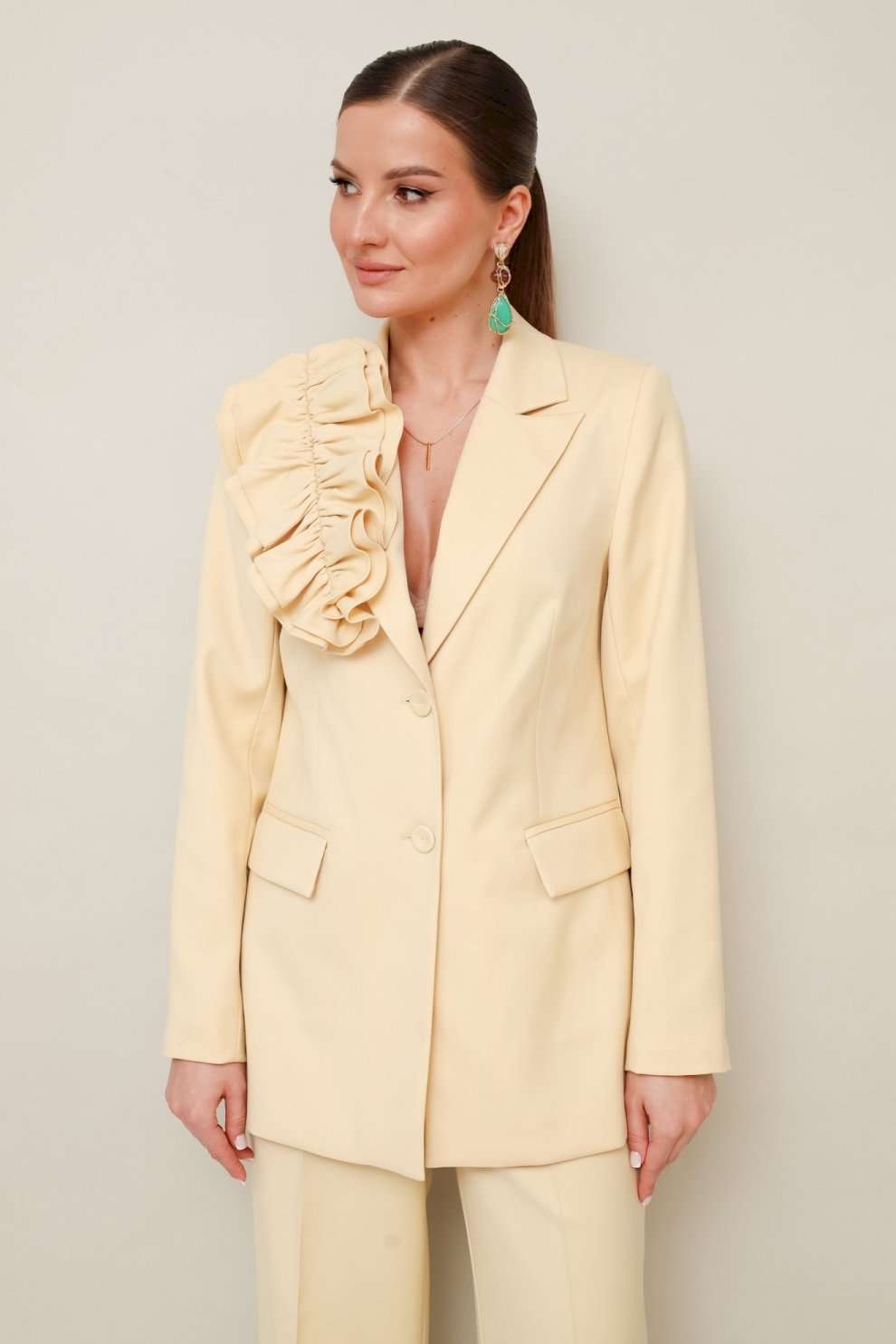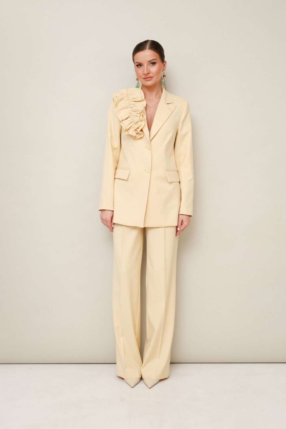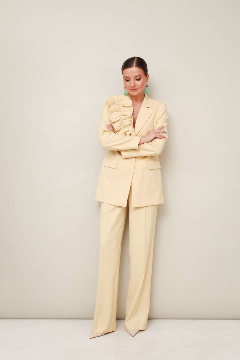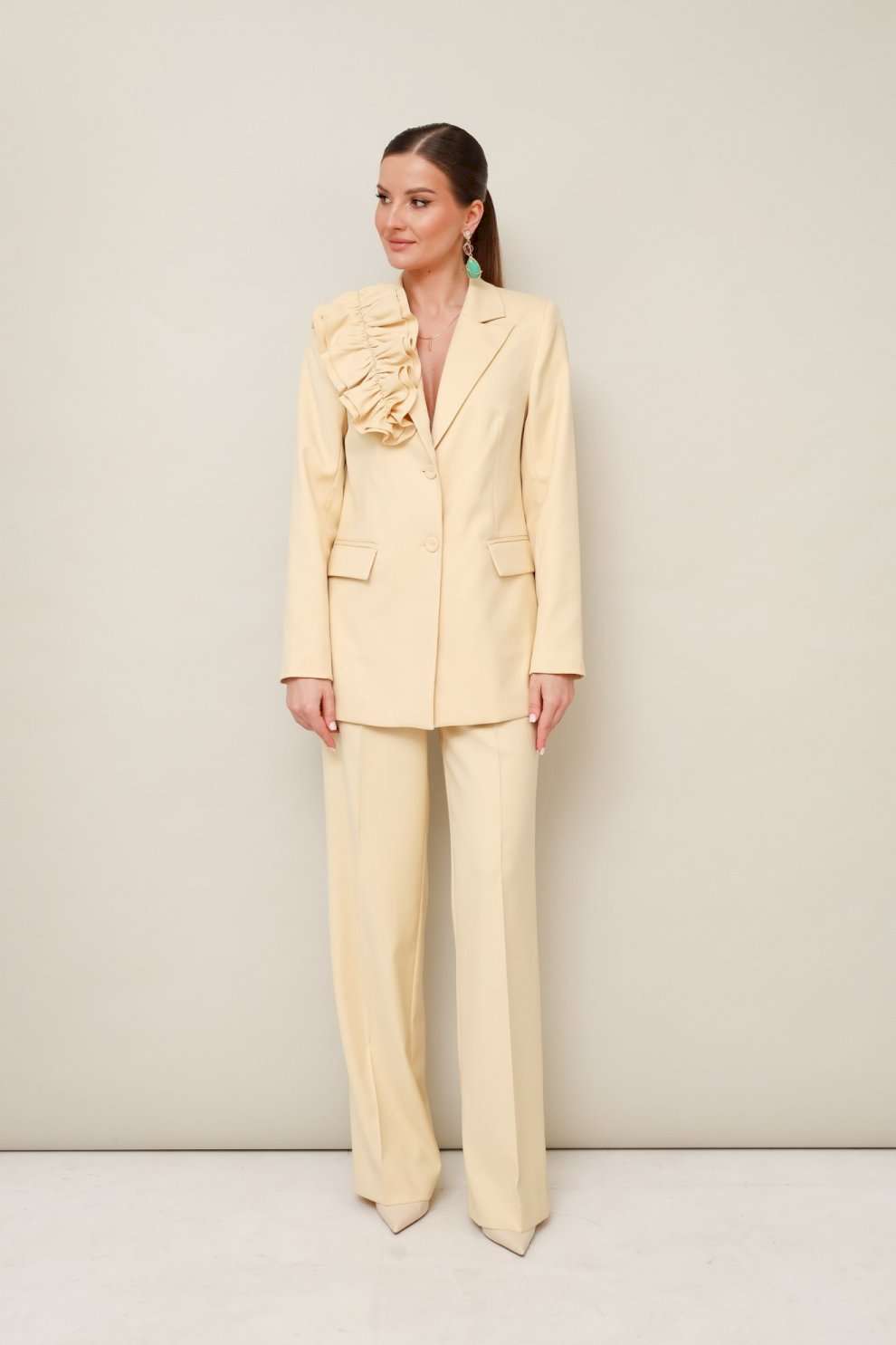 Костюм брючный 11-307-9 Pur Pur сочетает в себе элегантность и практичность. Коллекция бренда Pur Pur предлагает стильный костюм из костюмной ткани, состоящий из жакета и брюк. Жакет полуприлегающего силуэта снабжен центральной застежкой на петли с обтяжными пуговицами и отложными лацканами, а также прорезными карманами с клапанами, позволяющими создать элегантный образ. Брюки прямого кроя с заутюженными стрелками и наклонными карманами дополняют ансамбль. Притачной пояс с застежкой на пуговицу дополнен эластичной вставкой для комфортного ношения. Съемная брошь из основной ткани добавляет изюминку к наряду. Материал из полиэстера, вискозы и спандекса обеспечивает комфорт и легкость. Подкладка жакета гарантирует теплый сезонный комфорт и стильный вид. Современный синий цвет добавляет свежесть и универсальность, подходящую для офисного стиля и прогулок.