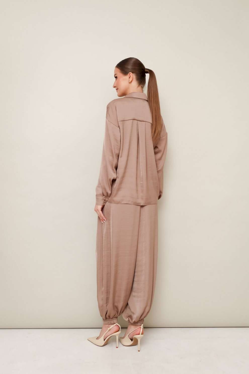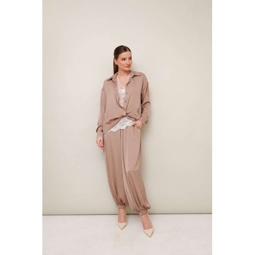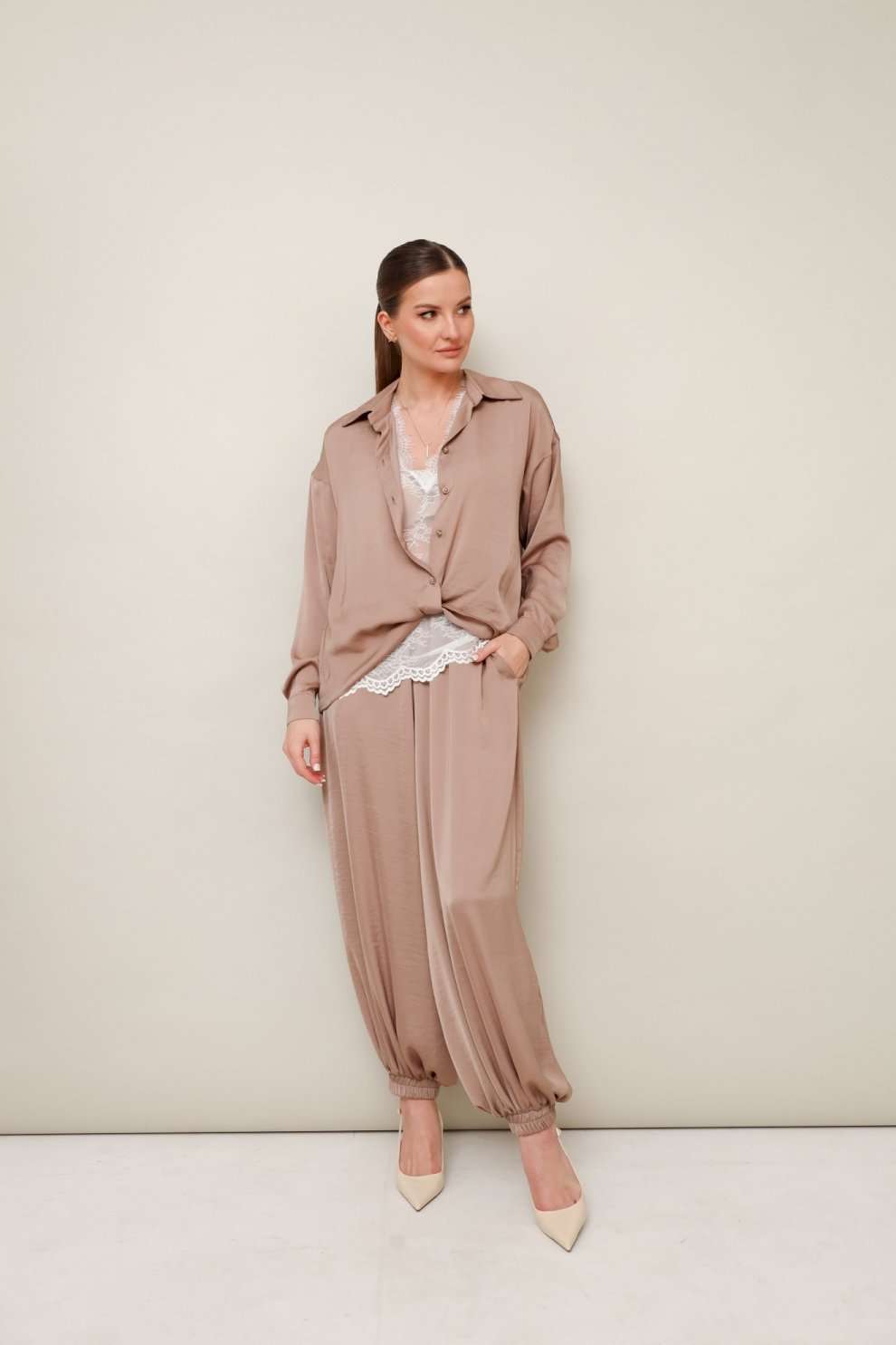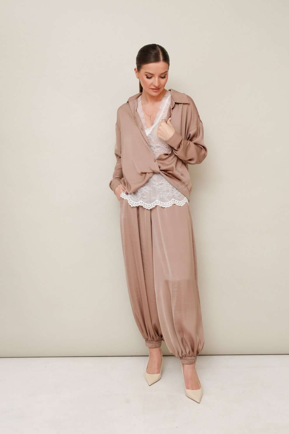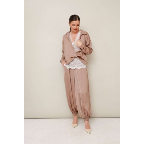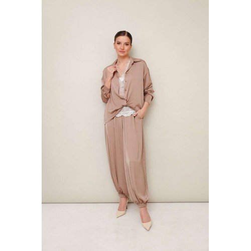 Костюм брючный 11-463-1 Pur Pur предлагает уникальное сочетание стиля и комфорта. Коллекция бренда Pur Pur включает в себя трехпредметный комплект: топ, блузку и брюки-алладины. Этот костюм выполнен из лёгких материалов, таких как полиэстер и спандекс, обеспечивая комфорт и легкость при носке. Элегантная блузка с рубашечным воротником и декоративным перекрутом подойдёт для офиса или повседневных встреч. Французское кружево топа придаёт образу изысканность, а свободные брюки-алладины с манжетами на резинке создают неповторимый стиль. Бежевый цвет костюма делает его универсальным выбором для различных сезонов и событий.