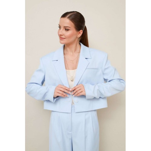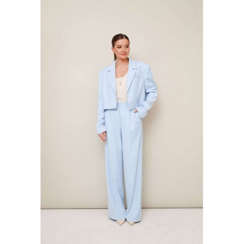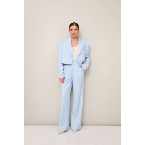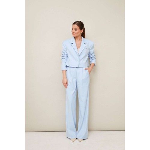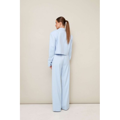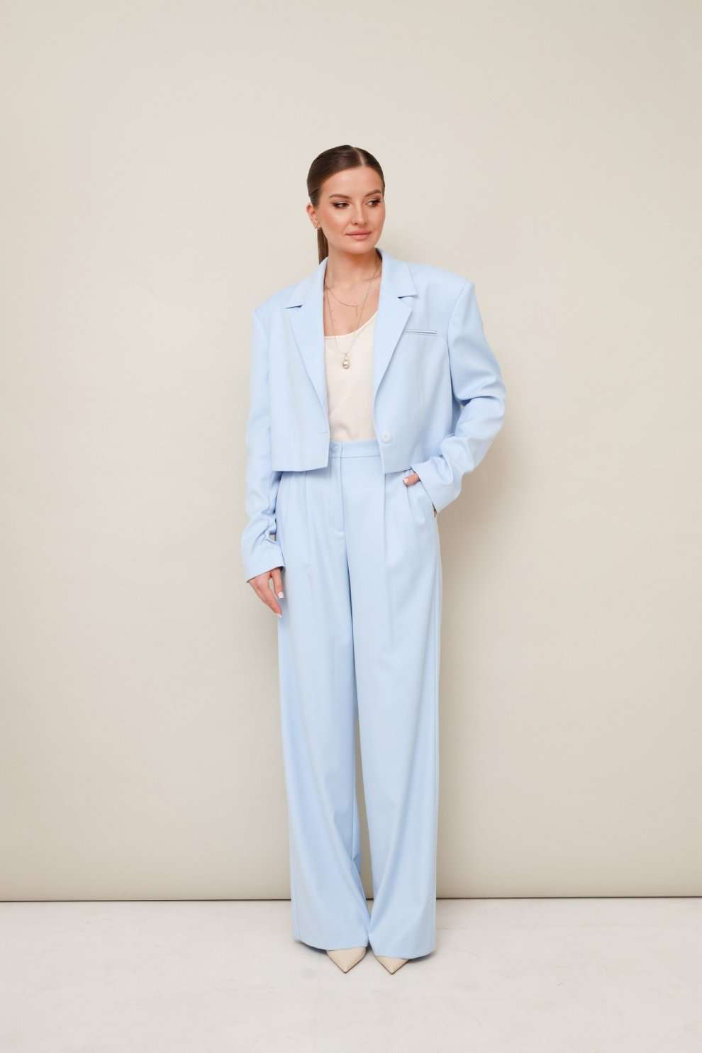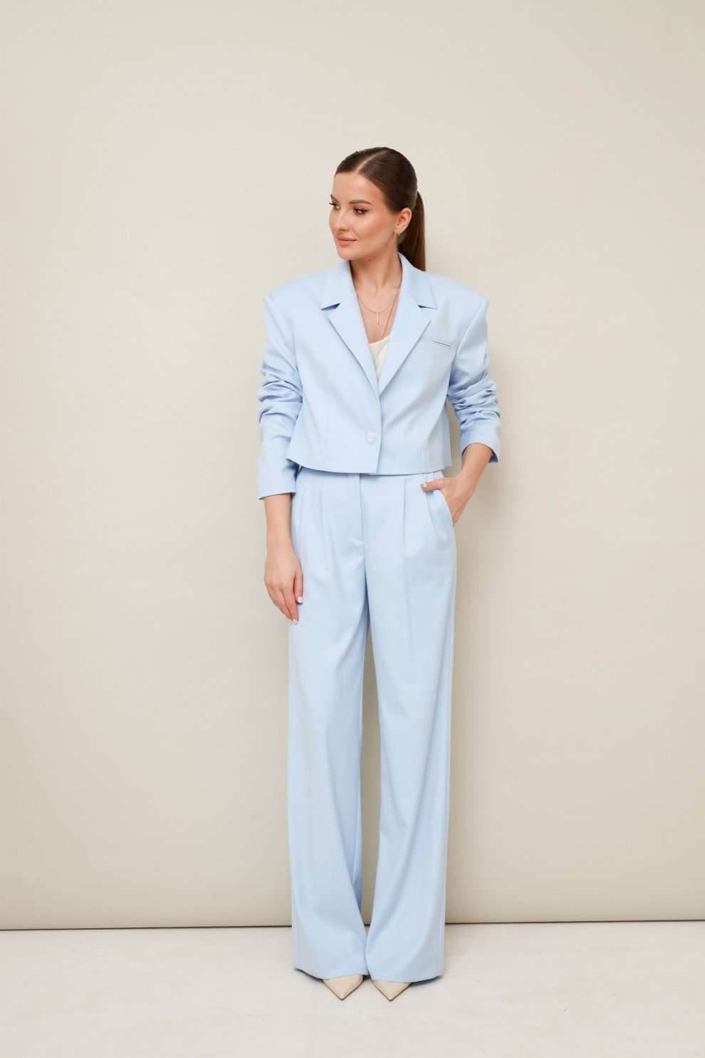 Костюм брючный 11-476 Pur Pur станет идеальным дополнением вашего гардероба. Коллекция бренда Pur Pur включает этот стильный брючный костюм из костюмной ткани, сочетание полиэстера, вискозы и спандекса обеспечивает комфорт и свободное движение. Актуальный укороченный жакет с отложными лацканами и прорезным карманом в рамку создают современный образ. Брюки с высокой посадкой и защипами предлагают дополнительный комфорт благодаря регулируемому эластичному поясу. Голубой цвет костюма идеально подходит для весны и лета, делая его универсальным выбором для офисного или повседневного стиля. Центральная застёжка на петлю и пуговицу подчеркивает внимание к деталям, а легкая сборка внизу рукавов добавляет элегантности.