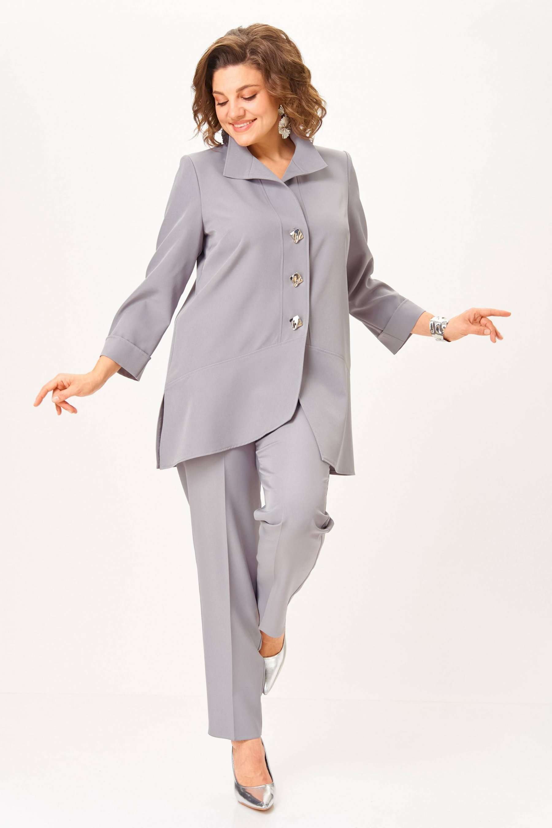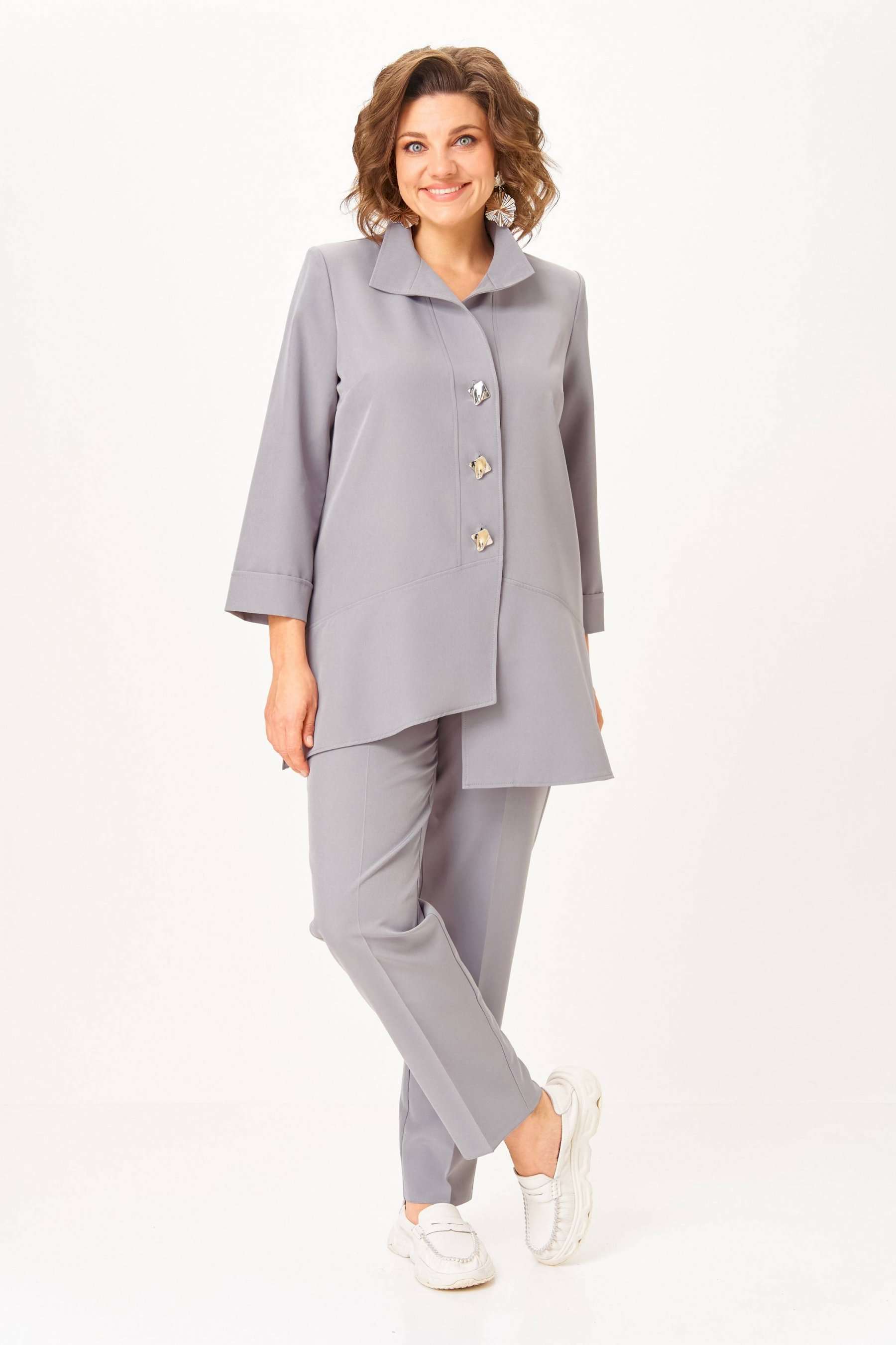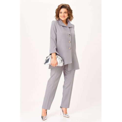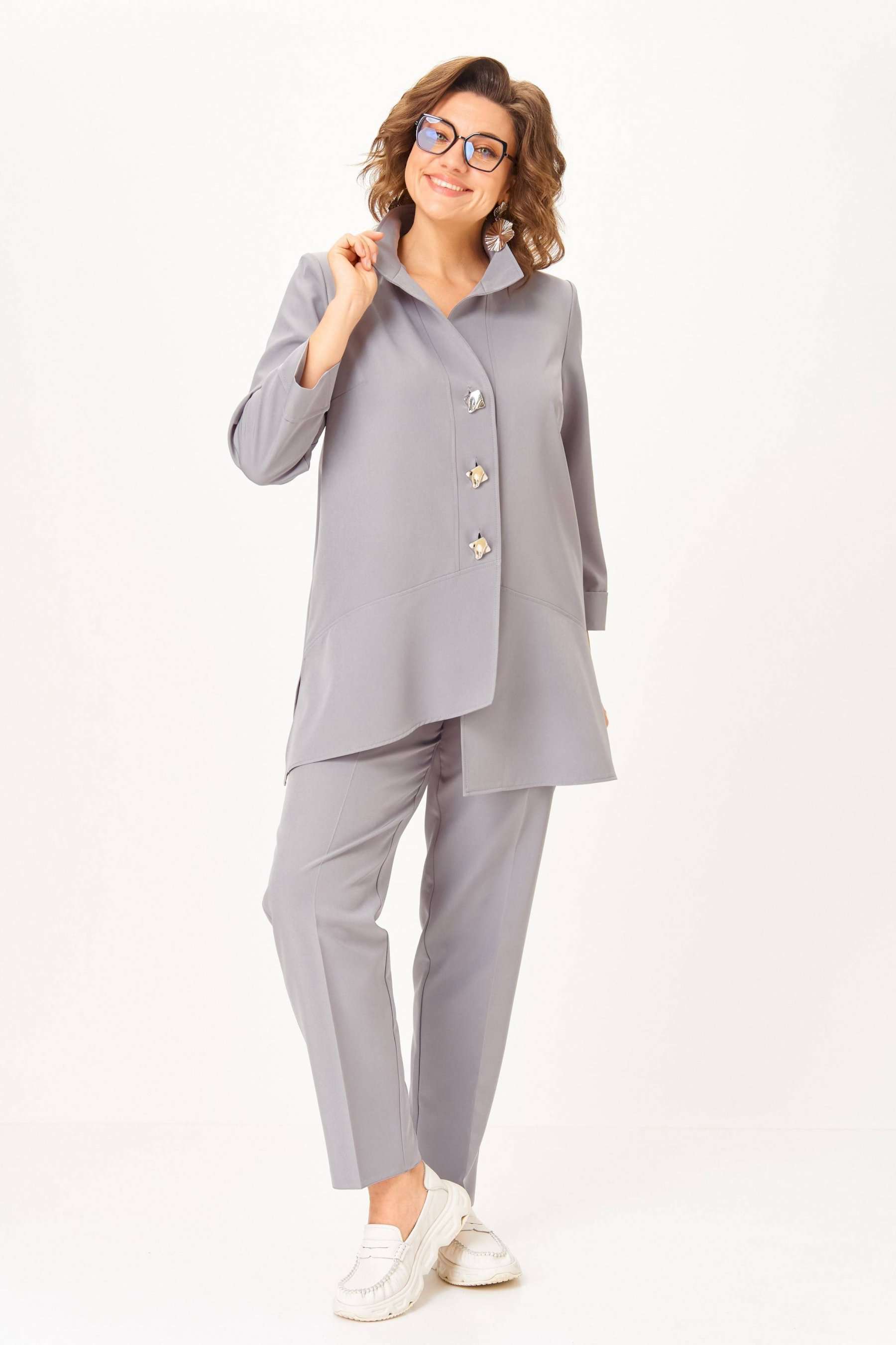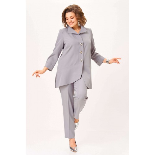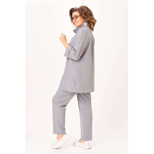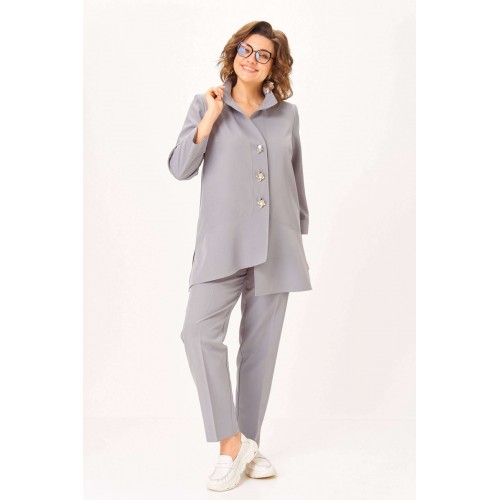 Комплект женский, состоящий из туники и брюк. Туника А-образного силуэта с центральной застежкой на планку до подреза на 3 декоративные петли-пуговицы. Перед с нагрудной вытачкой и фигурными подрезами. Спинка с горизонтальной кокеткой и двумя складками. В боковых швах обработаны разрезы. Низ переда ассиметричен и слегка разведен. Рукава втачные одношовные длиной 3/4 с защипом, имитирующим манжет. Воротник-стойка. Брюки классического кроя, зауженные к низу с притачным поясом сзади на резинке. Застежка на тесьму-молнию в среднем шве передних половинок и 1 петлю-пуговицу по поясу. На брюках заутюжены канты.
