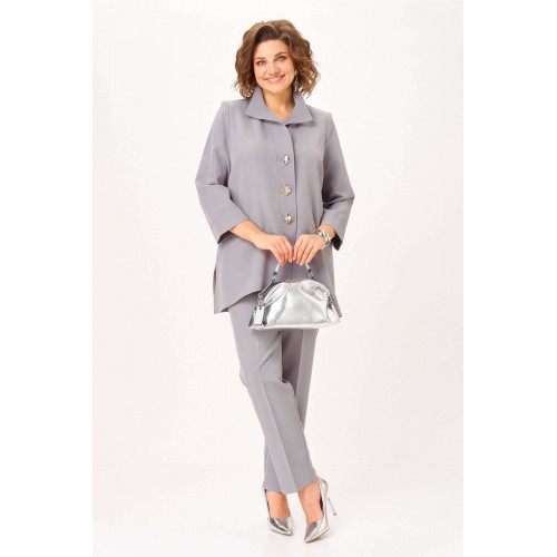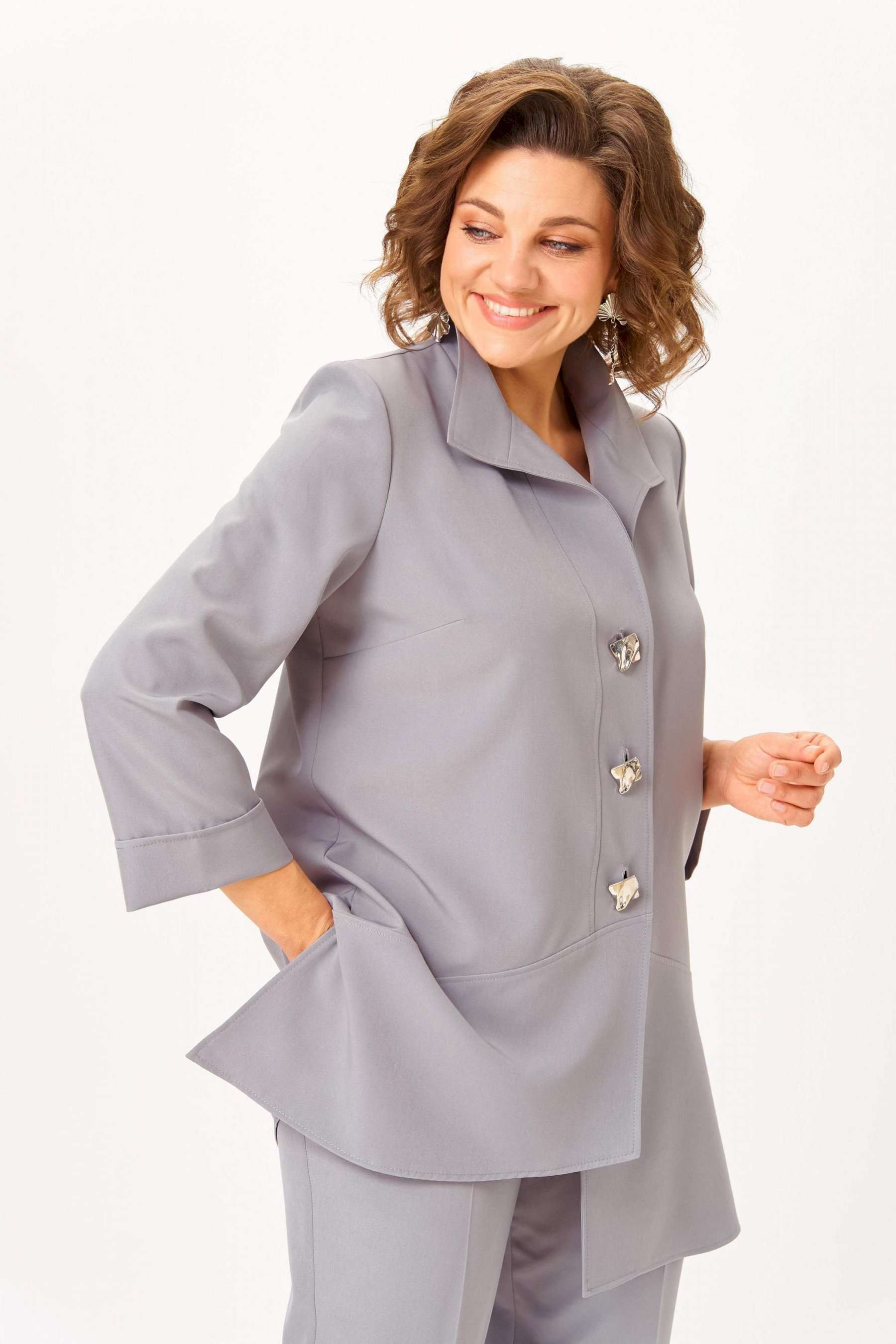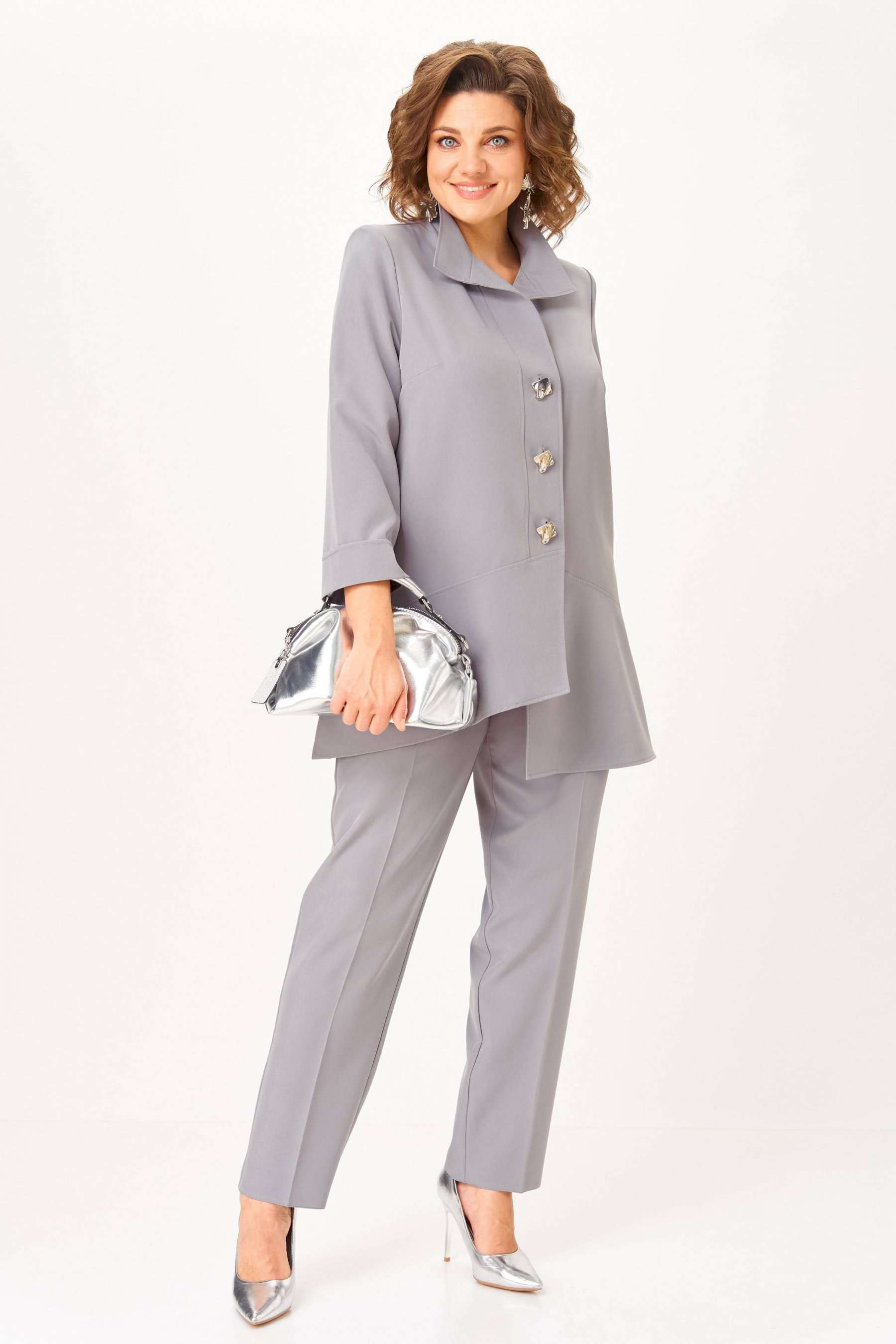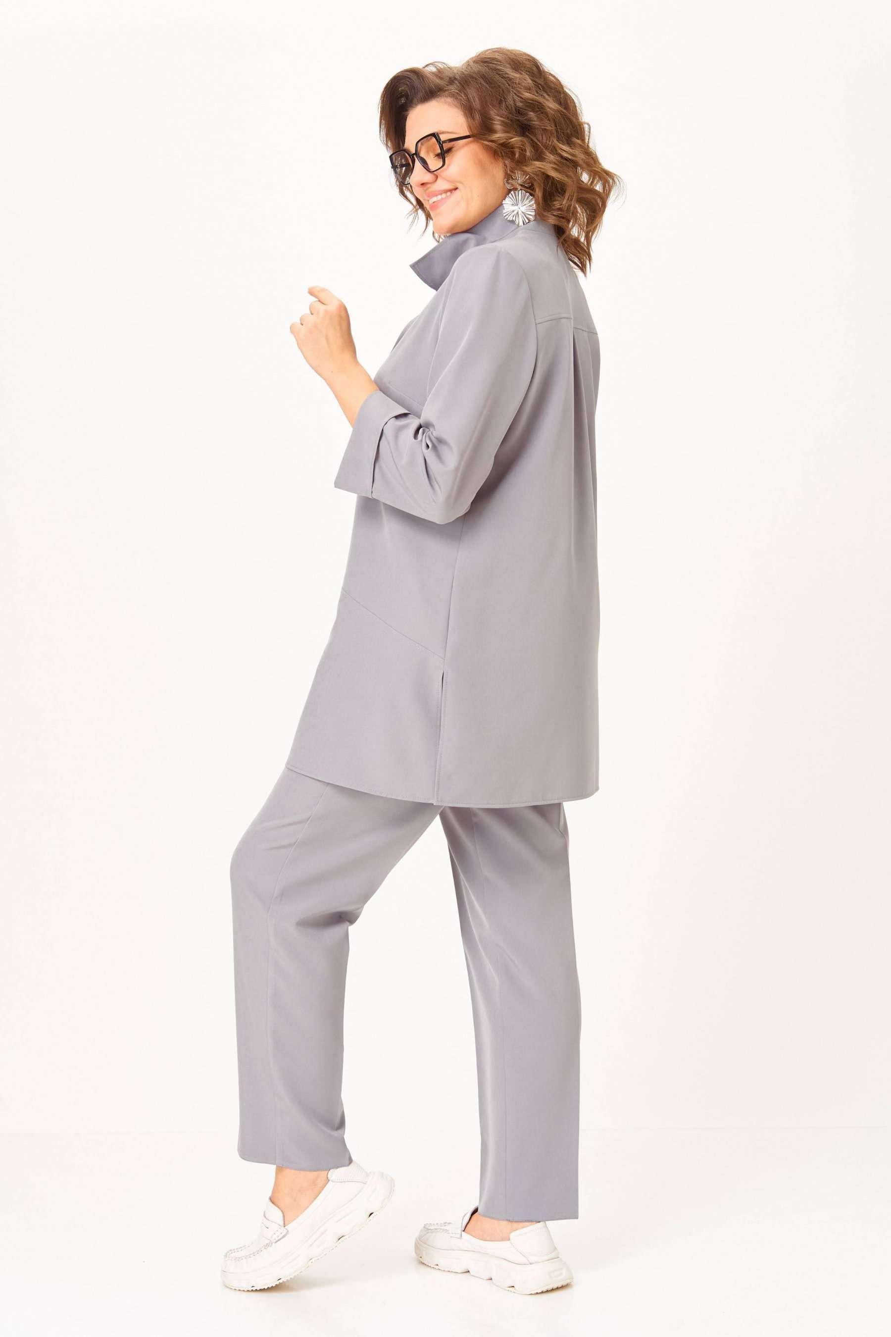 Комплект женский, состоящий из туники и брюк. Туника А-образного силуэта с центральной застежкой на планку до подреза на 3 декоративные петли-пуговицы. Перед с нагрудной вытачкой и фигурными подрезами. Спинка с горизонтальной кокеткой и двумя складками. В боковых швах обработаны разрезы. Низ переда ассиметричен и слегка разведен. Рукава втачные одношовные длиной 3/4 с защипом, имитирующим манжет. Воротник-стойка. Брюки классического кроя, зауженные к низу с притачным поясом сзади на резинке. Застежка на тесьму-молнию в среднем шве передних половинок и 1 петлю-пуговицу по поясу. На брюках заутюжены канты.