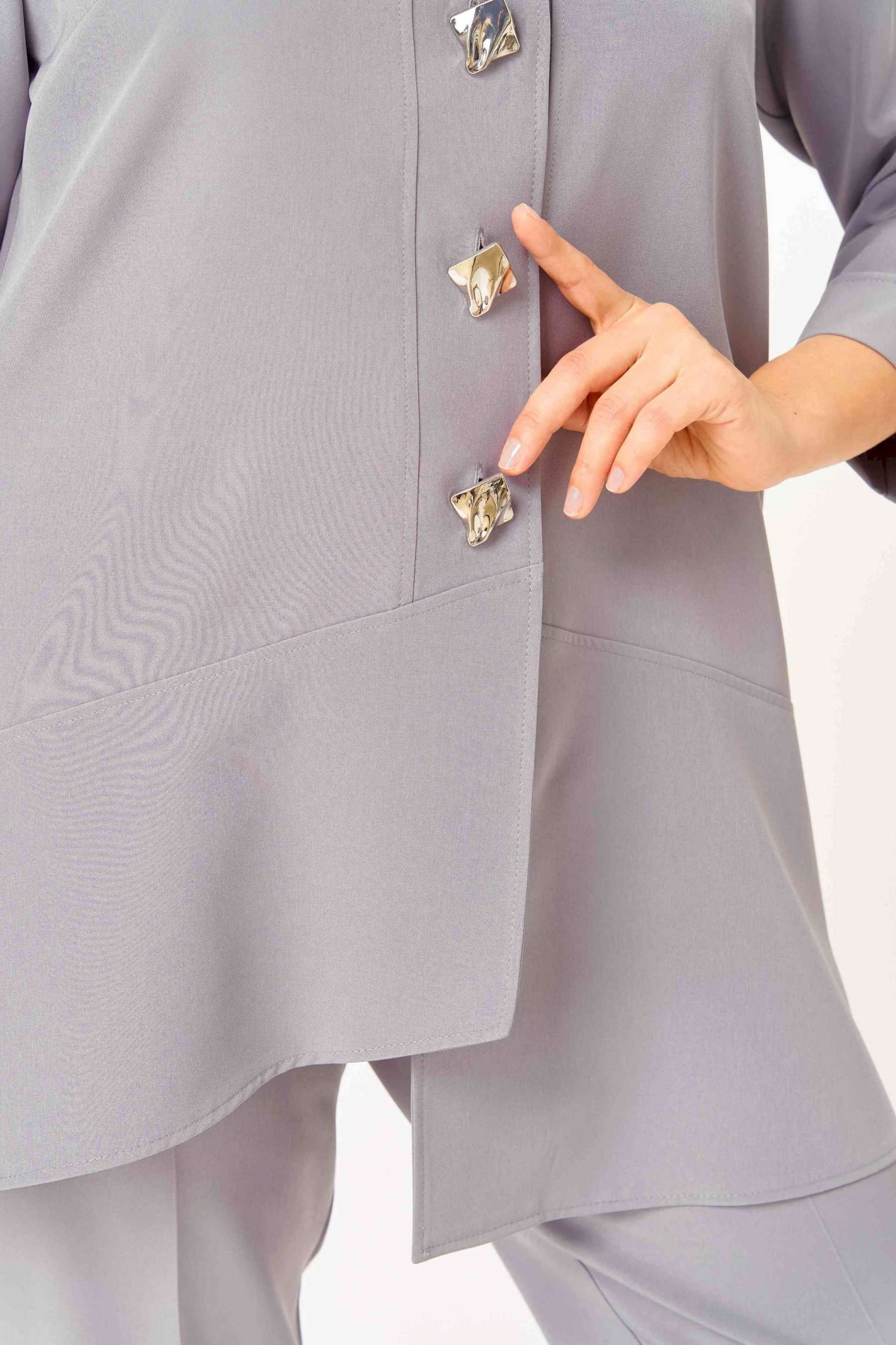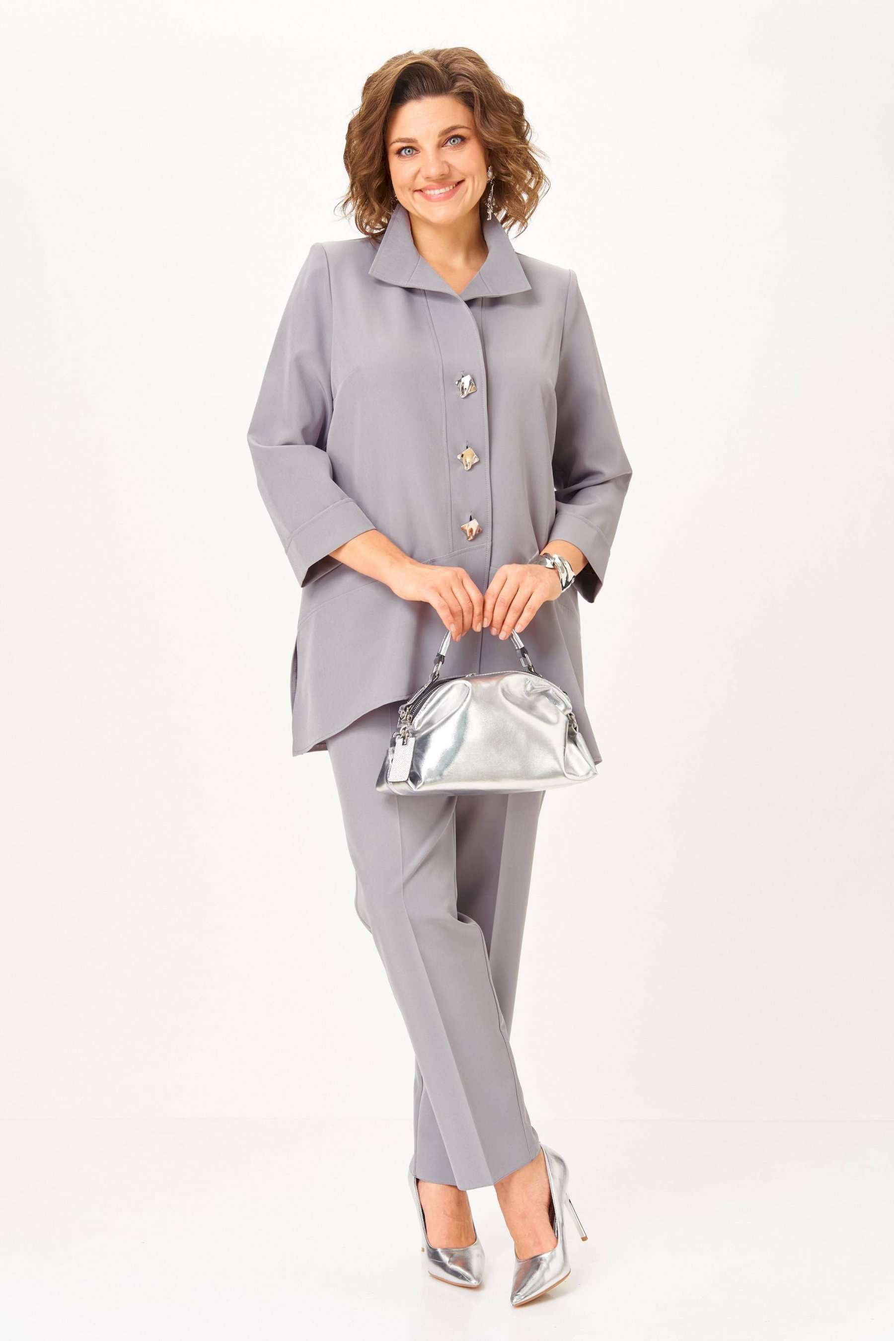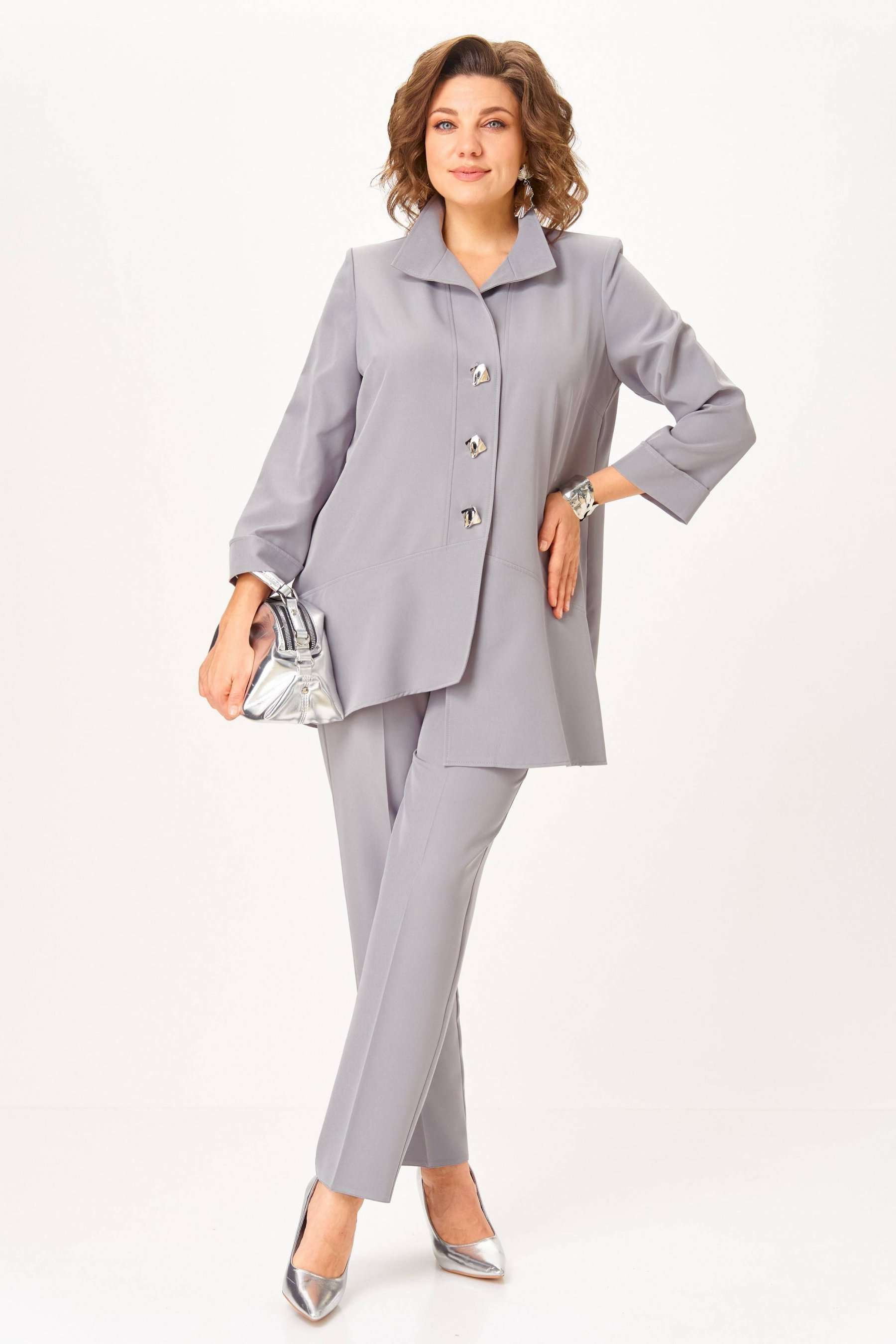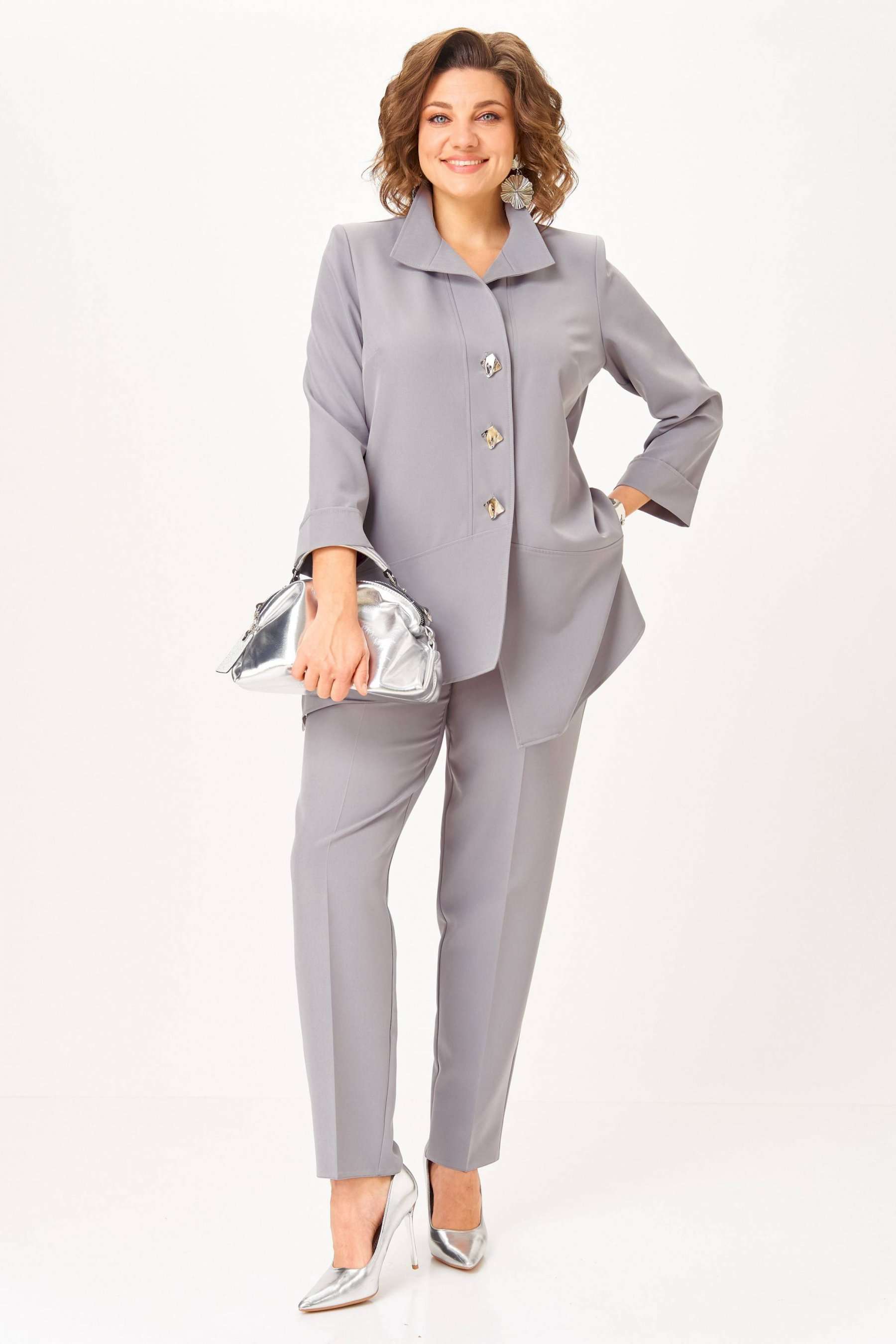 Комплект женский, состоящий из туники и брюк. Туника А-образного силуэта с центральной застежкой на планку до подреза на 3 декоративные петли-пуговицы. Перед с нагрудной вытачкой и фигурными подрезами. Спинка с горизонтальной кокеткой и двумя складками. В боковых швах обработаны разрезы. Низ переда ассиметричен и слегка разведен. Рукава втачные одношовные длиной 3/4 с защипом, имитирующим манжет. Воротник-стойка. Брюки классического кроя, зауженные к низу с притачным поясом сзади на резинке. Застежка на тесьму-молнию в среднем шве передних половинок и 1 петлю-пуговицу по поясу. На брюках заутюжены канты.